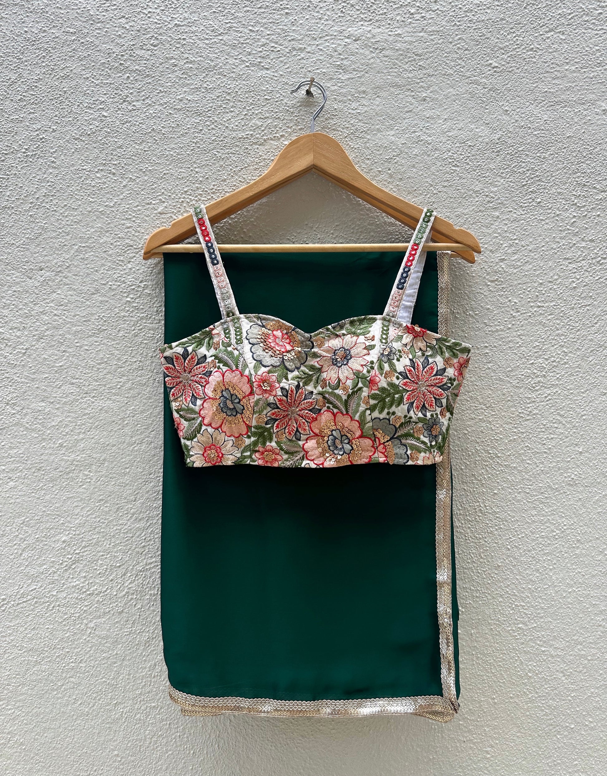 Emerald green satin georgette sari with a textured gold border paired with the PRITAM blouse fully tailored and ready to wear.