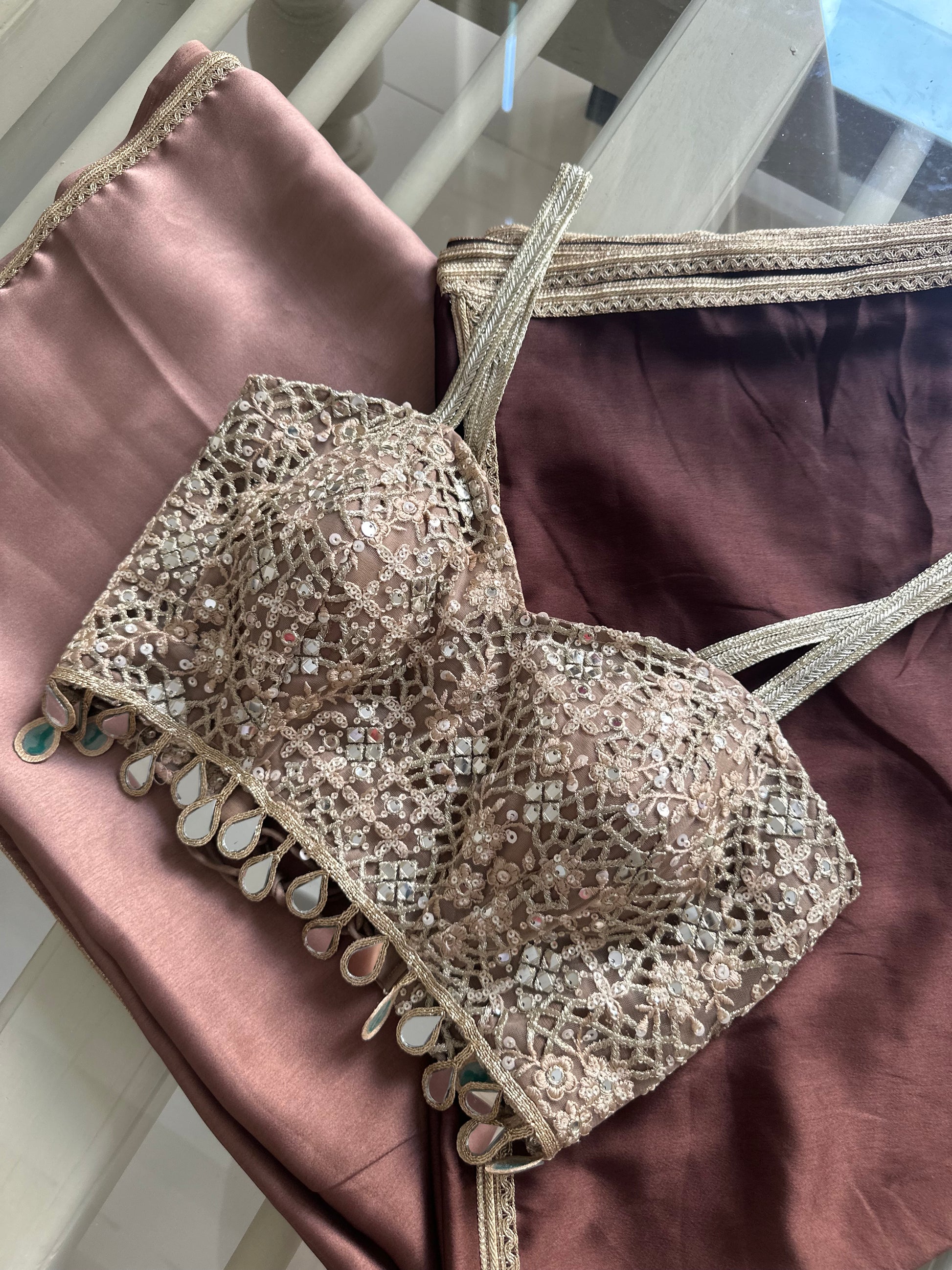 The blouse is the feature on this look. The cut work heavily embroidered fully gold sequin embelished blouse is truly a vision. It’s so beautifully embroidered in a floral design.