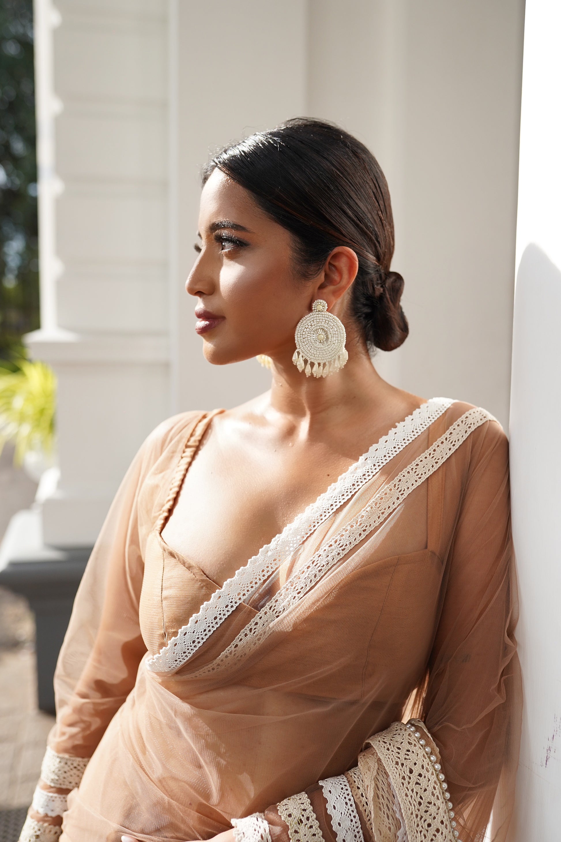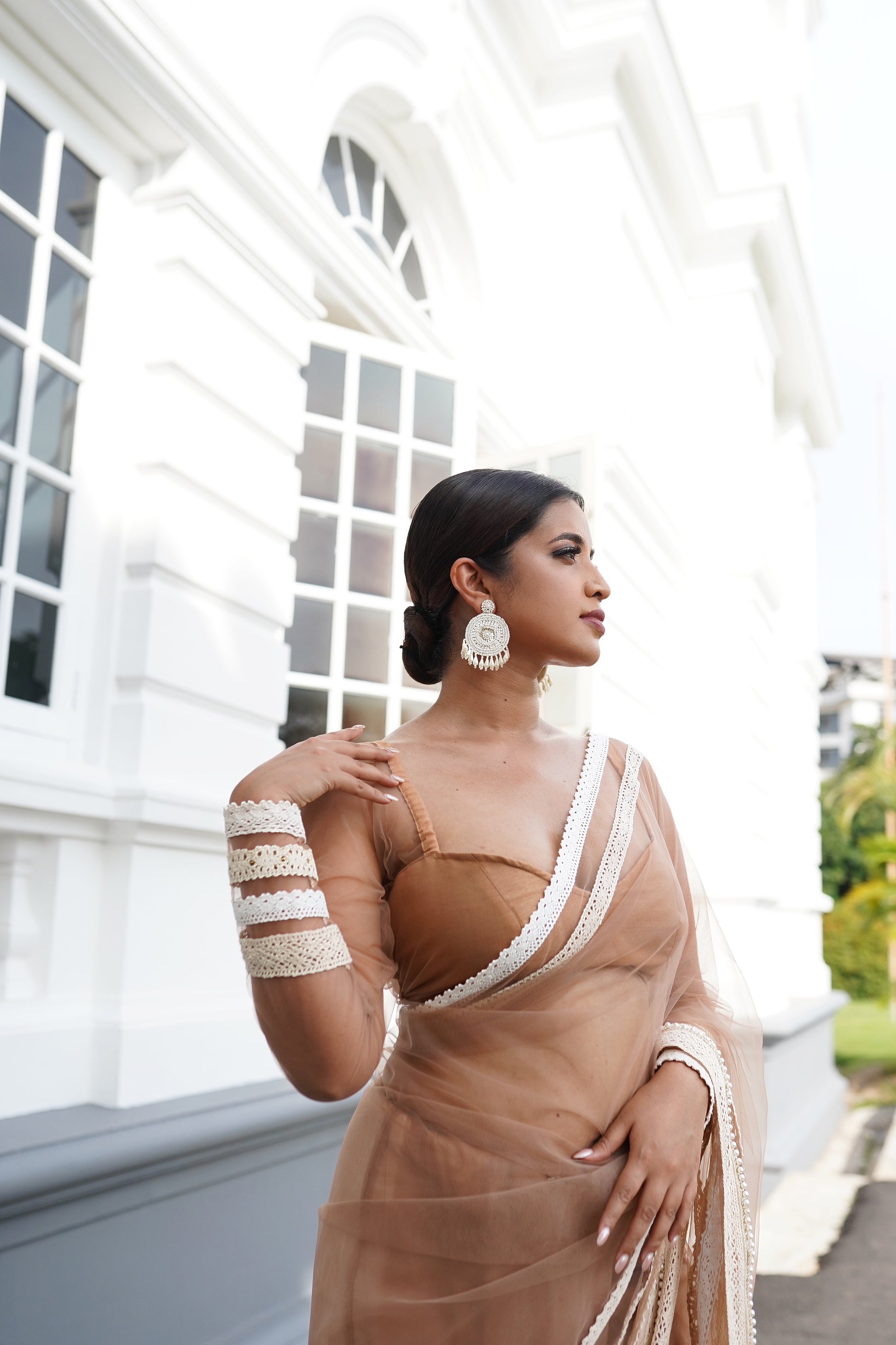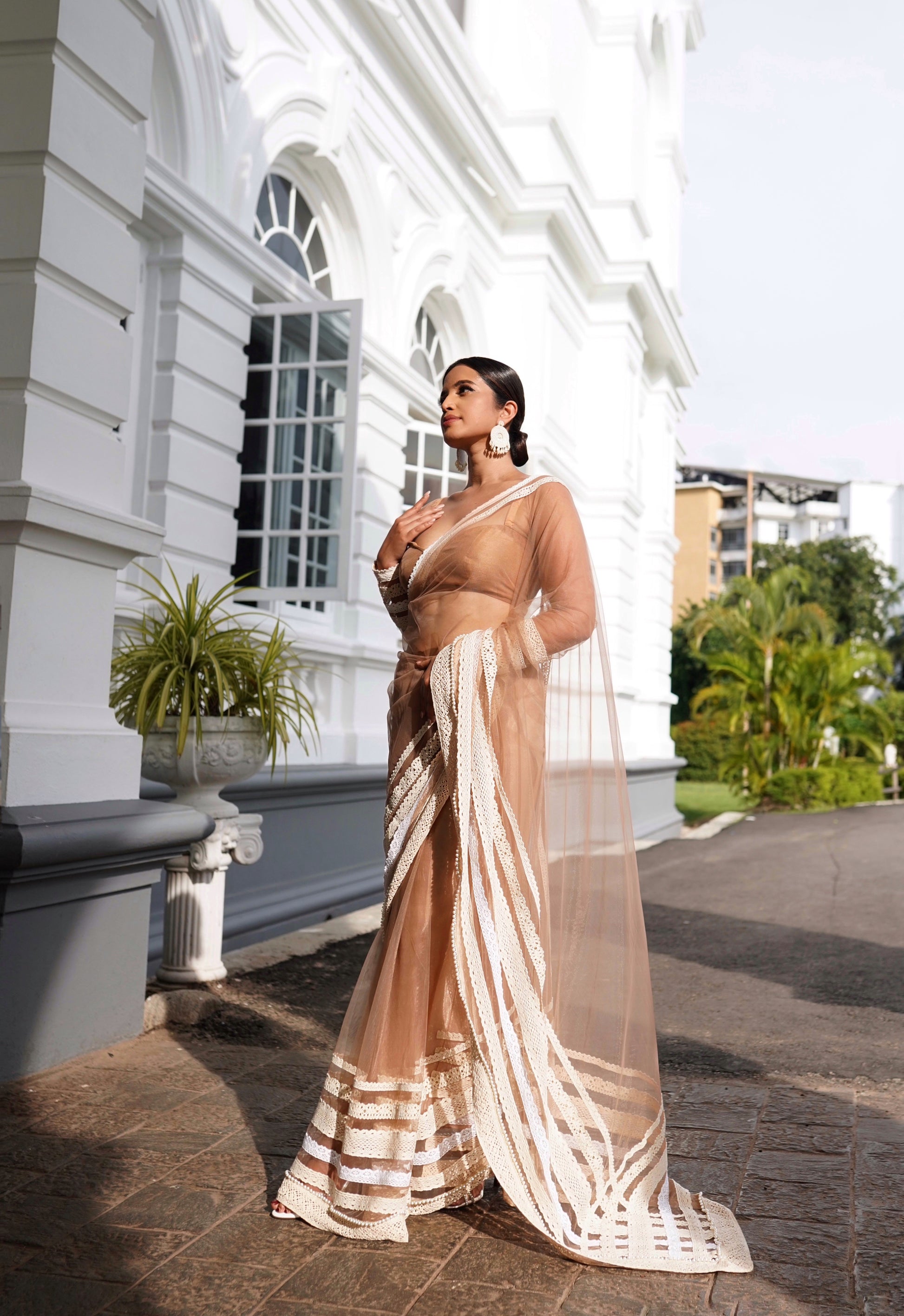 Vintage ceylon sari is the ultimate beauty wrapped in traditional artisan workmanship. This beeralu lace embellished soft net is an amalgamation of the old and the new. We’ve added pearl accents to the sari to elevate it further. The blouse is a silk brocade in a deep gold and ivory. Many man hours behind the creation of this piece and we couldn’t be more excited to share this look with you!