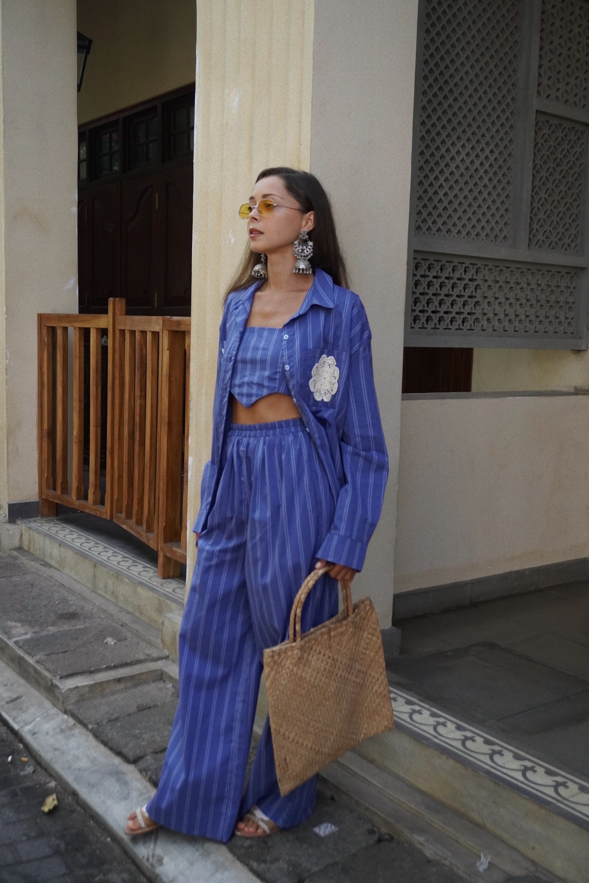 Blue stripe cotton pants with elasticated waist and pockets. Comfy, elevated and timeless. We love the crisp tailoring of this look.