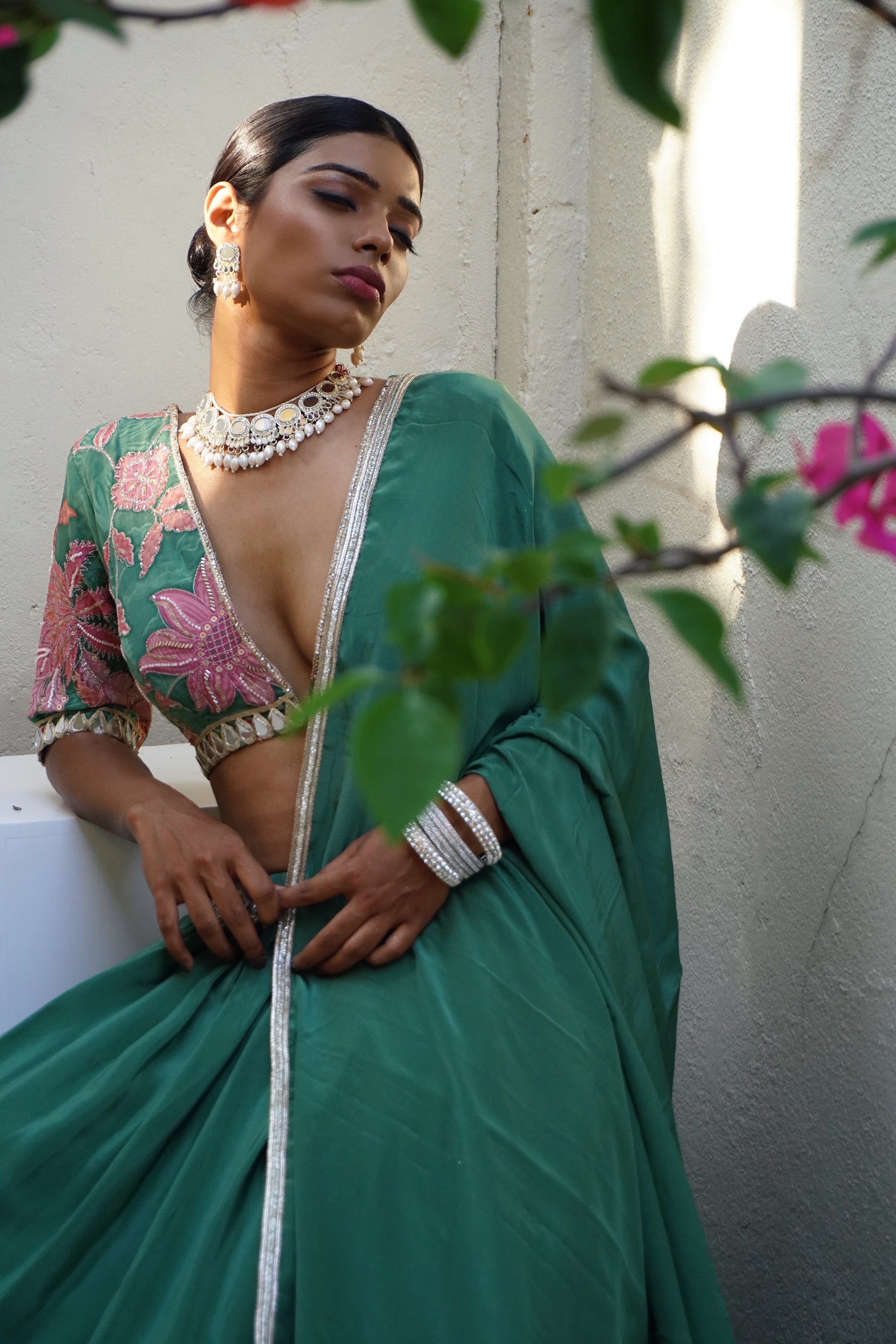 The deep sage green beauty is a pure silk crepe lehenga set with hand worked mirror details.