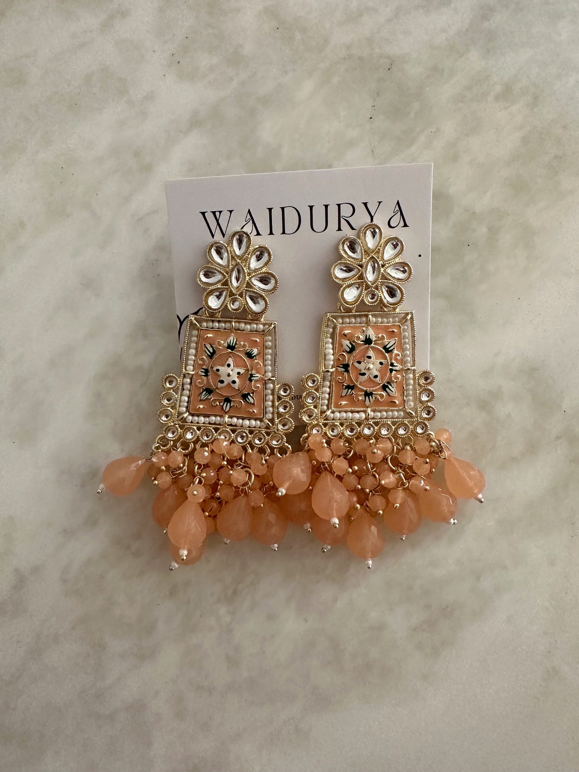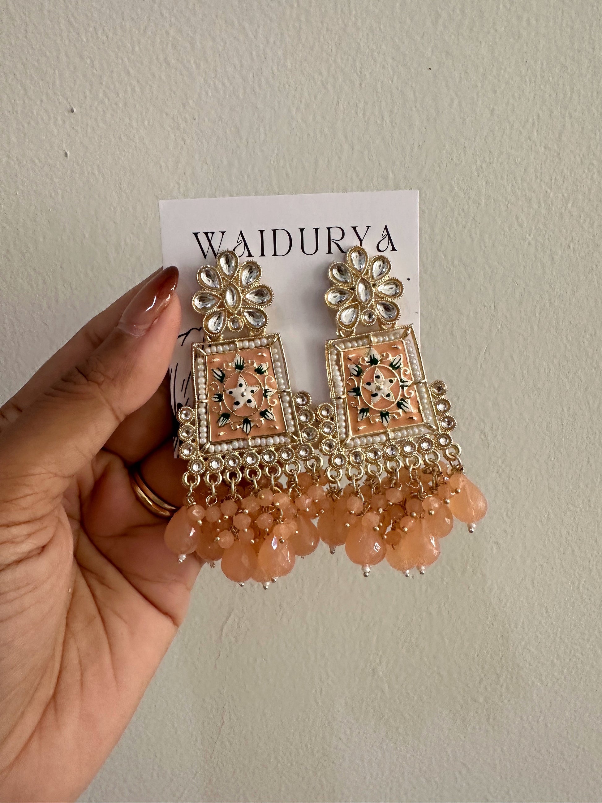 Pearl color enamel worked chandeliers with peach drops.