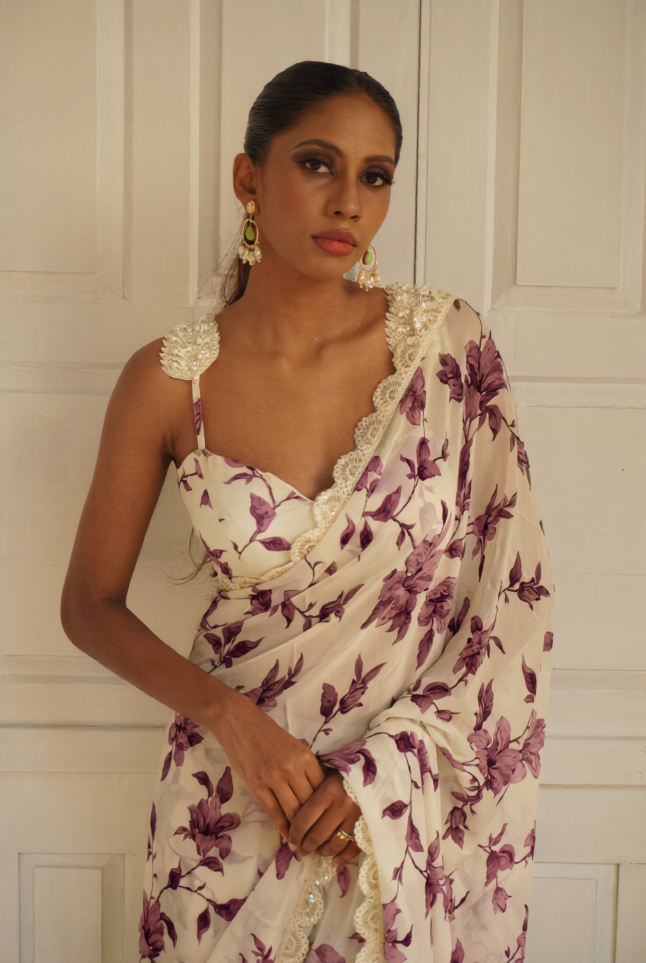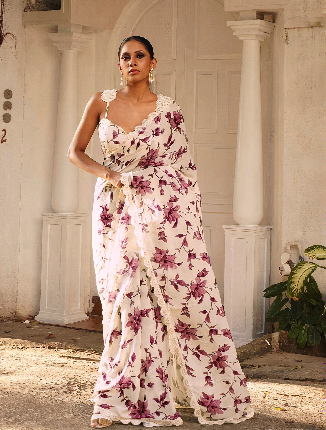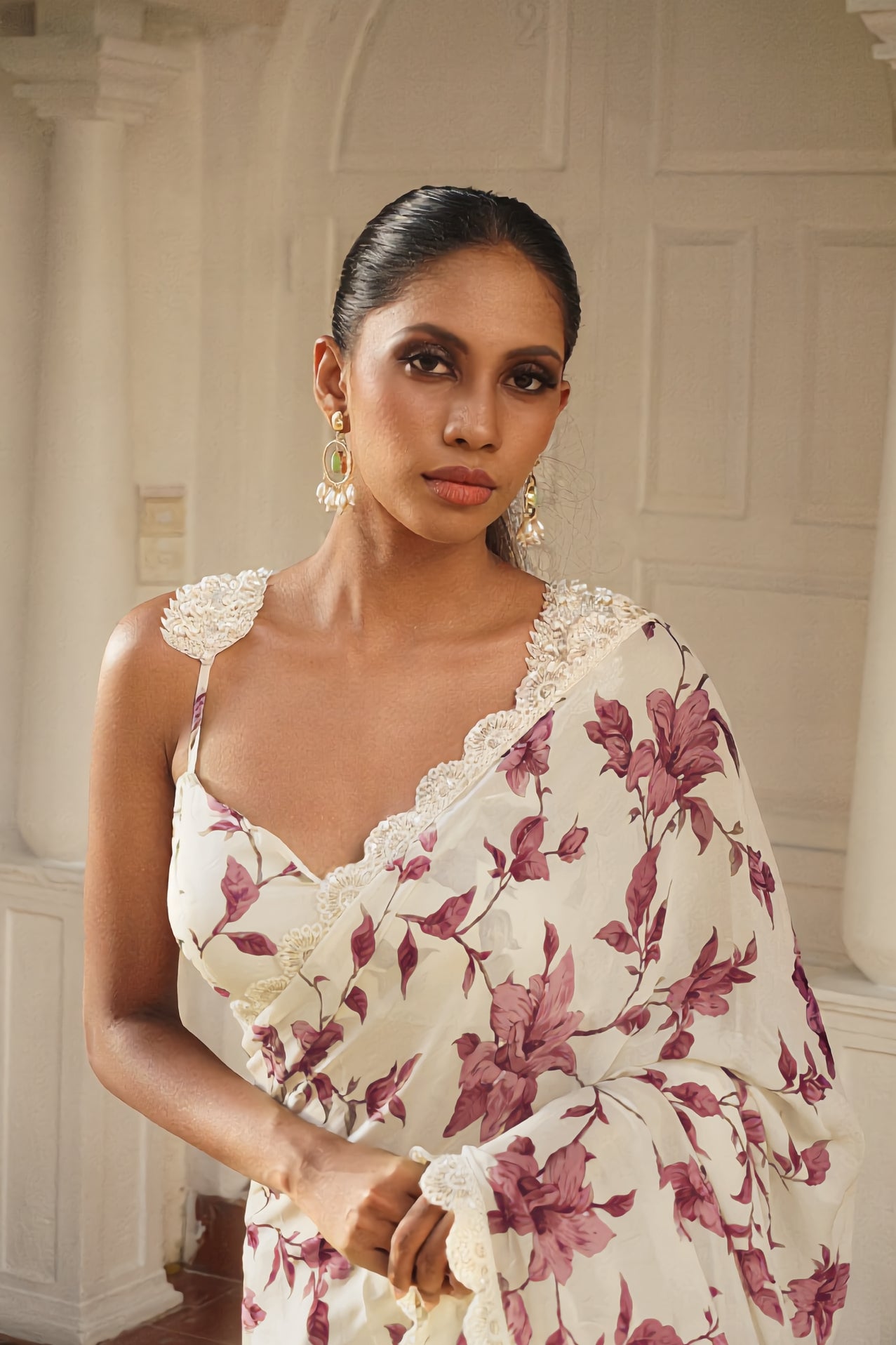 The blouse is in a self print matching the sari. (Trims and embellishments not included. Please ask if you need them added)