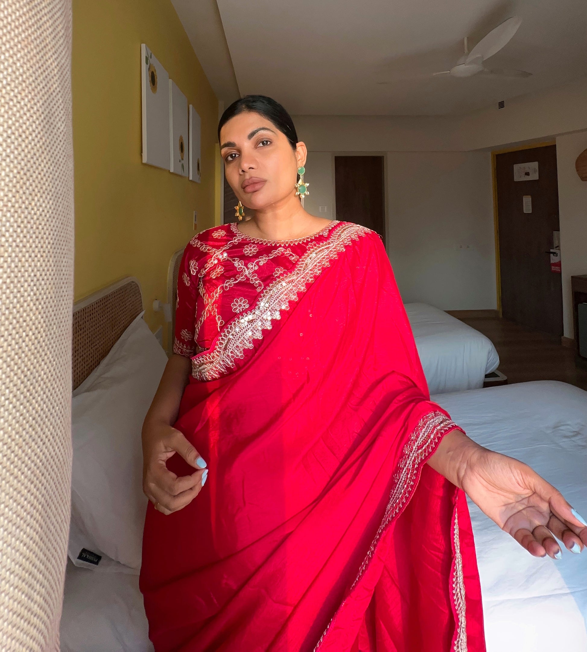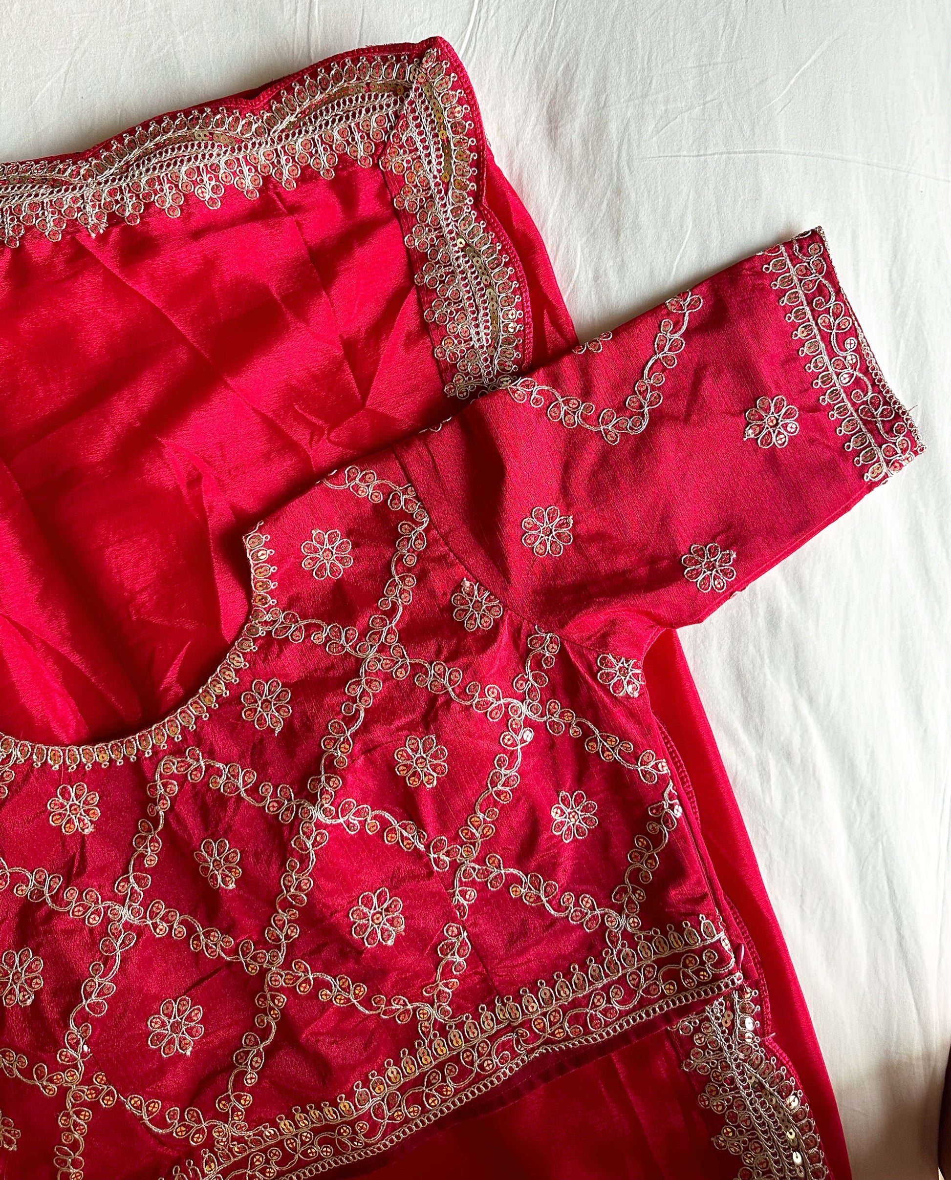 This beauty is a silk crepe sari in a beautiful vibrant red. This fabric drapes so beautifully and feels super light on the skin. You can dance all night in this set! The border is a beautiful woven sequin and thread work one in a large scallop design.