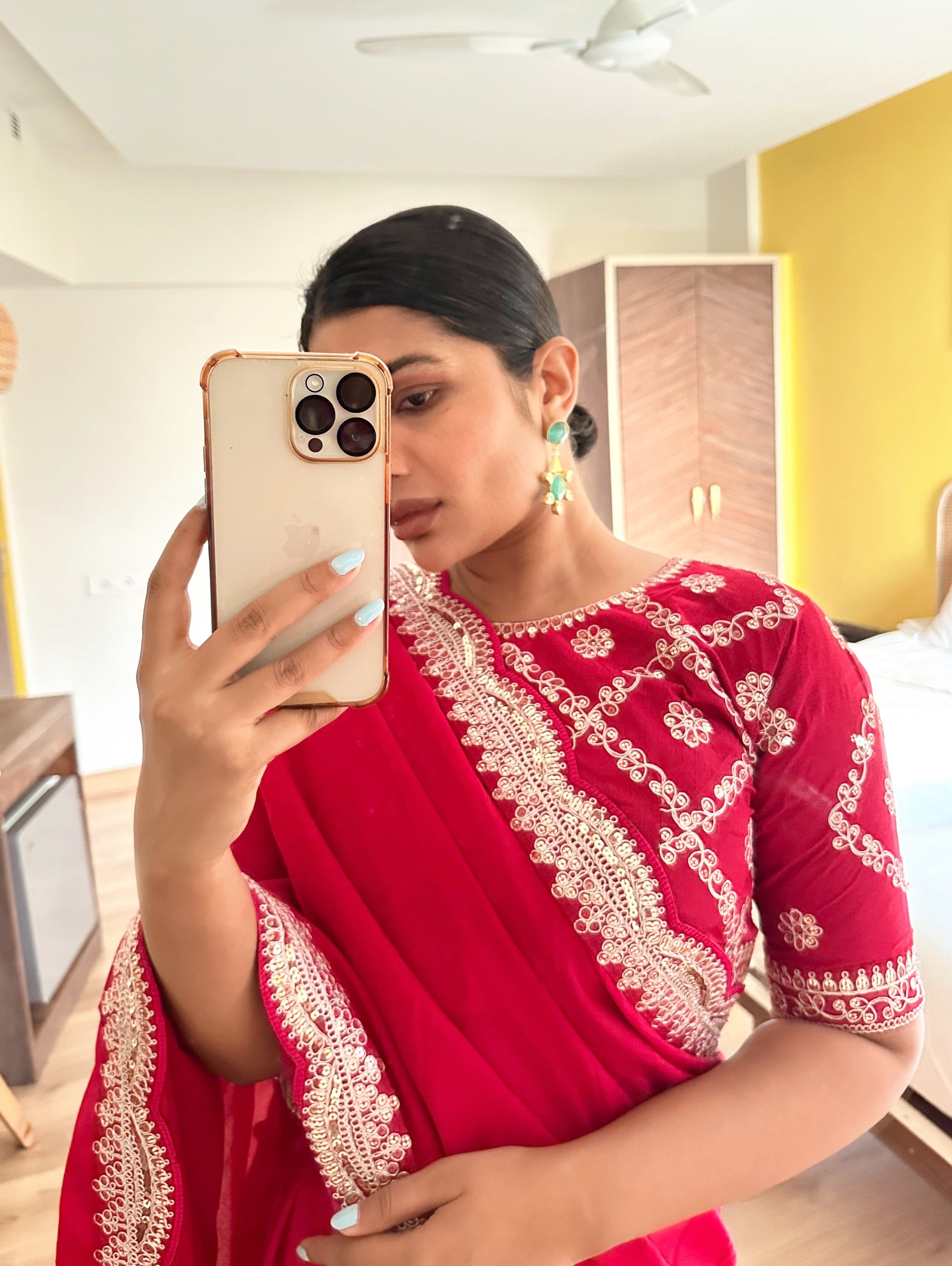 The blouse is a matching red color in a raw silk with hand and machine embroidery all over fully worked to match the sari perfectly.
