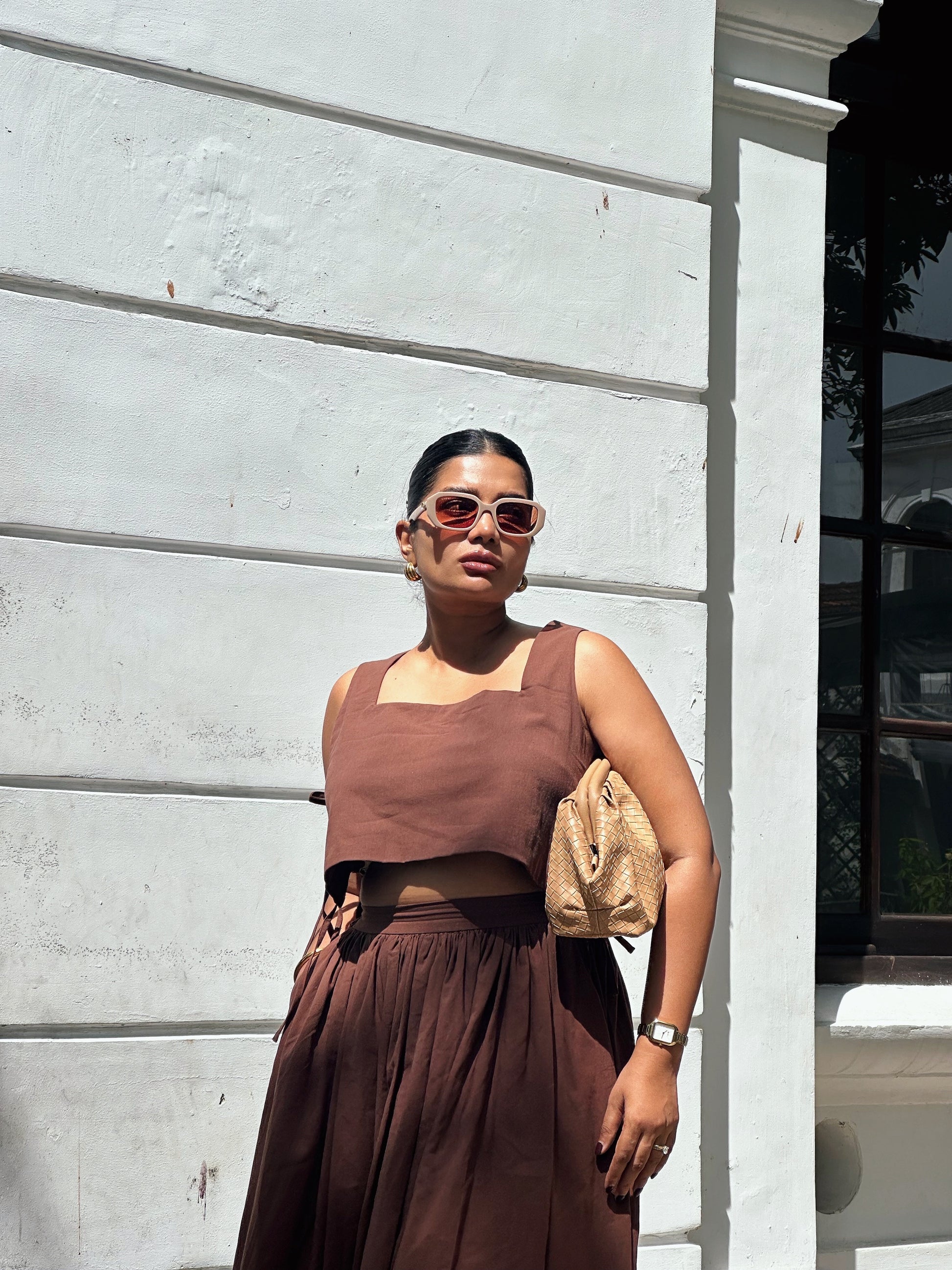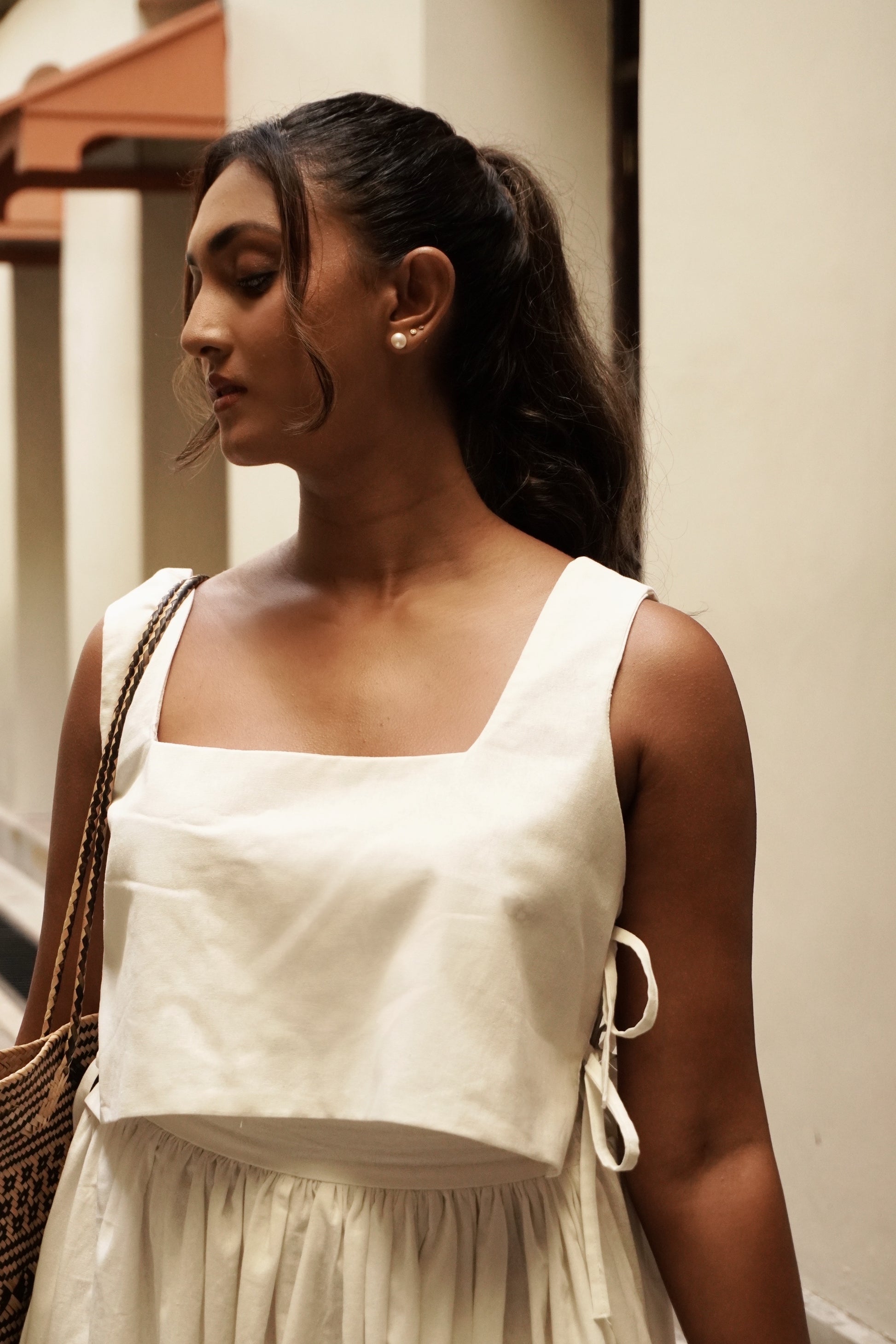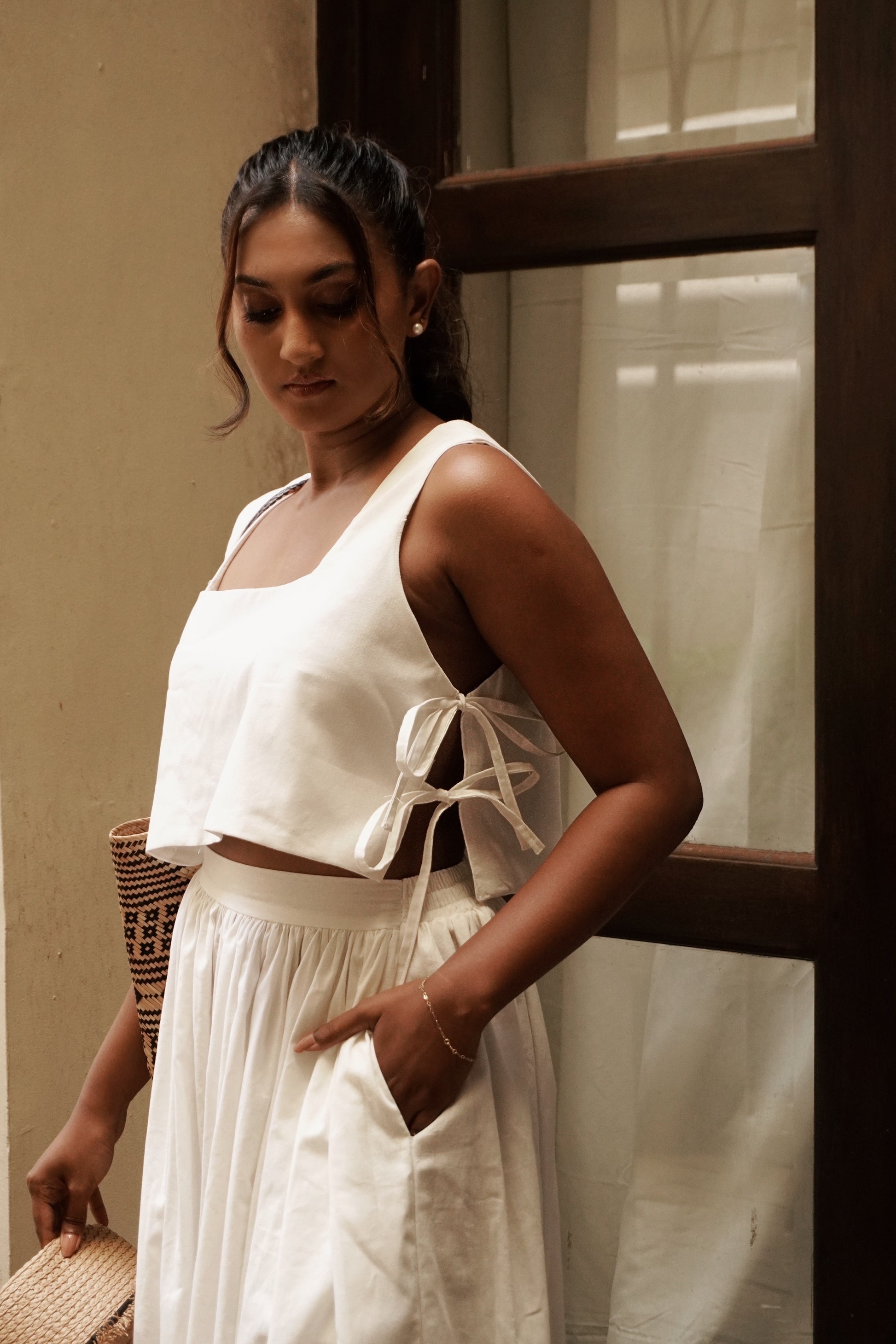 The beautiful blouse is cut in sharp angles and has the prettiest side tie up details.
