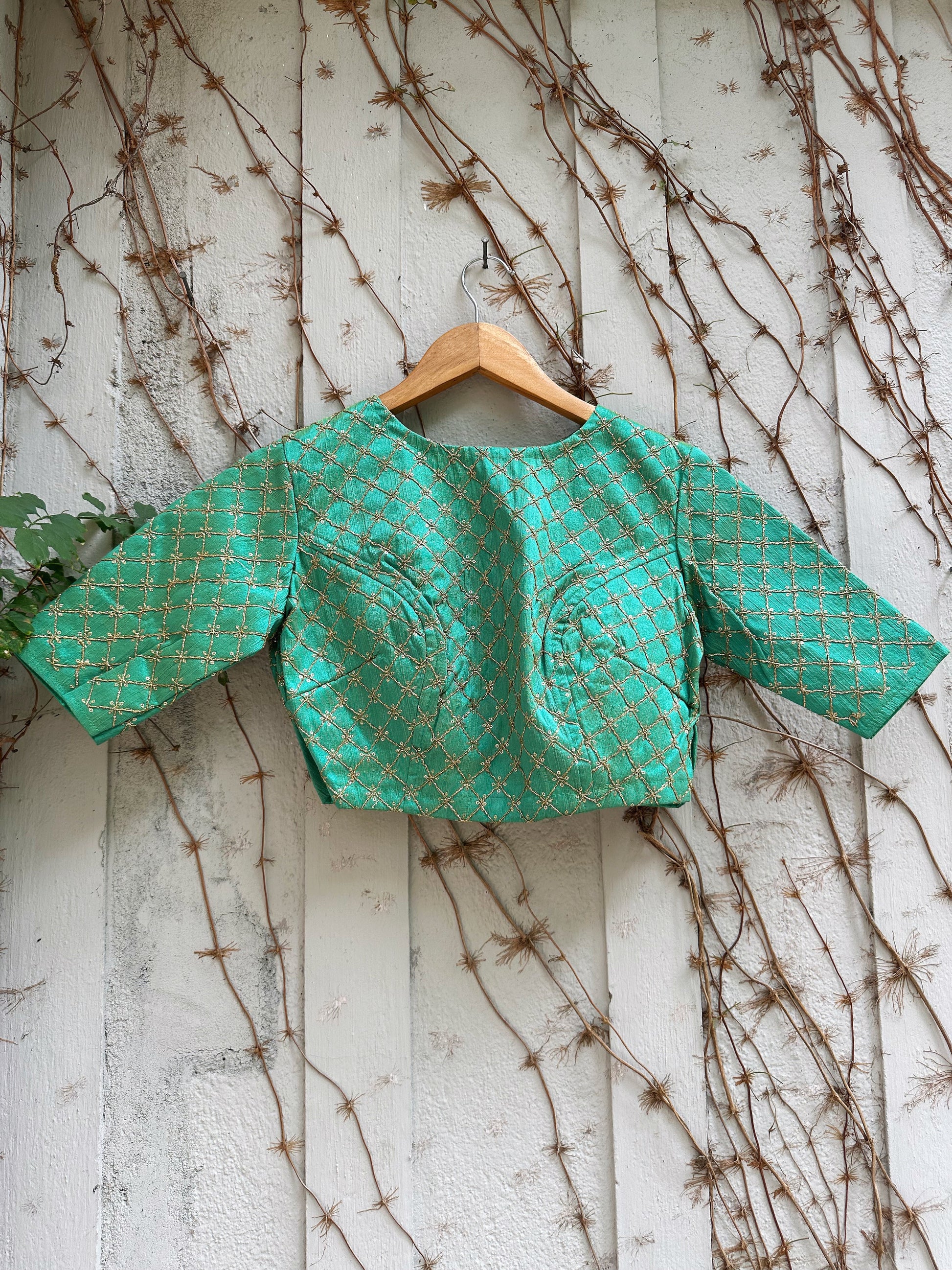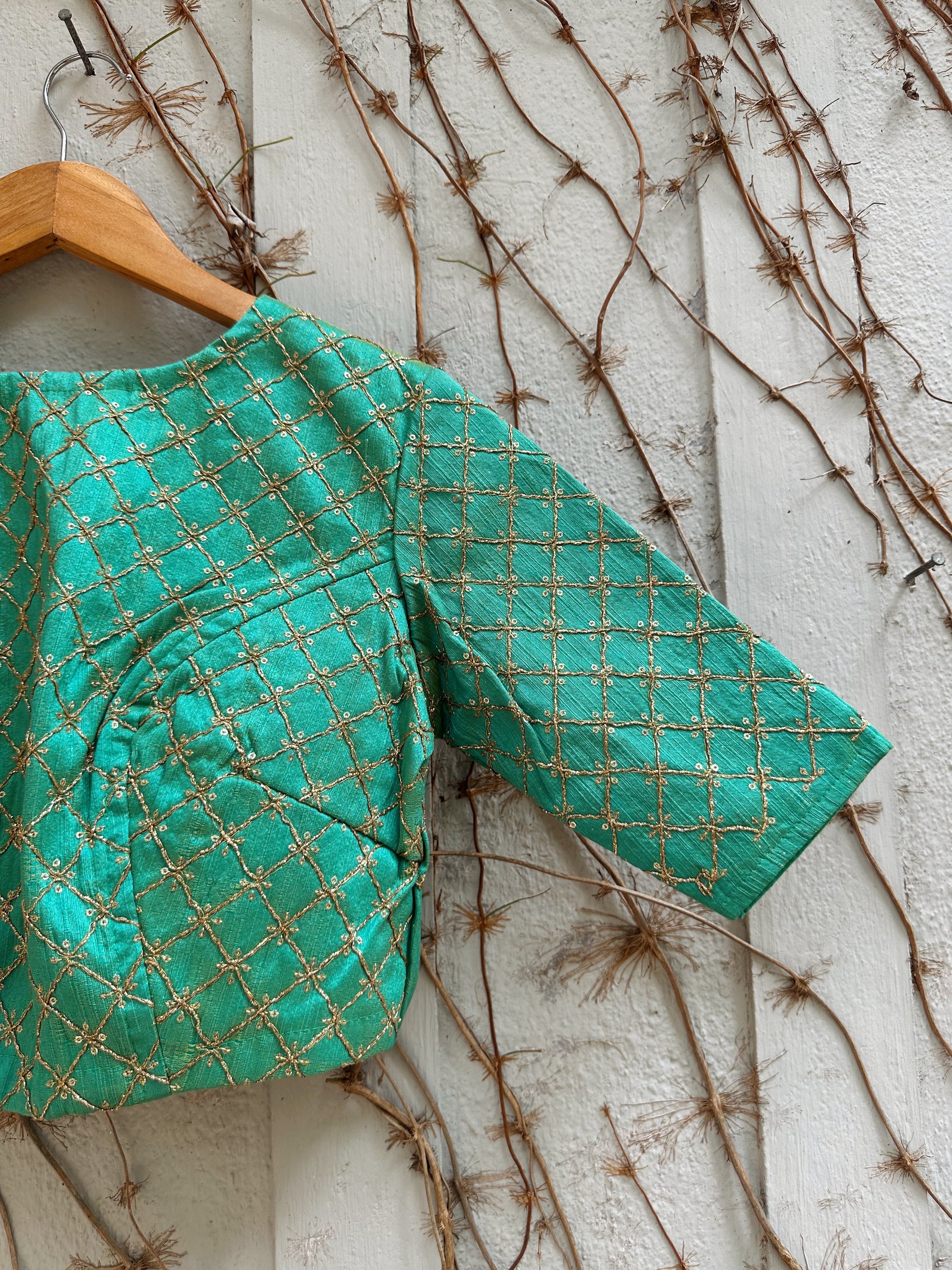 Raw silk blouse in a seafoam green with sequin and gold thread work embroidery.