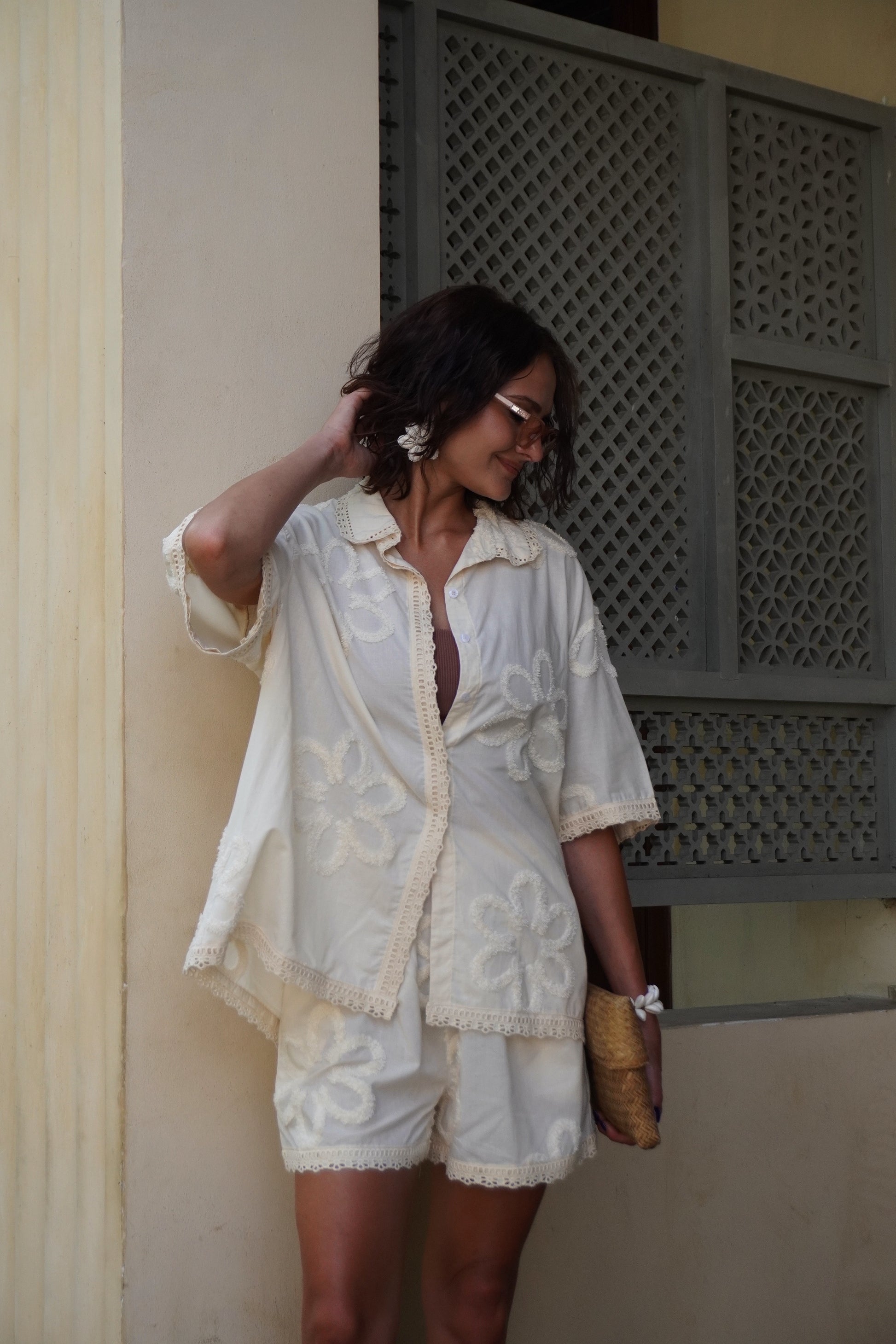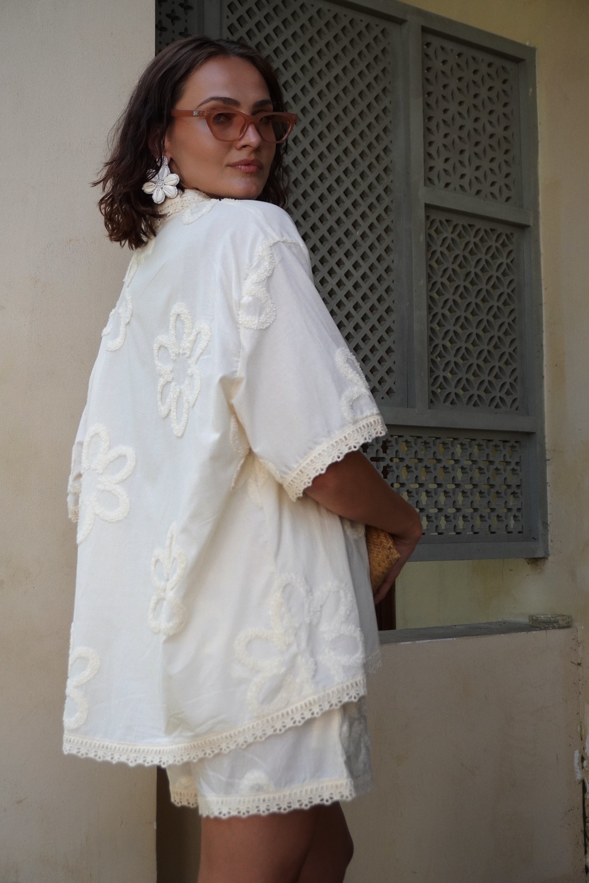 100% cotton creamy ivory fabric with terry cloth embroidery which adds such a unique texture and element to the fabric. An ode to flowers throughout our collection and this is such a subtle take on it.