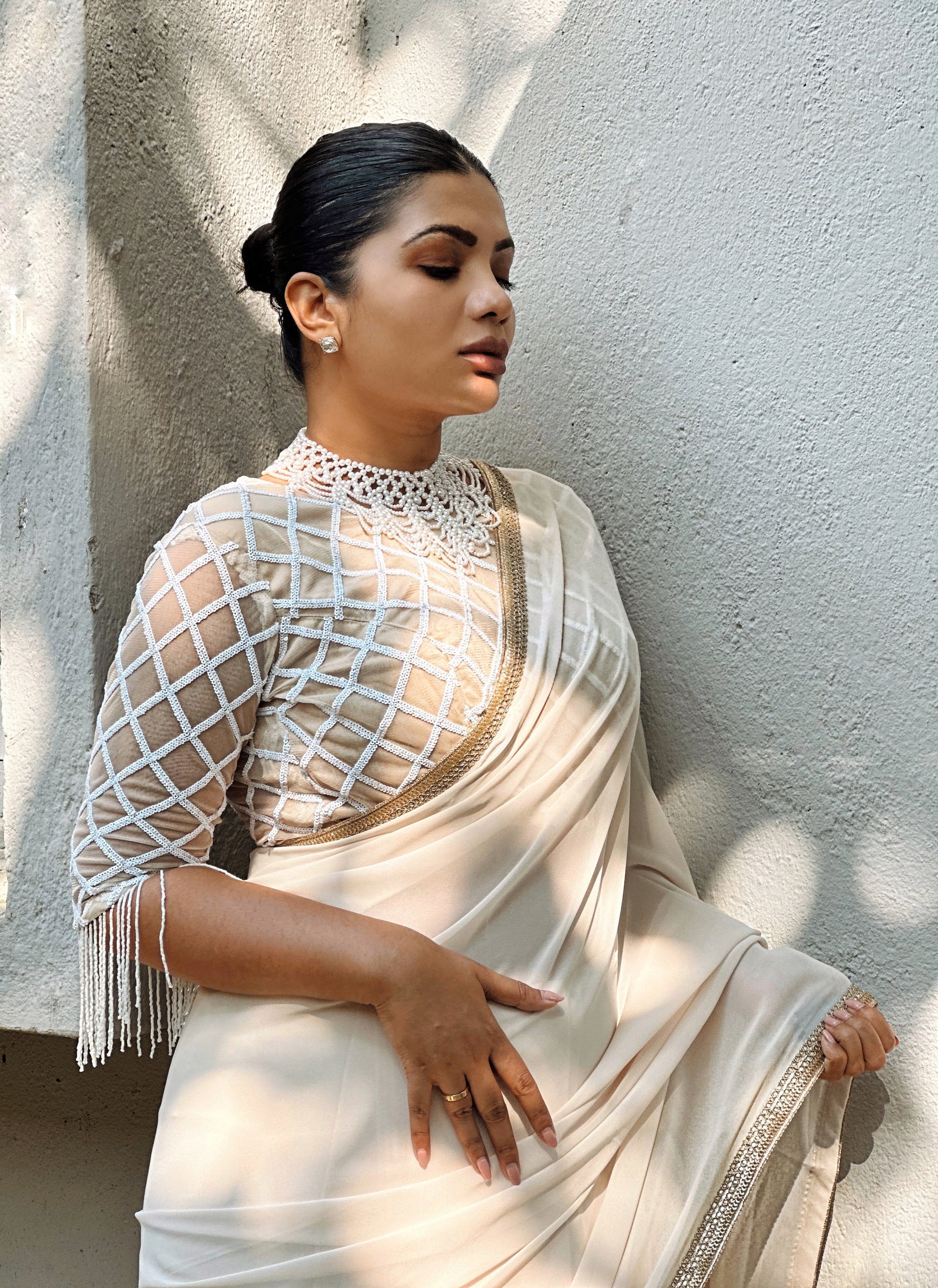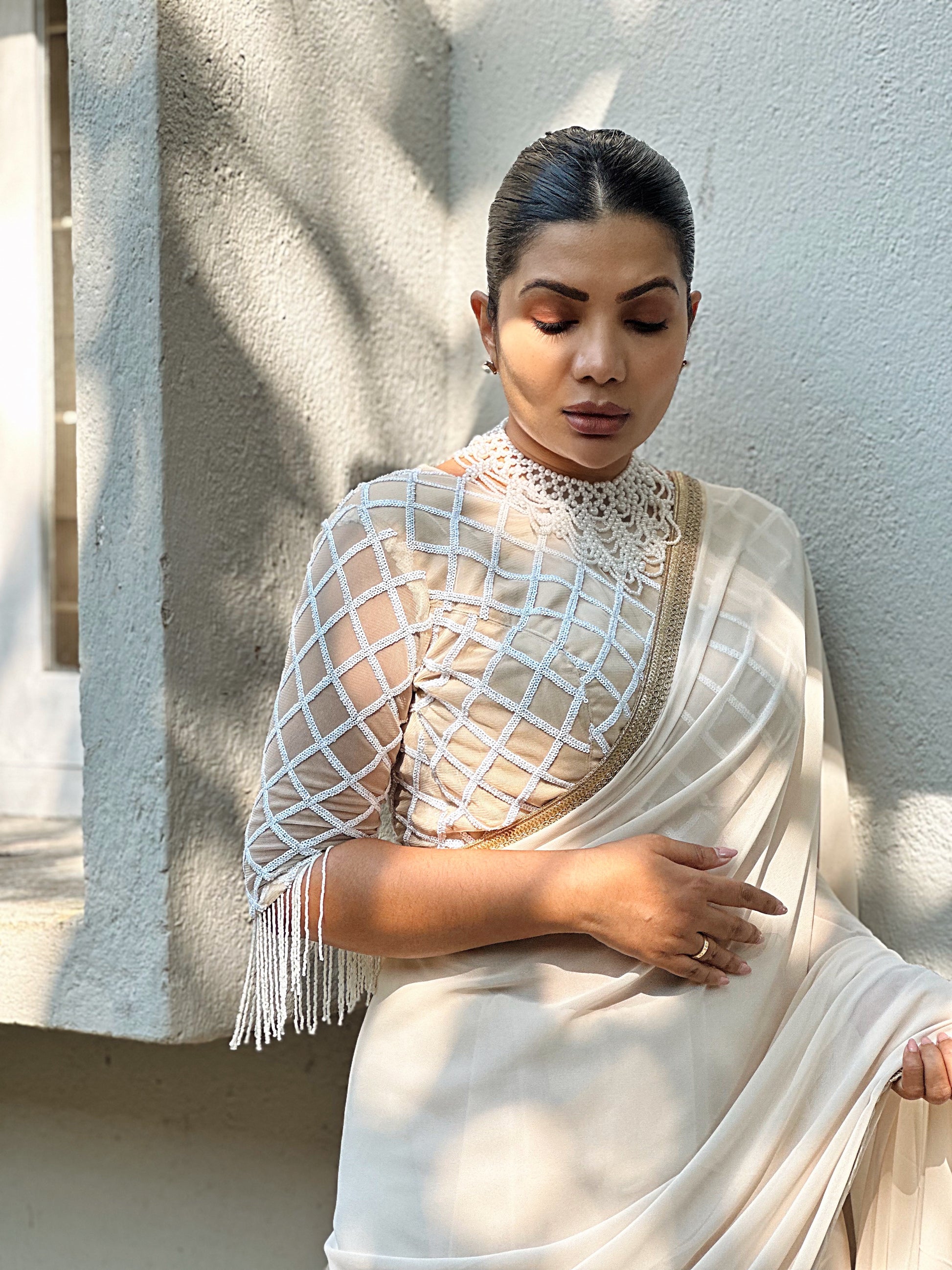 The sari is a beautiful butter soft georgette in a matching ivory color. The border is an intricate woven one perfect to compliment the set.