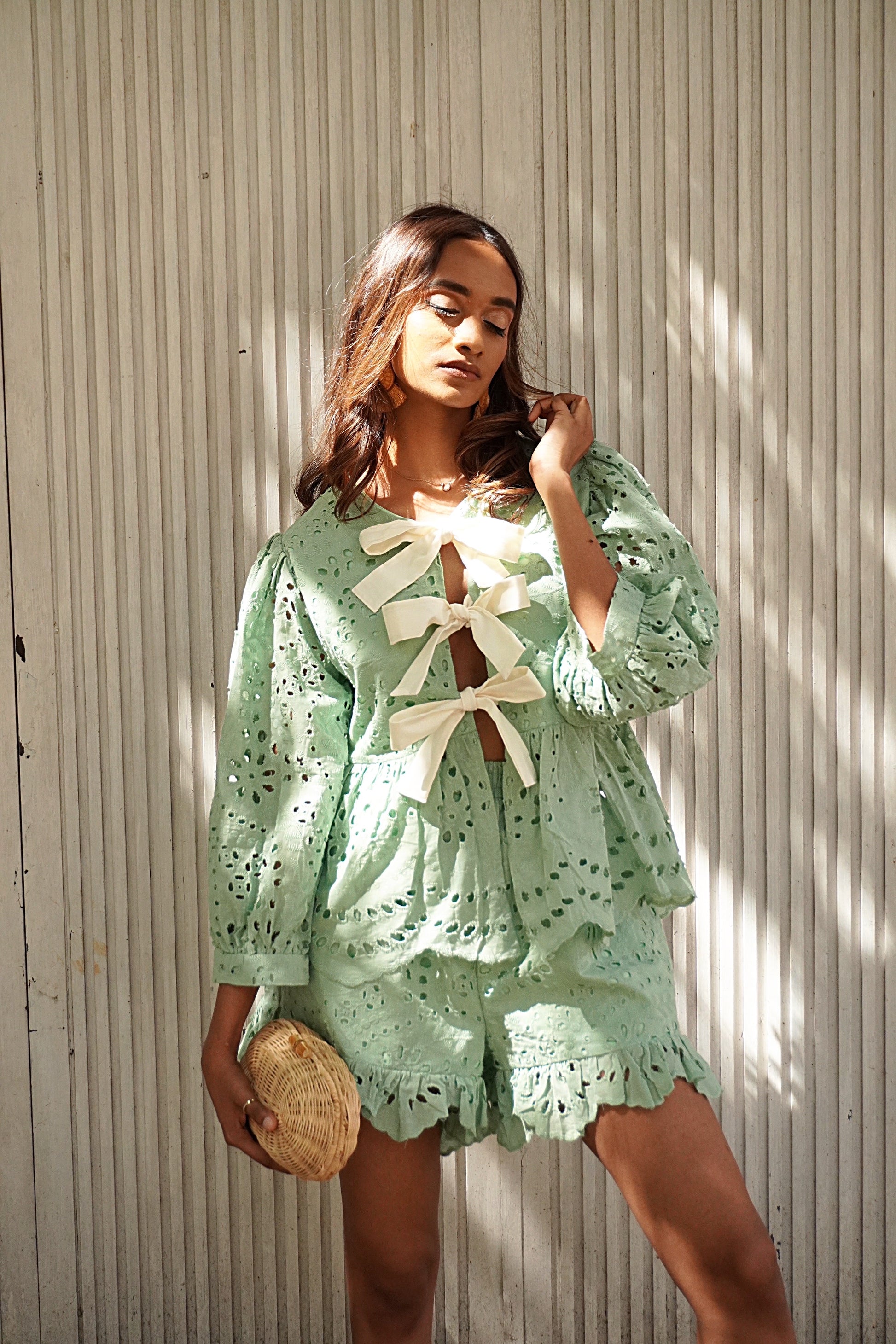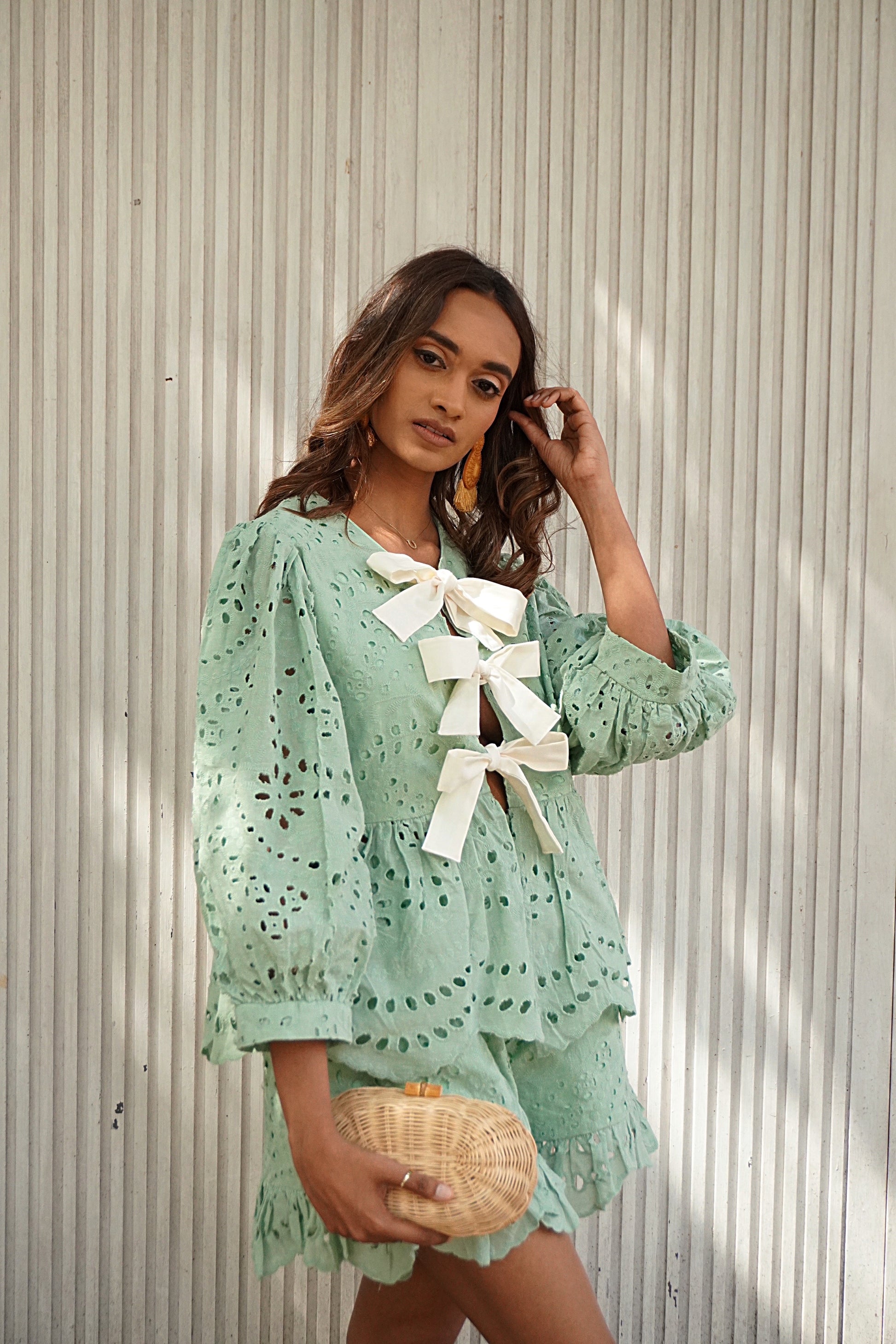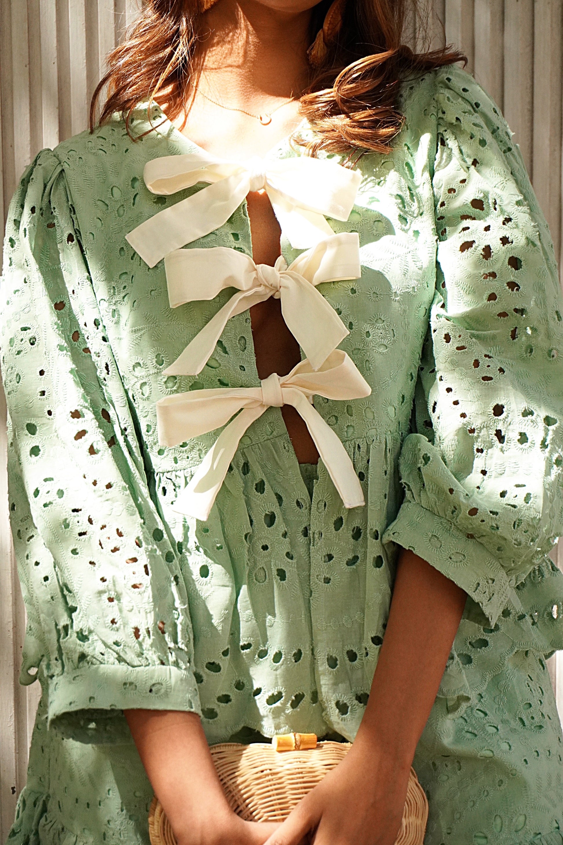 This 100% cotton eyelet fabric in a beautiful sage green/powder blue is so timeless and beautiful.