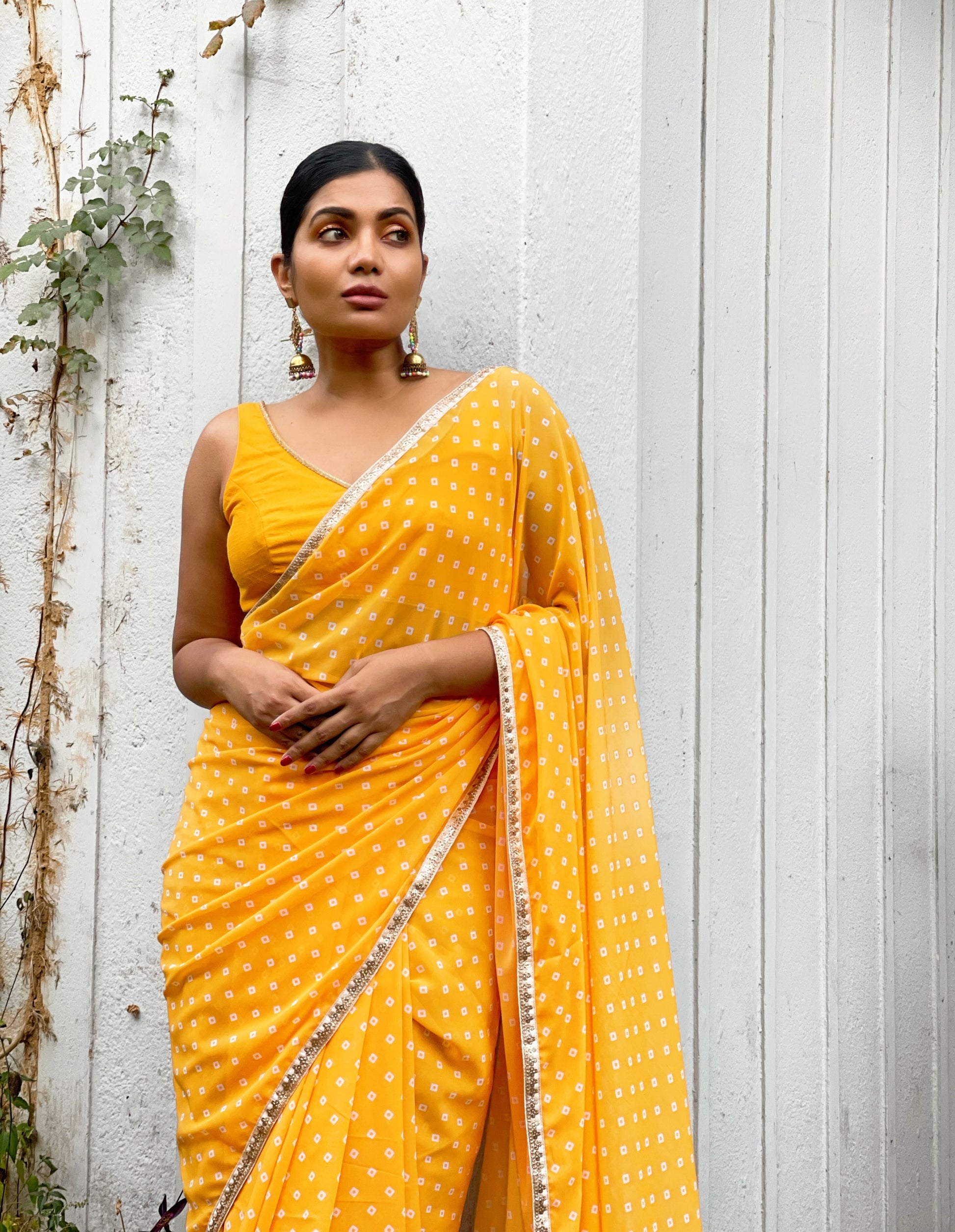 Beautiful BANDANI printed georgette sari in fuchsia pink with a black sequin worked border. The border is so beautifully intricate and detailed.