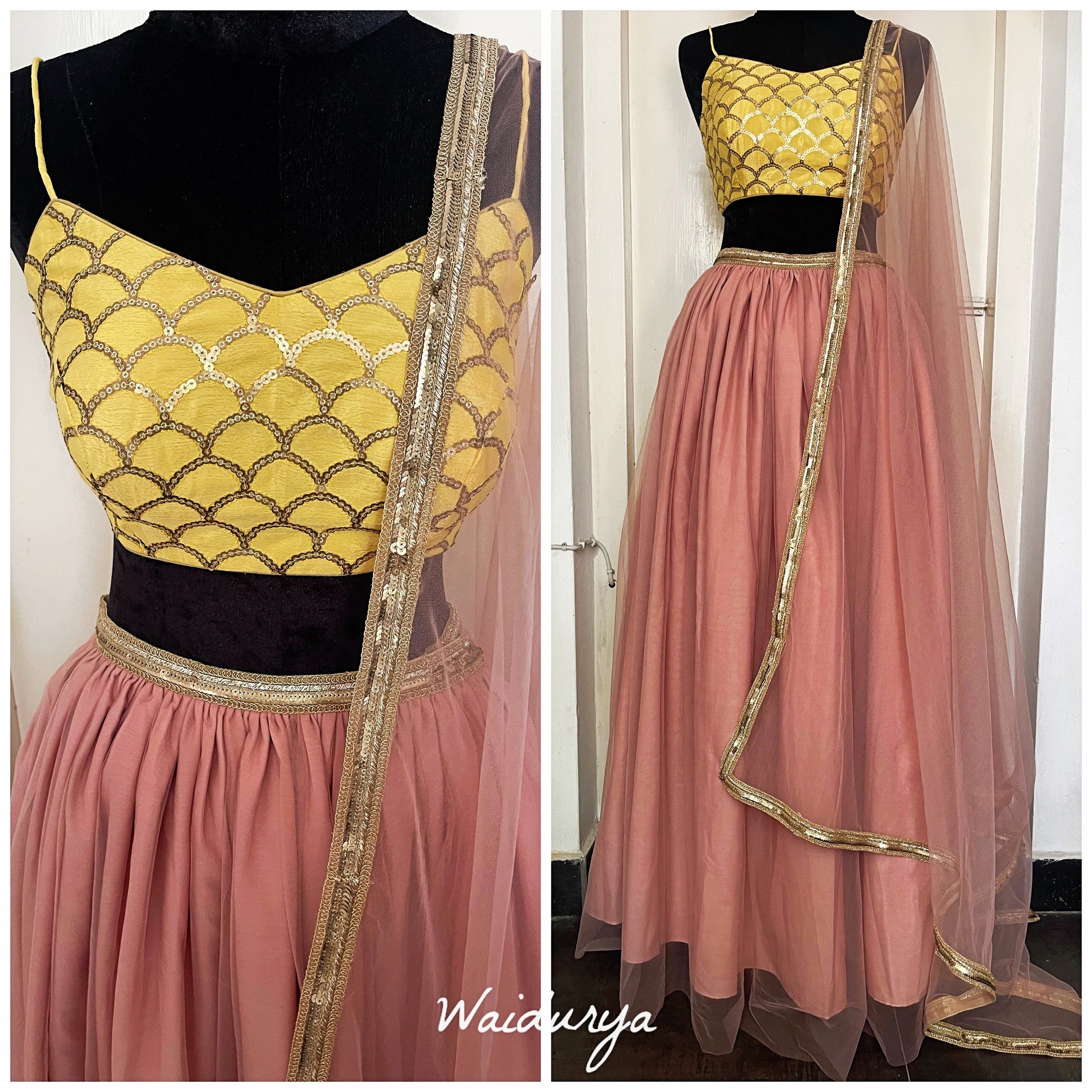 The skirt is a full volume net one with a heavy sequin worked gold waist band. The dupatta is a matching soft net one with the same gold worked border. Both fabrics are hand dyed to get the perfect peony pink hue!