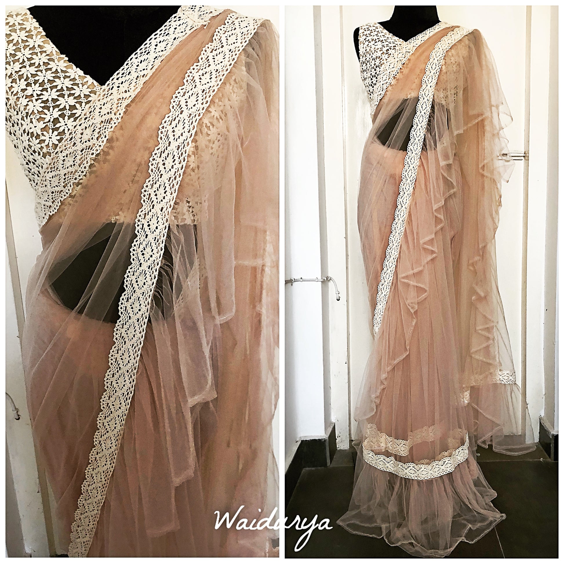 Beautiful peachy nude soft net hand frilled sari with cotton lace detailing. Absolutely stunning! Dainty and feminine for those day time affairs.