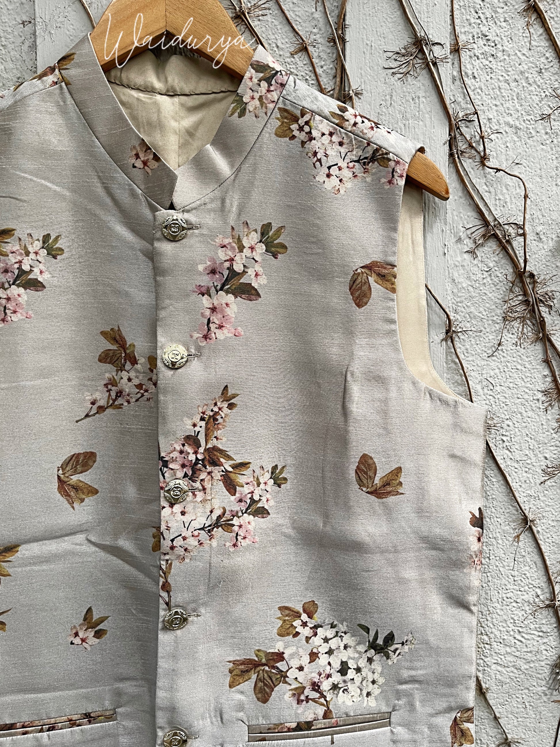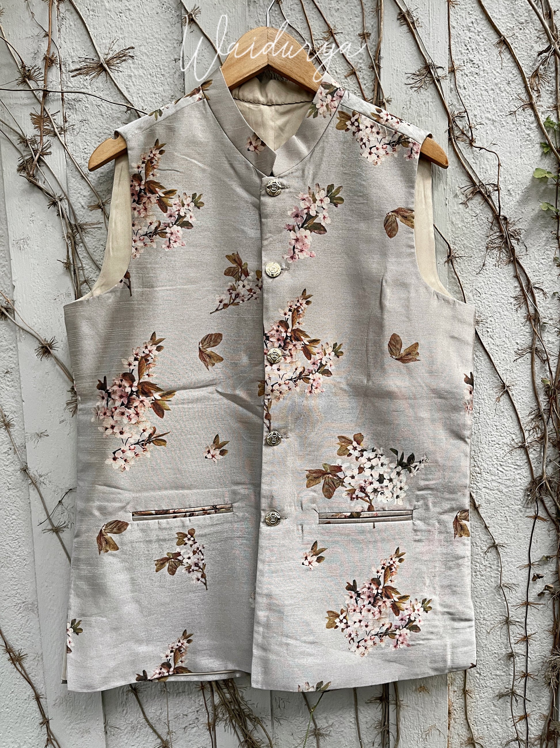 Floral printed raw silk mens vest perfectly tailored with silver buttons with a traditional touch.