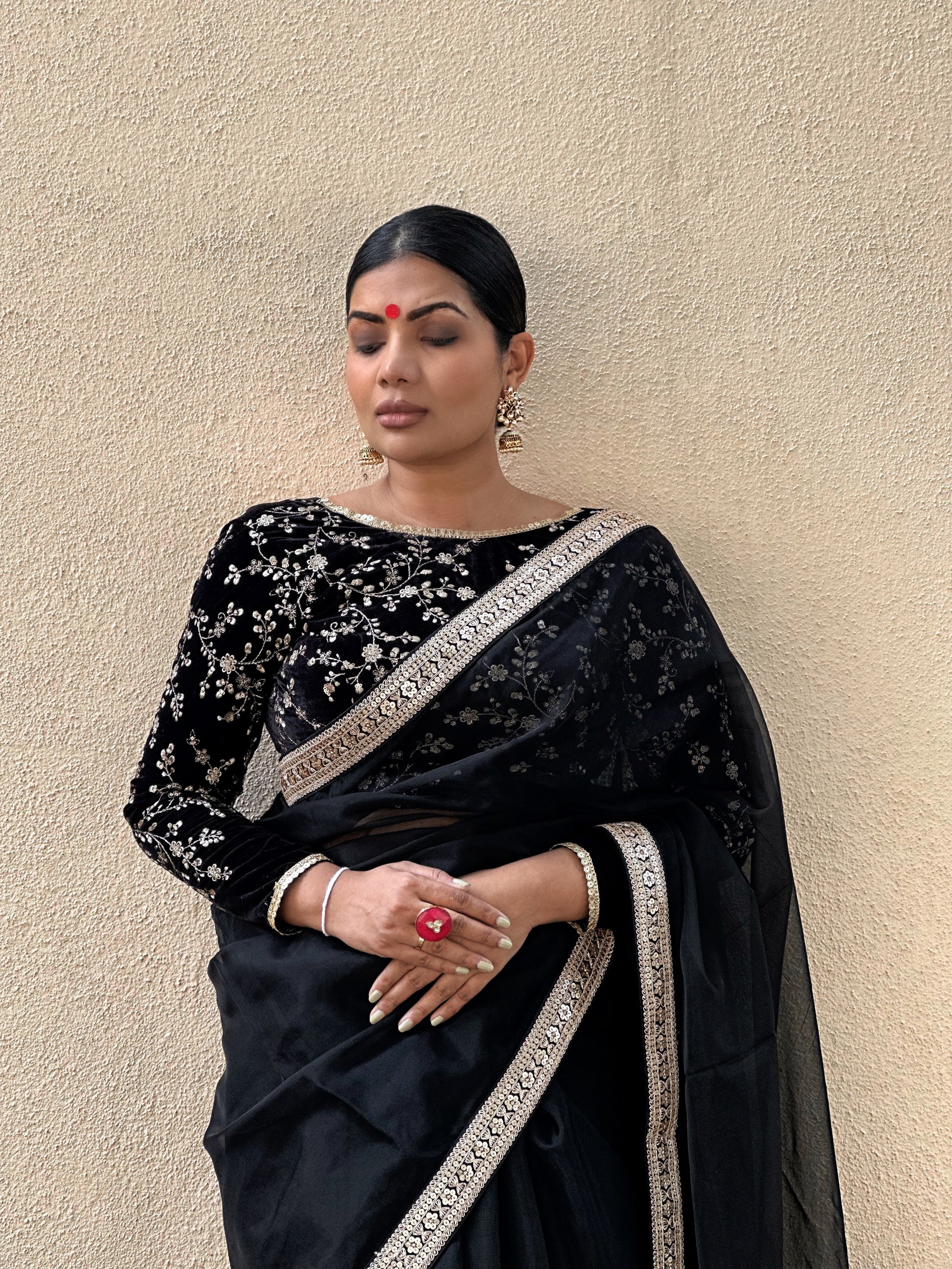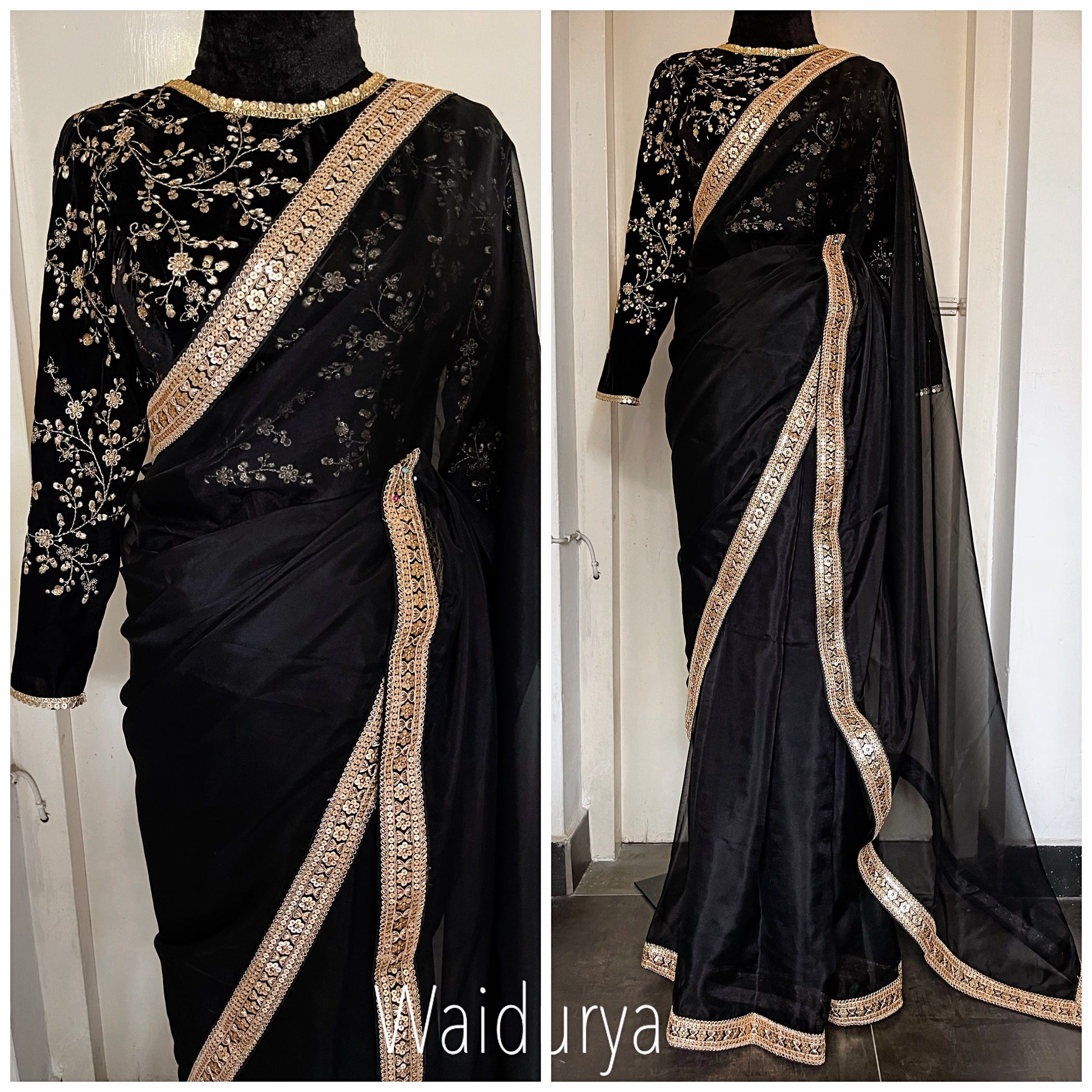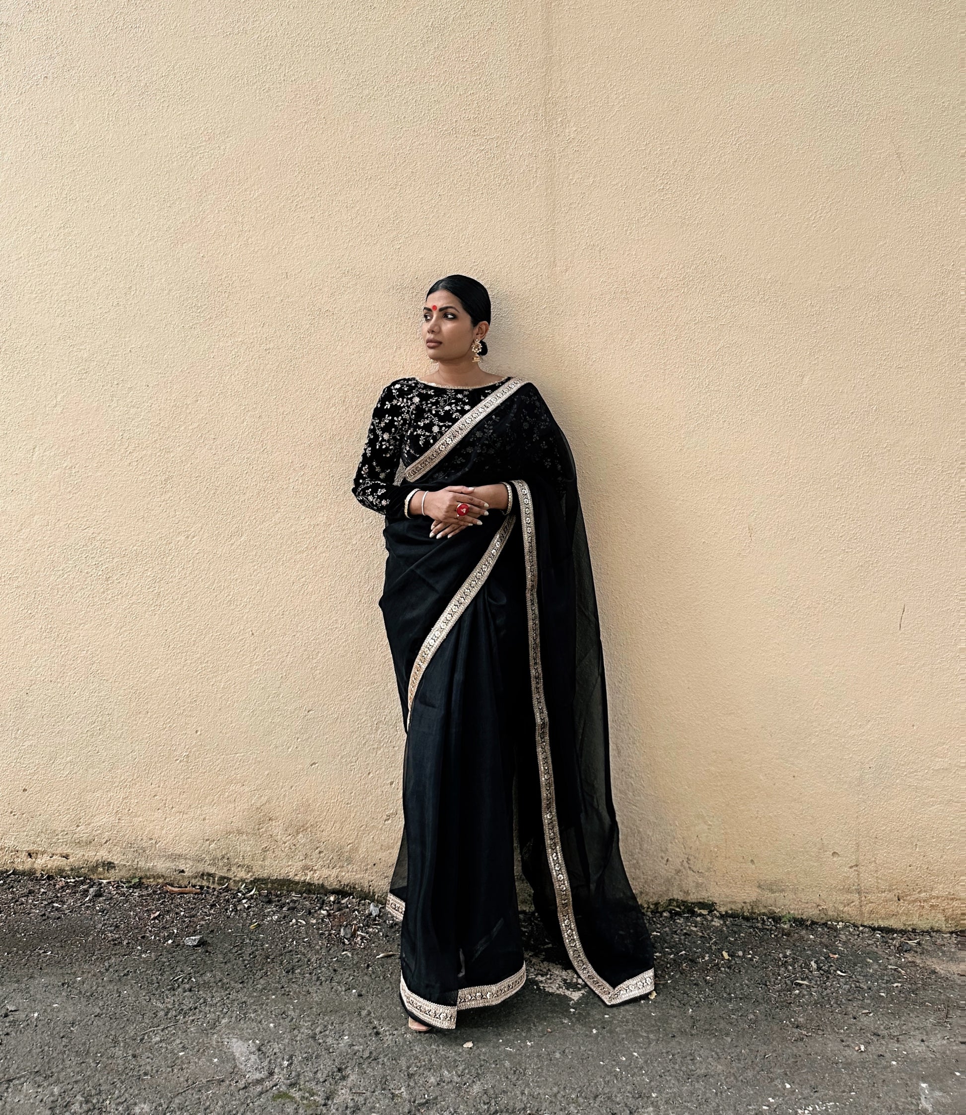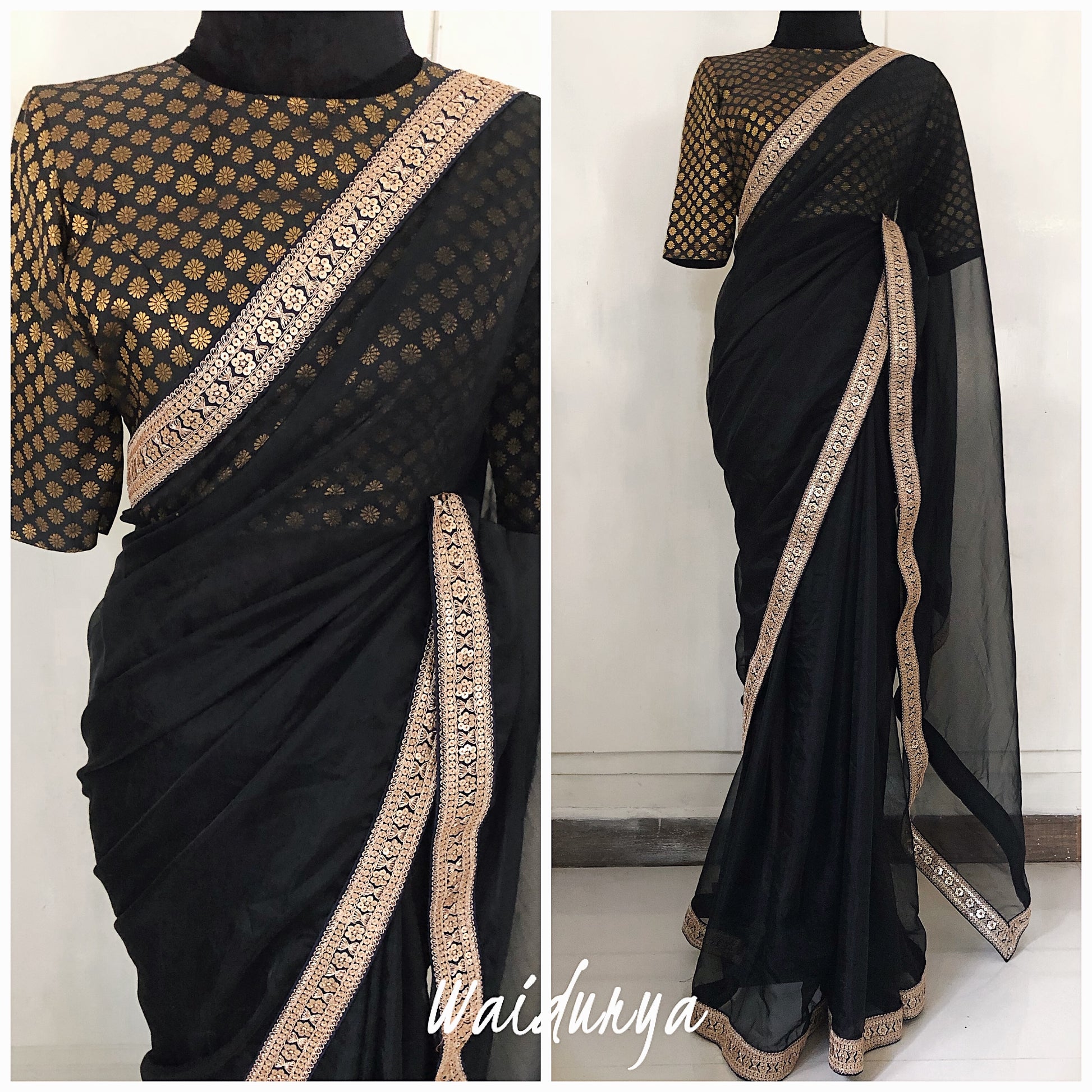 Beautiful black organza sari with a gold sequin embroidered border on an ivory raw silk base. Demure and feminine but completely on trend!