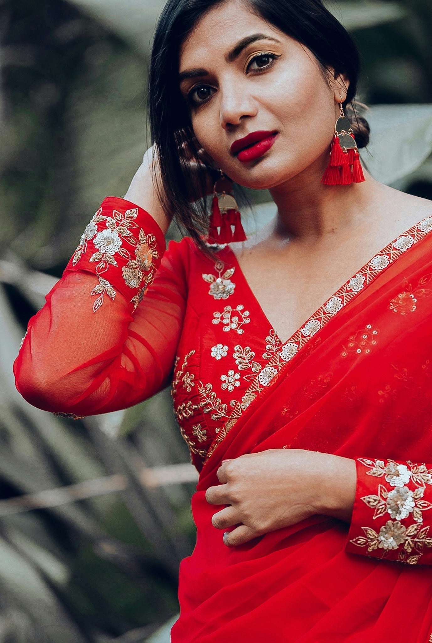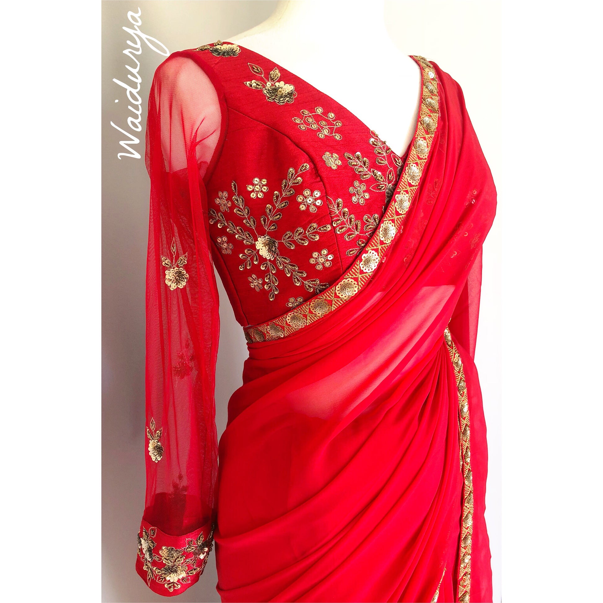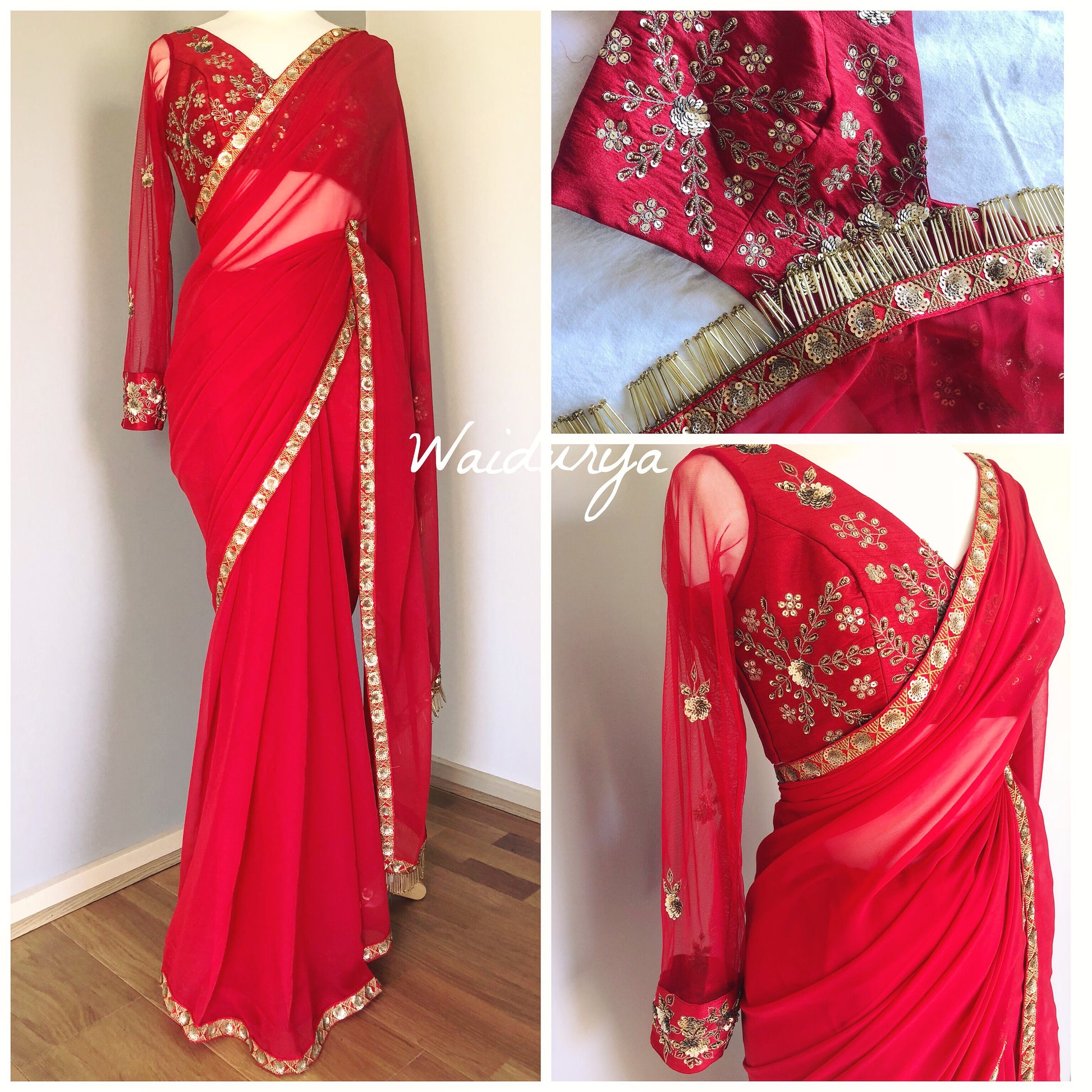 Gorgeous red georgette sari with a sequin worked border and glass bead tassels at the edge of the pallu! The blouse is silk hand embroidered in zardozi and sequin work!