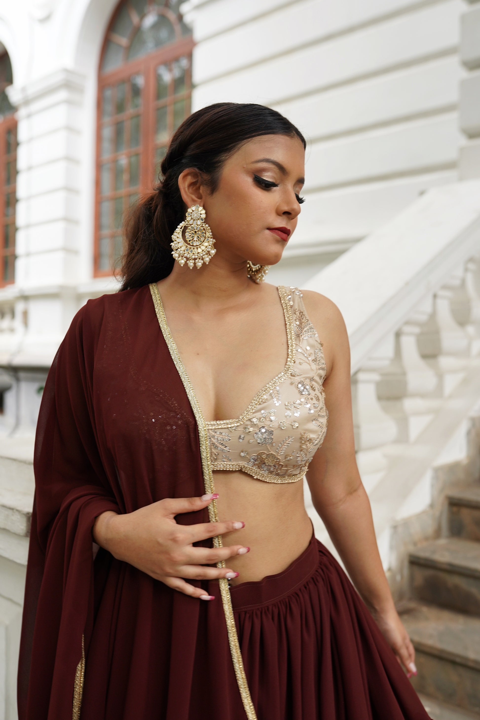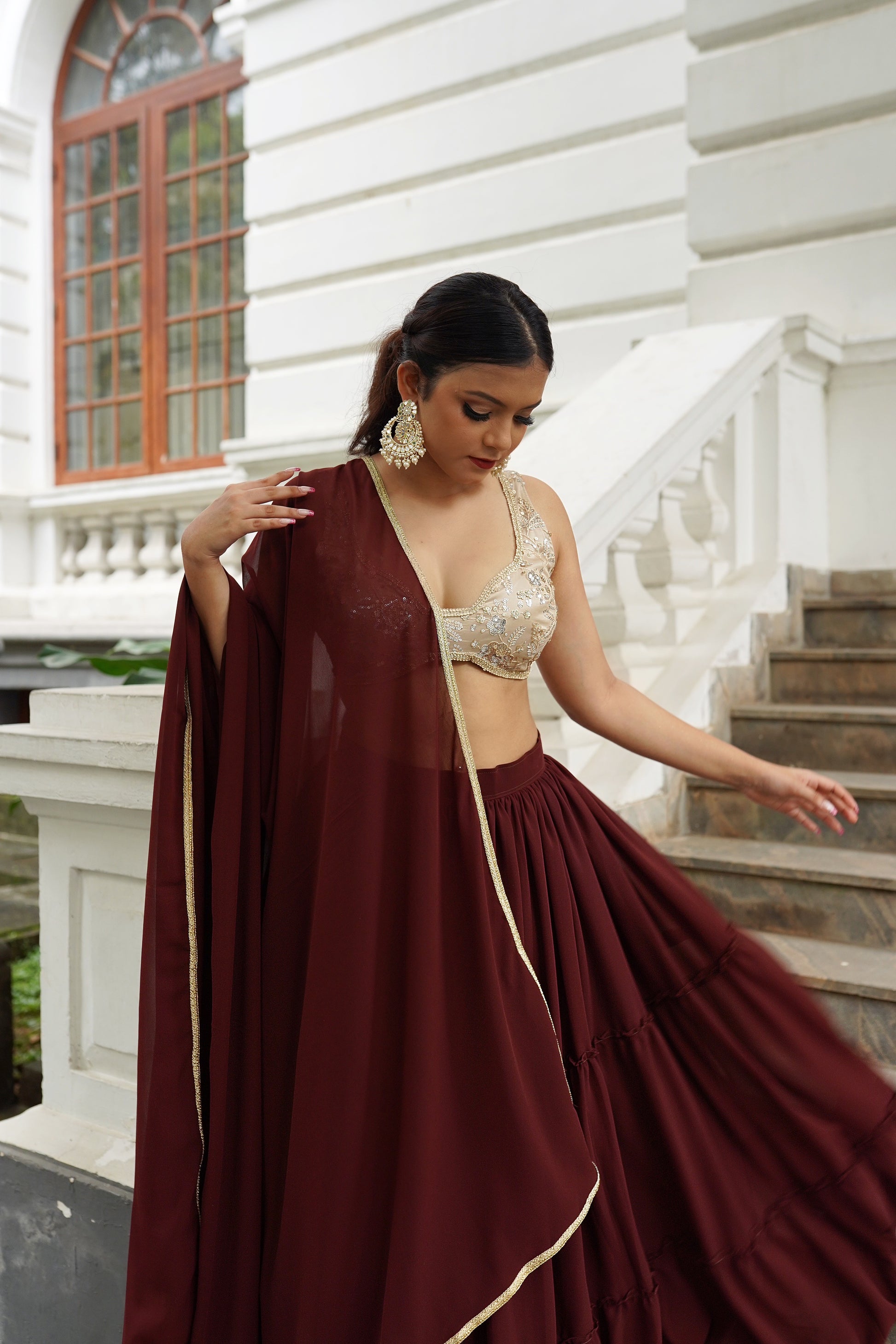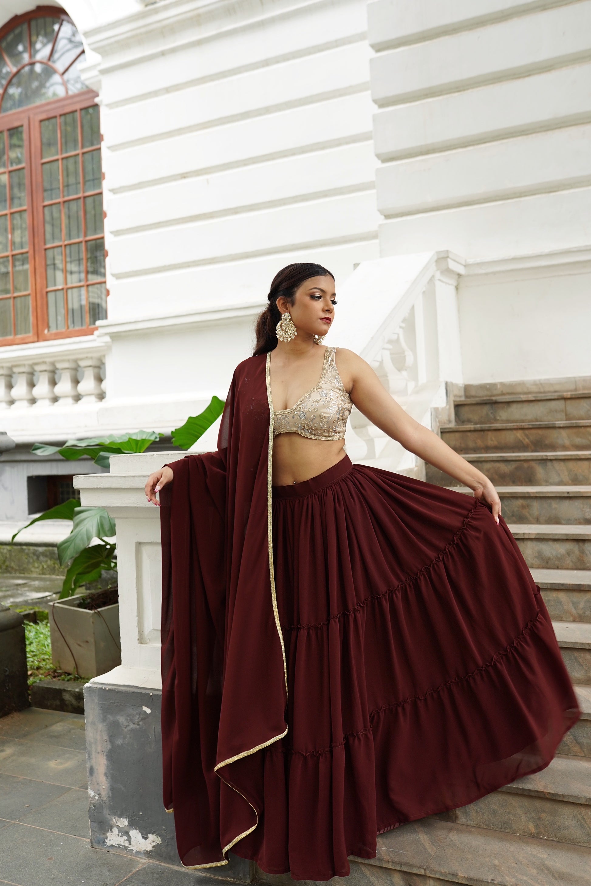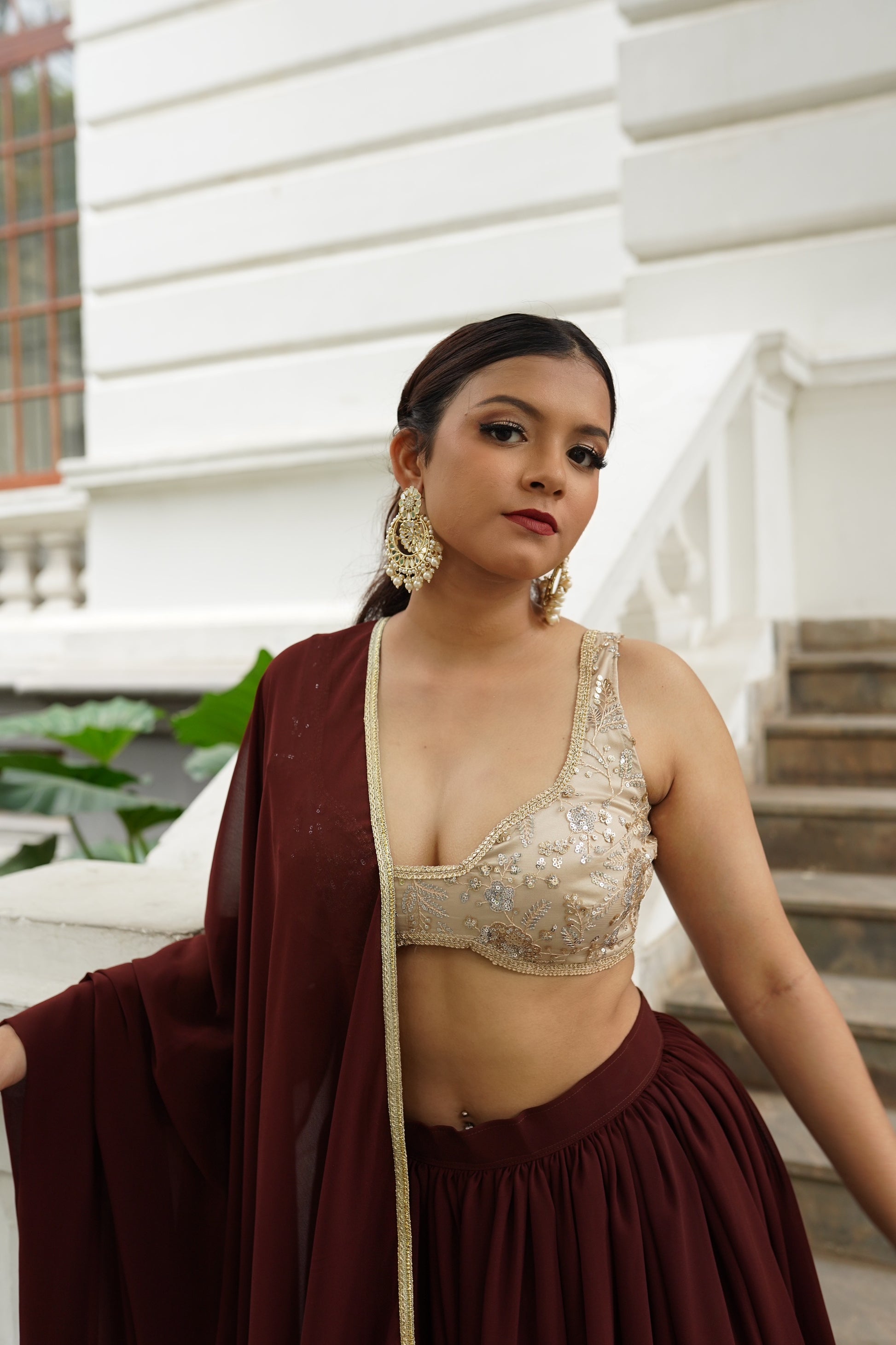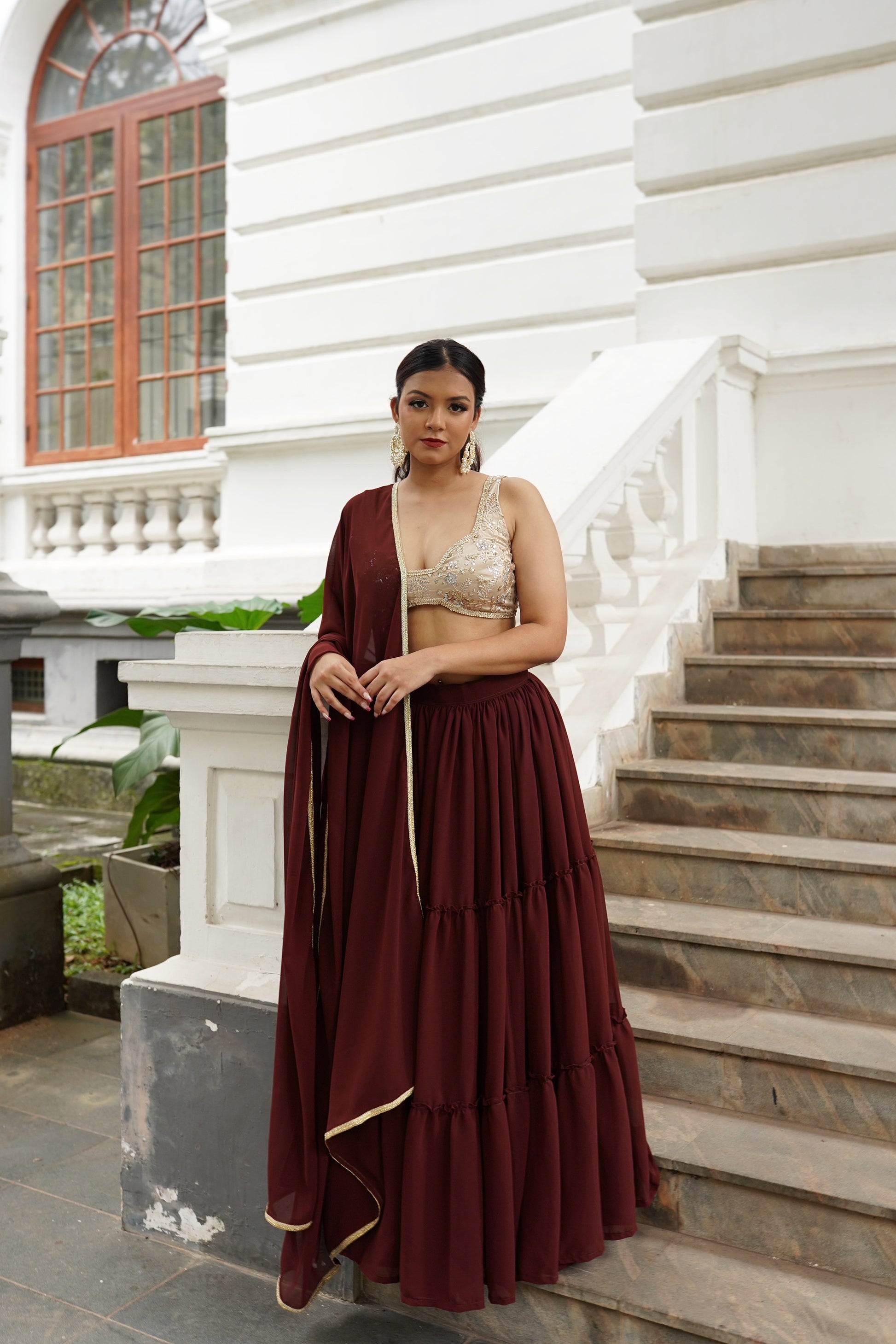COCO is our latest lehenga in the ‘Chapter Two’ collection. It’s fun, flirty and oh so feminine. The rich chocolate brown of the lehenga is unexpected but beautiful. The lehenga is tailored in a layered ruffle style. The blouse is a heavily embroidered one with sequin work in a mix of metallics in a beautiful champagne color. The dupatta is a matching soft georgette in the same chocolate color.