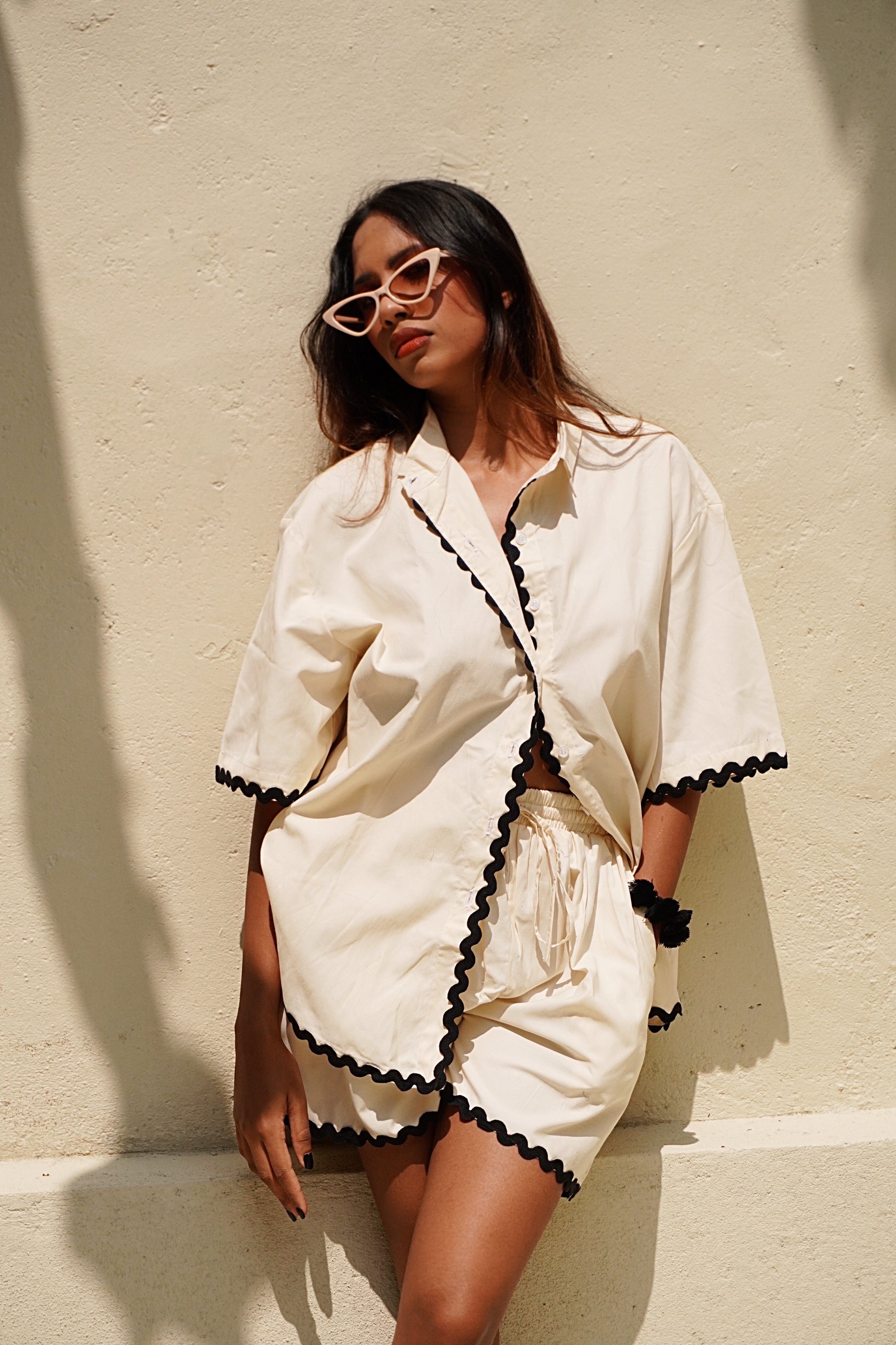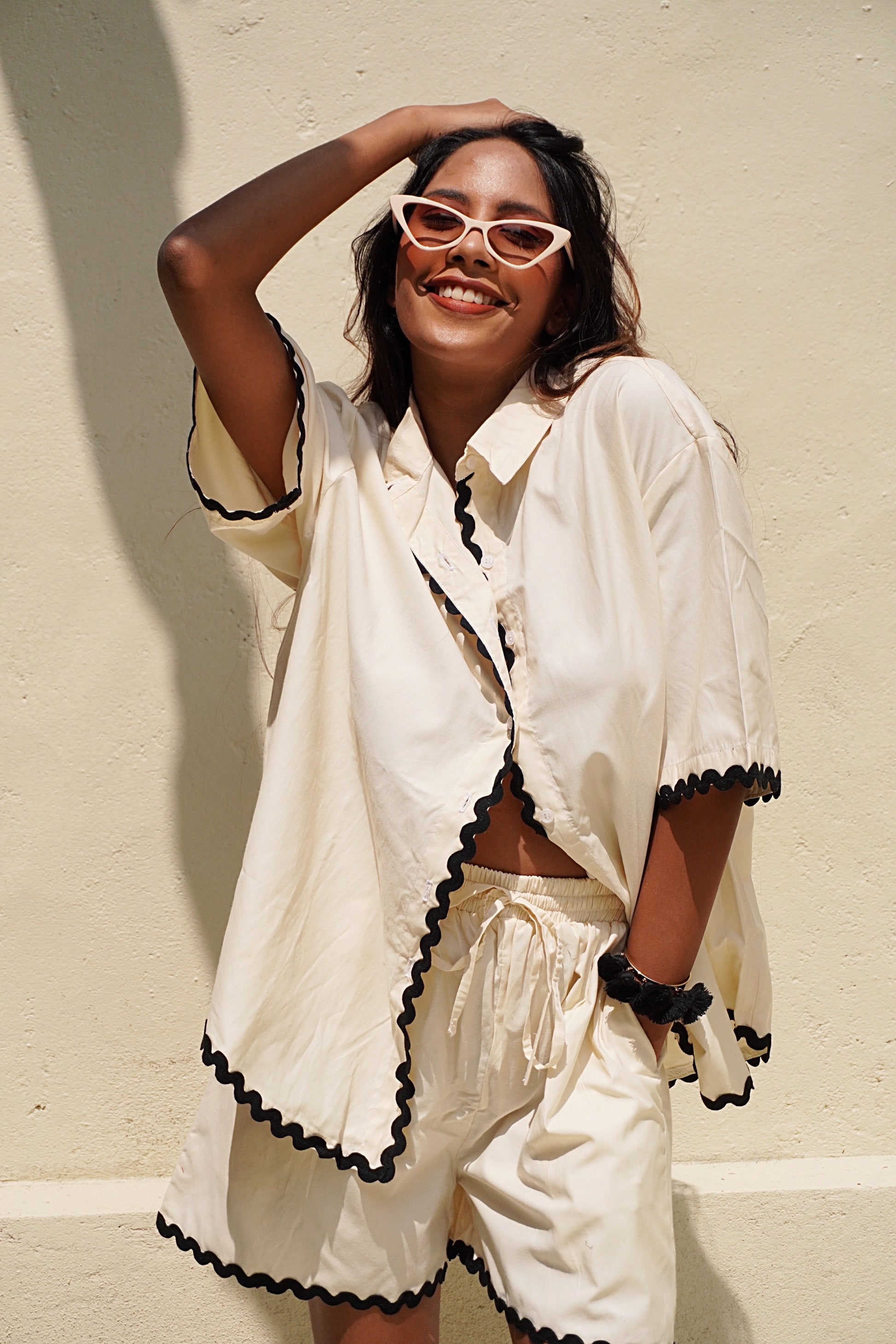 100% cotton shorts set in a beautiful creamy ivory. Contrasted by a cotton scallop detail, this is a trendy and polished look that will always be in style.