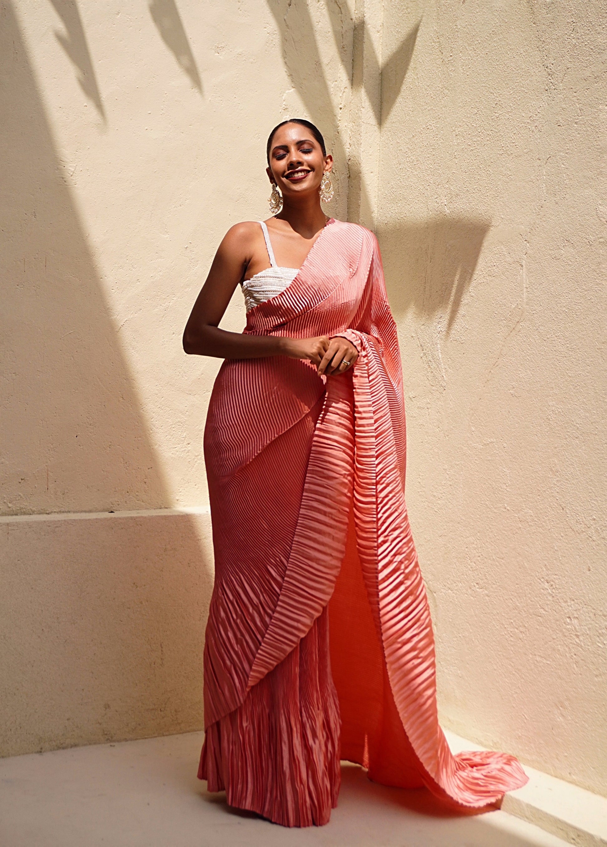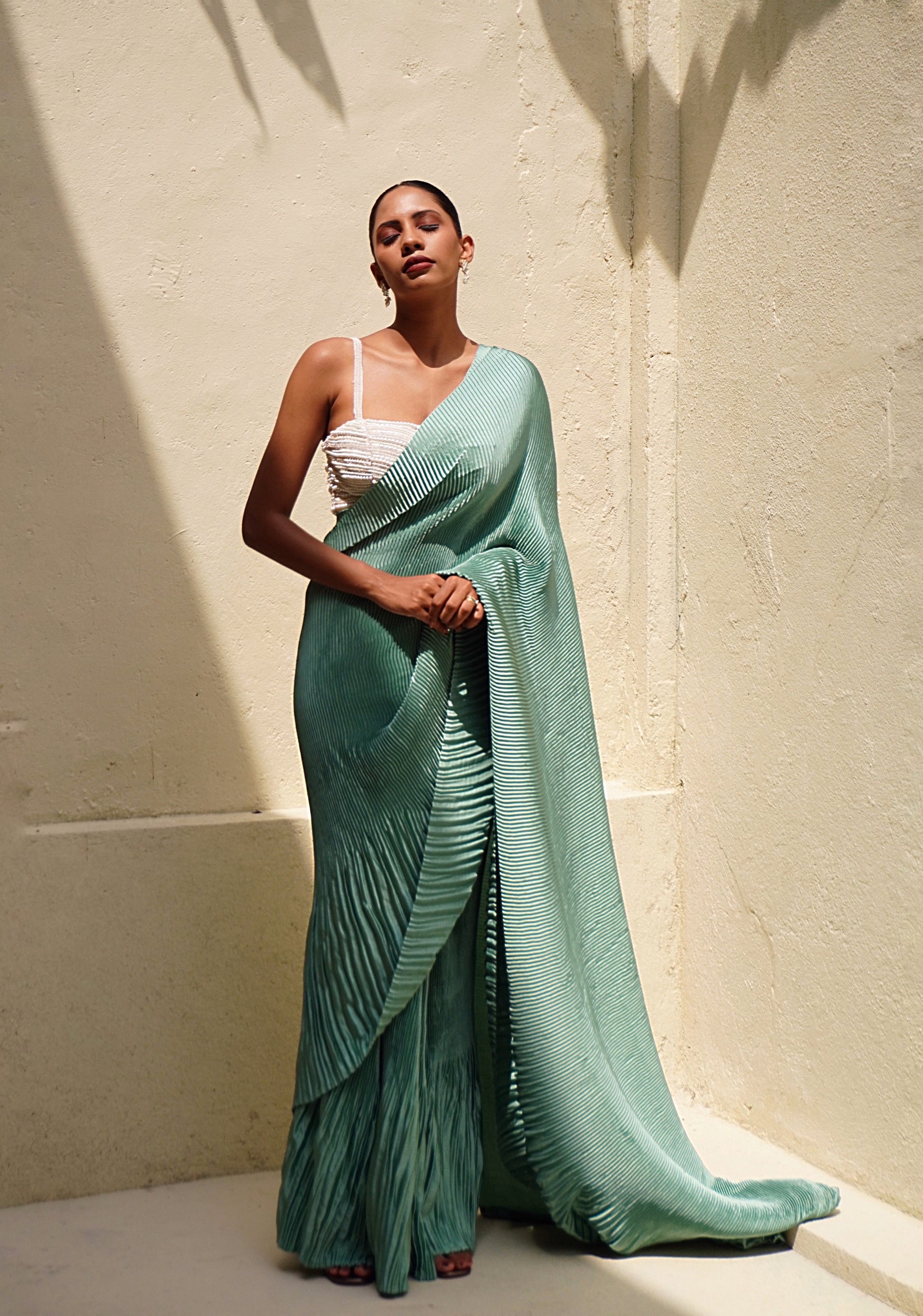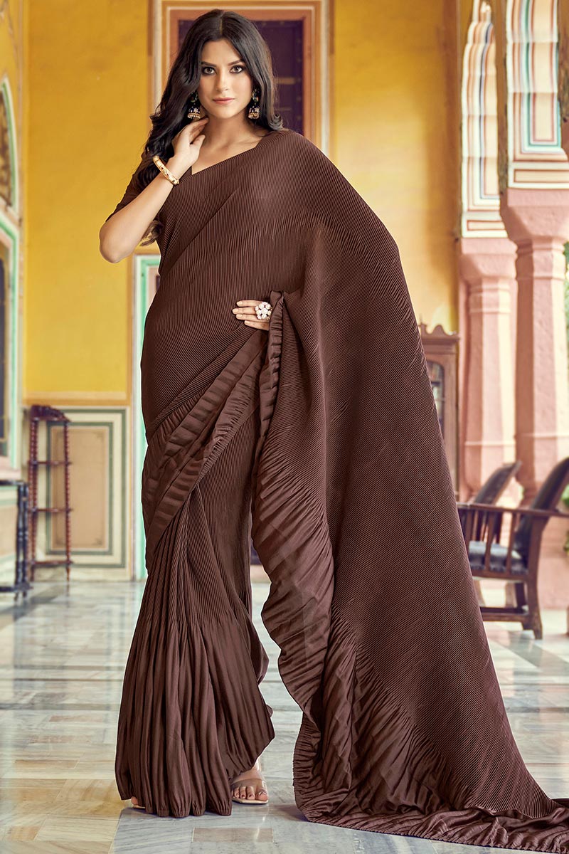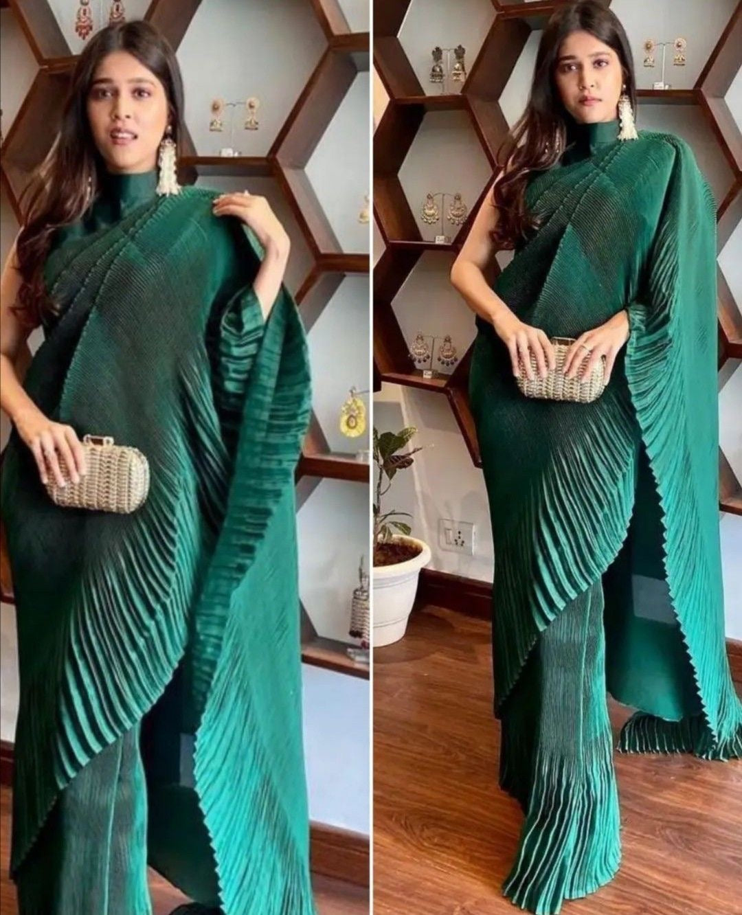 Gorgeous self pleated (crimped) sari in satin georgette.