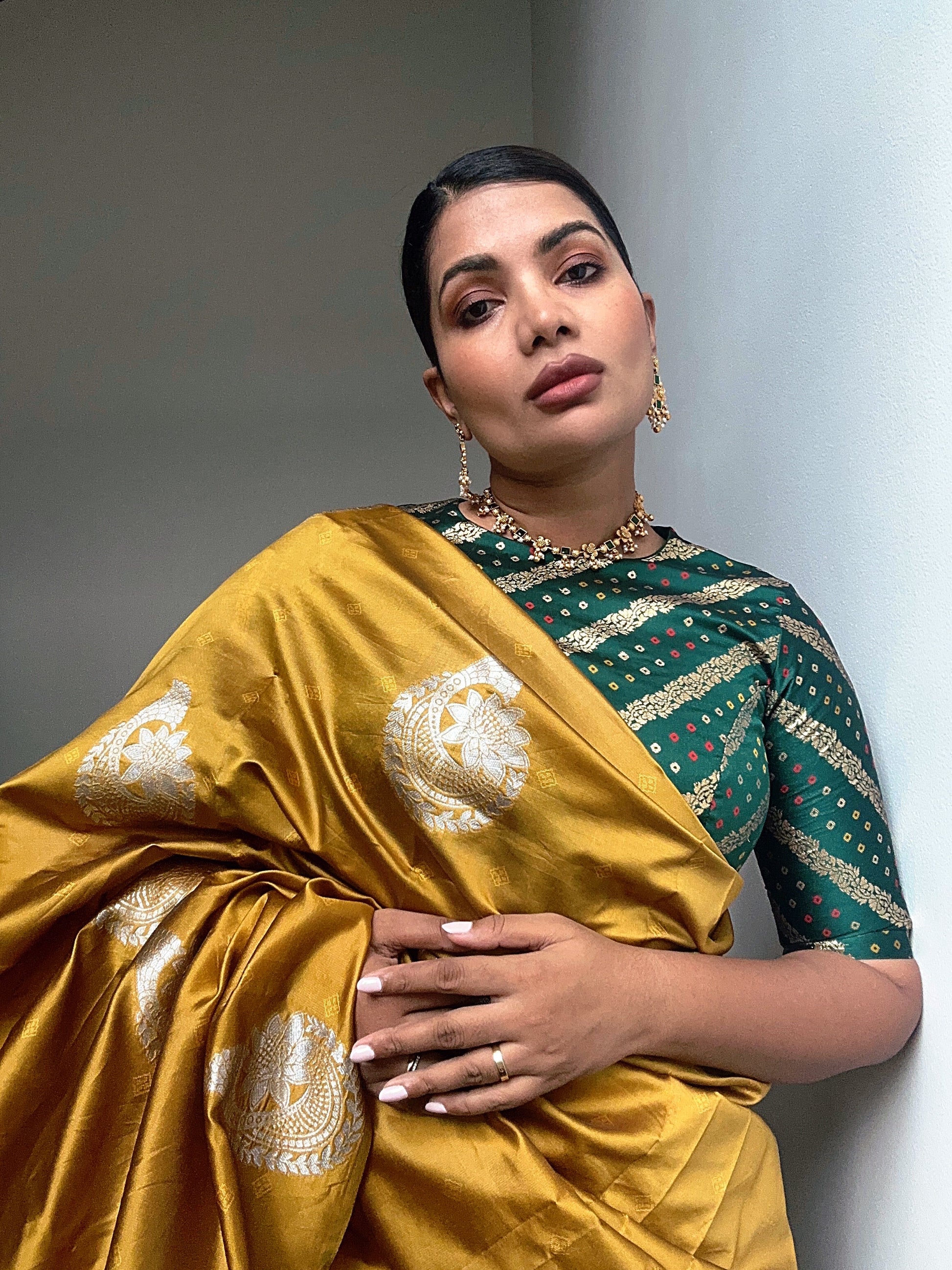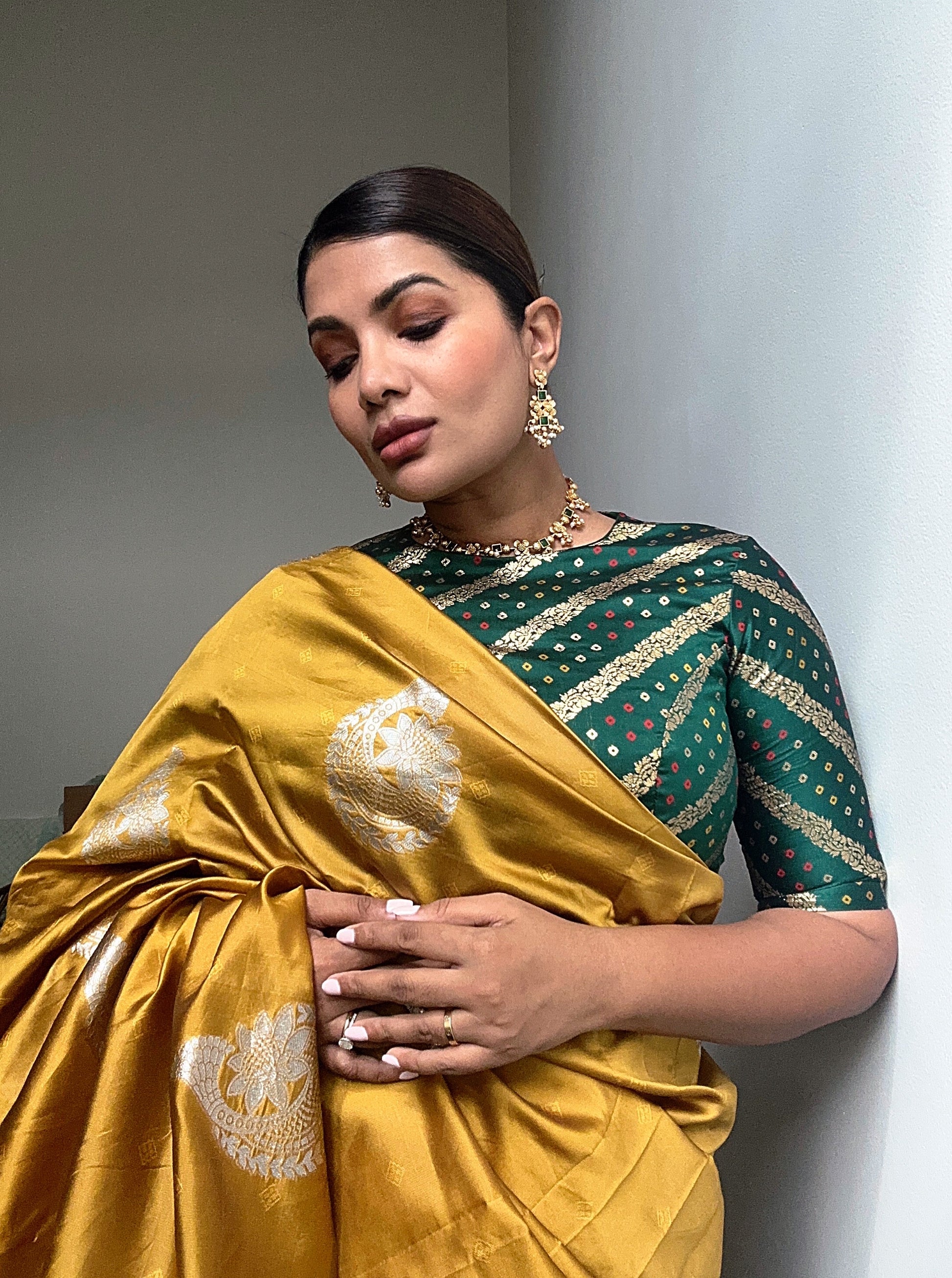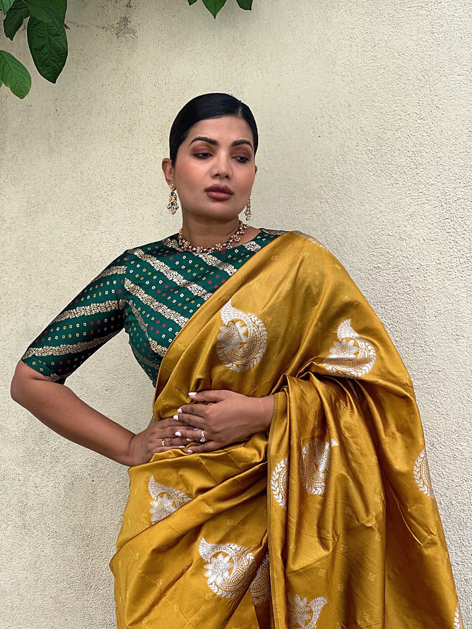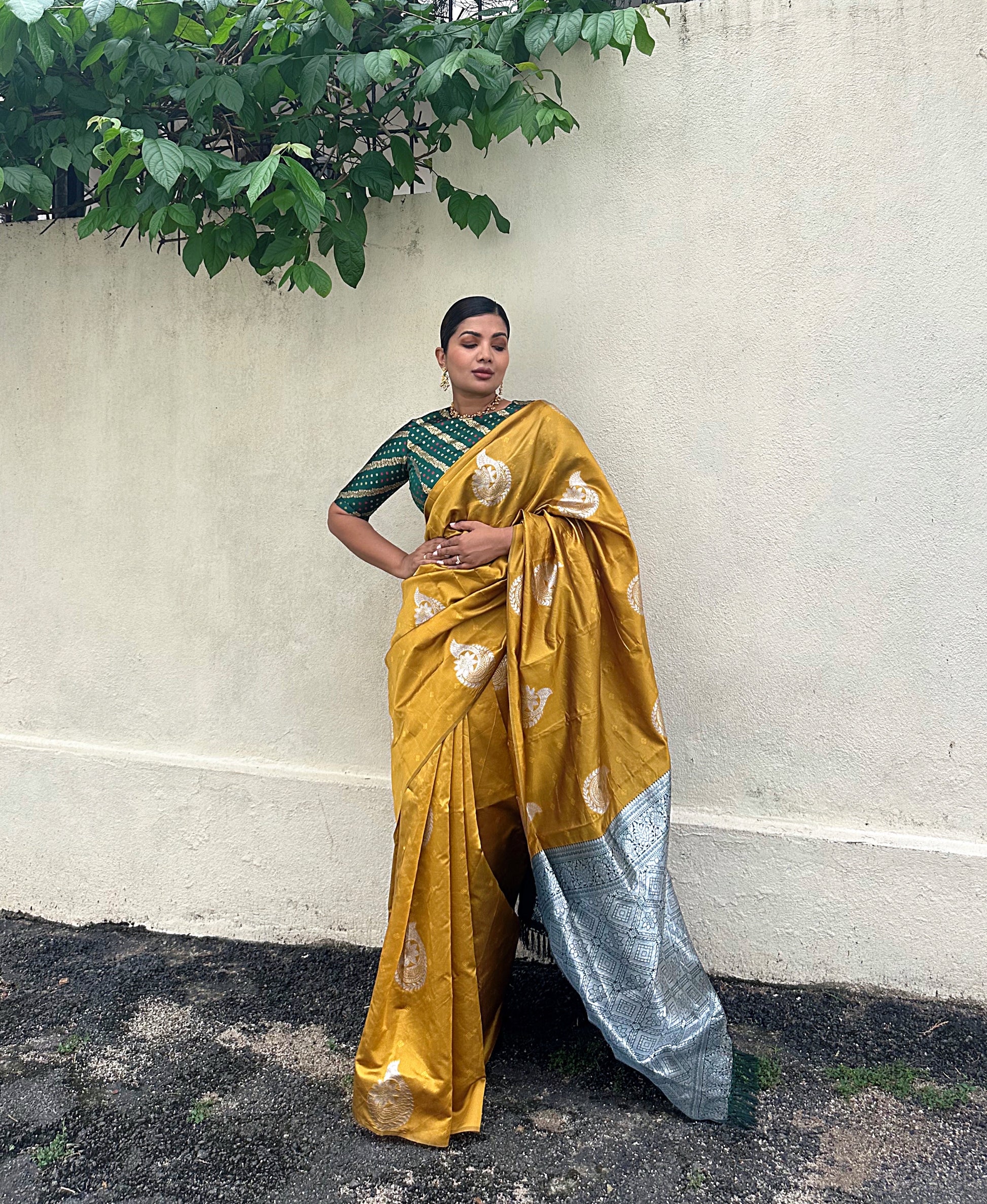 Beautiful silk sari in a golden mustard and deep green color combo.
