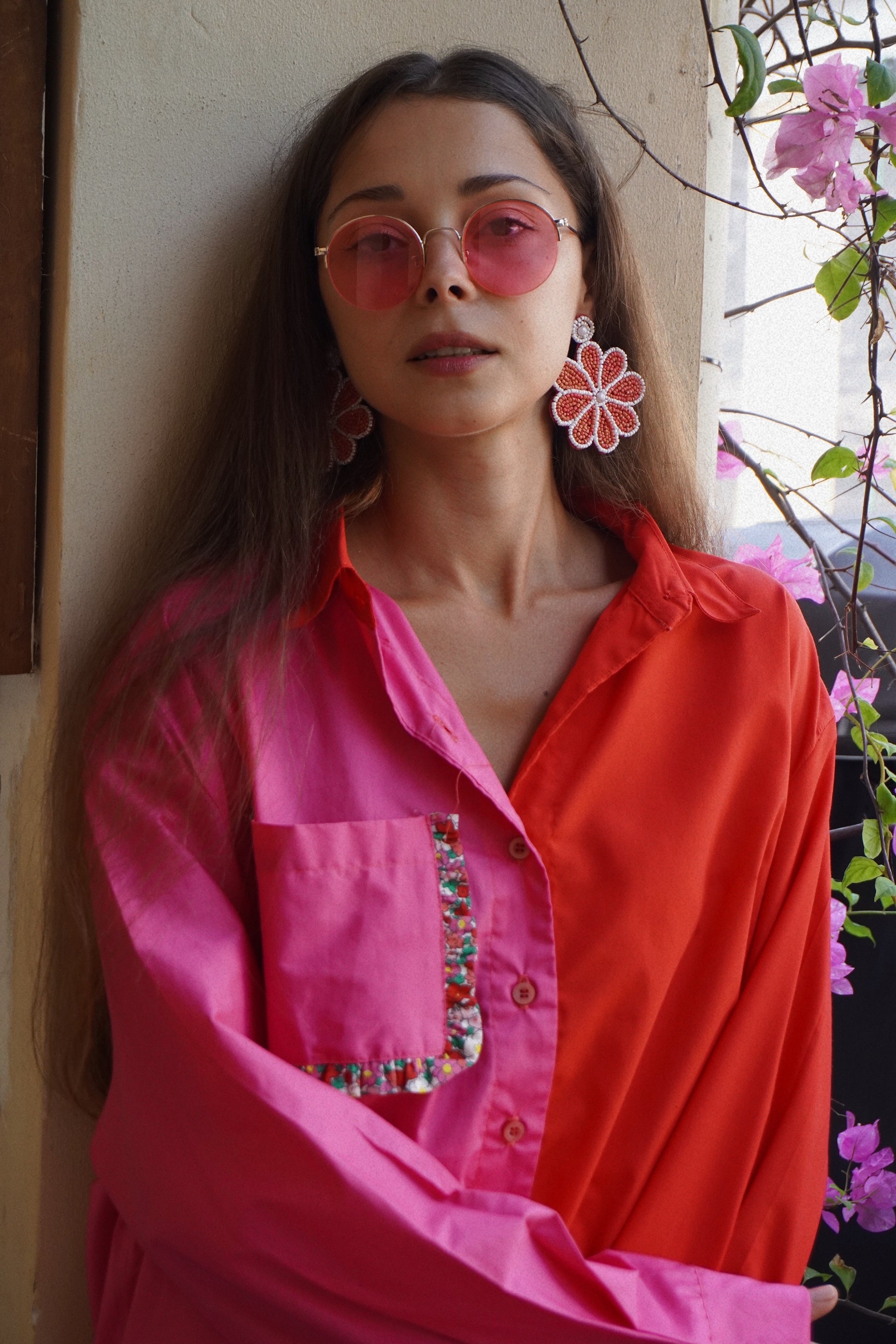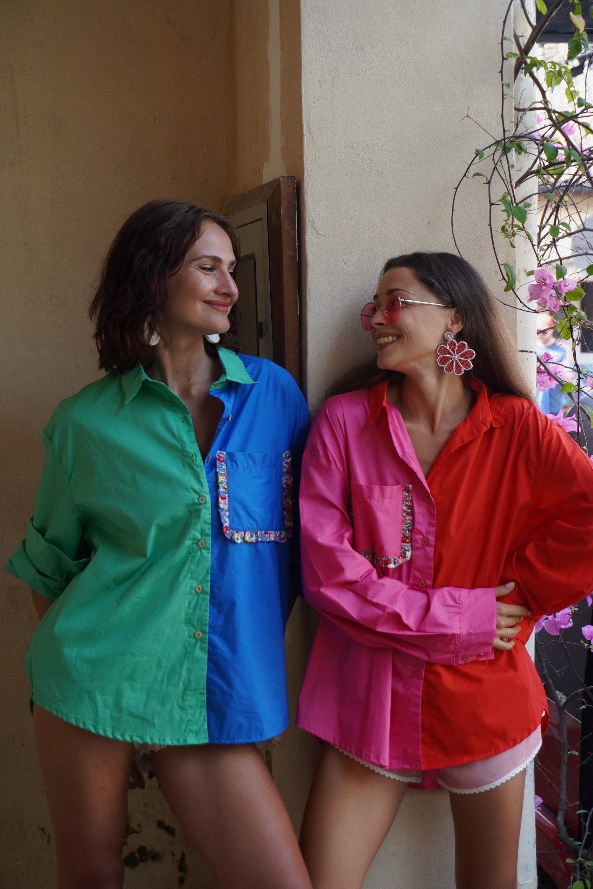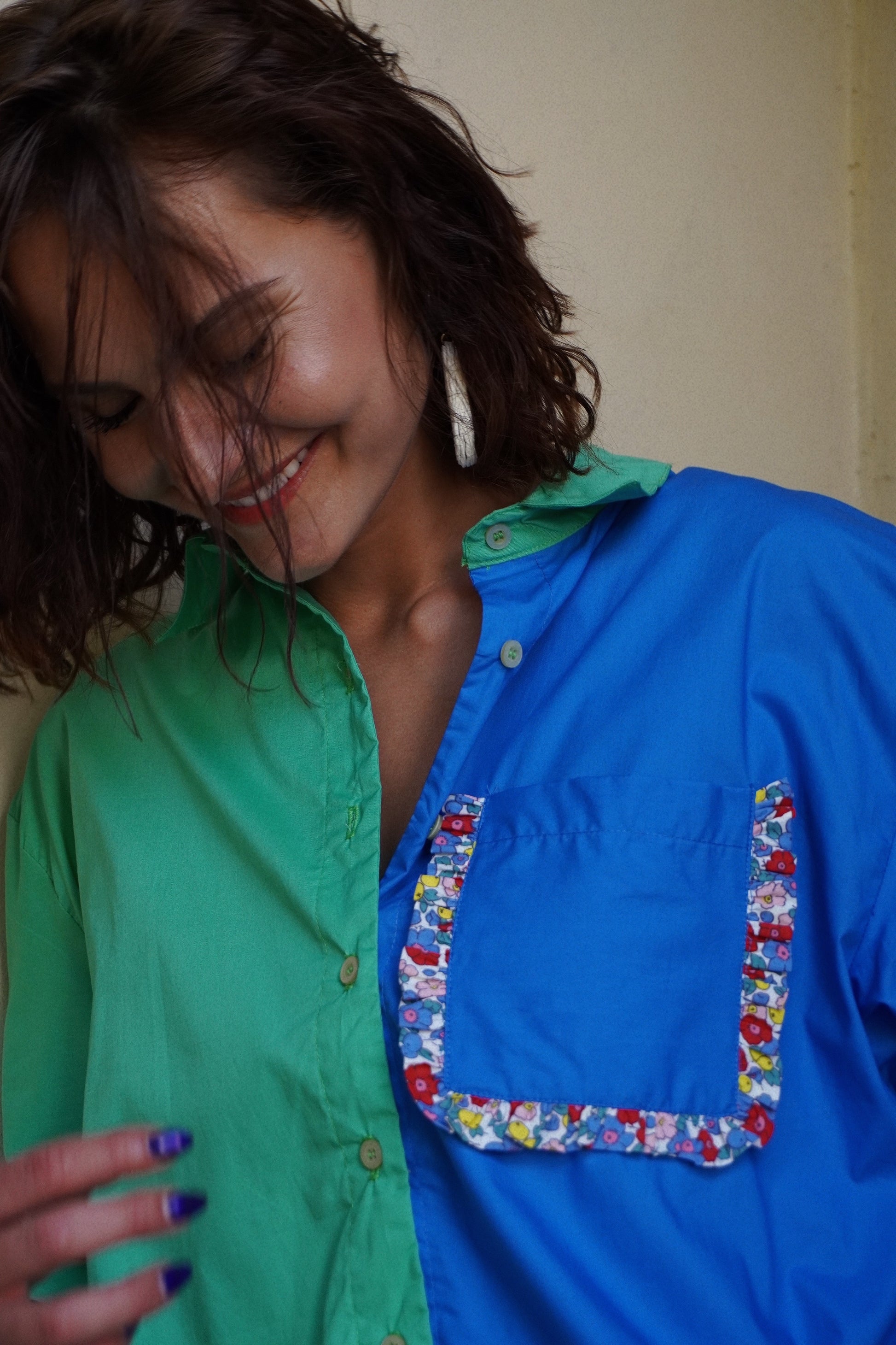 This is a cotton half half color block tailored shirt. The beautiful floral ruffle detail on the pockets make it pop. Love the vibrant palette and the blending of perfect opposing colors for that summer look.
