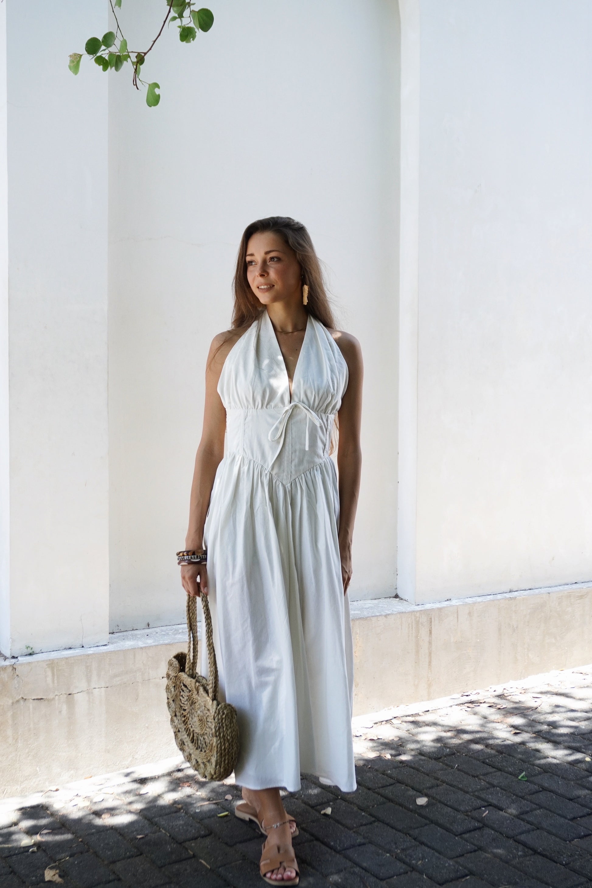 Soft bone corset structure that flatters and shapes the body and a halter neck design really pulling in the posture and making the body appear elongated. Bow detail at the front to elevate the look further. A crisscross tie up detail at the back helps really cinch in the waist.