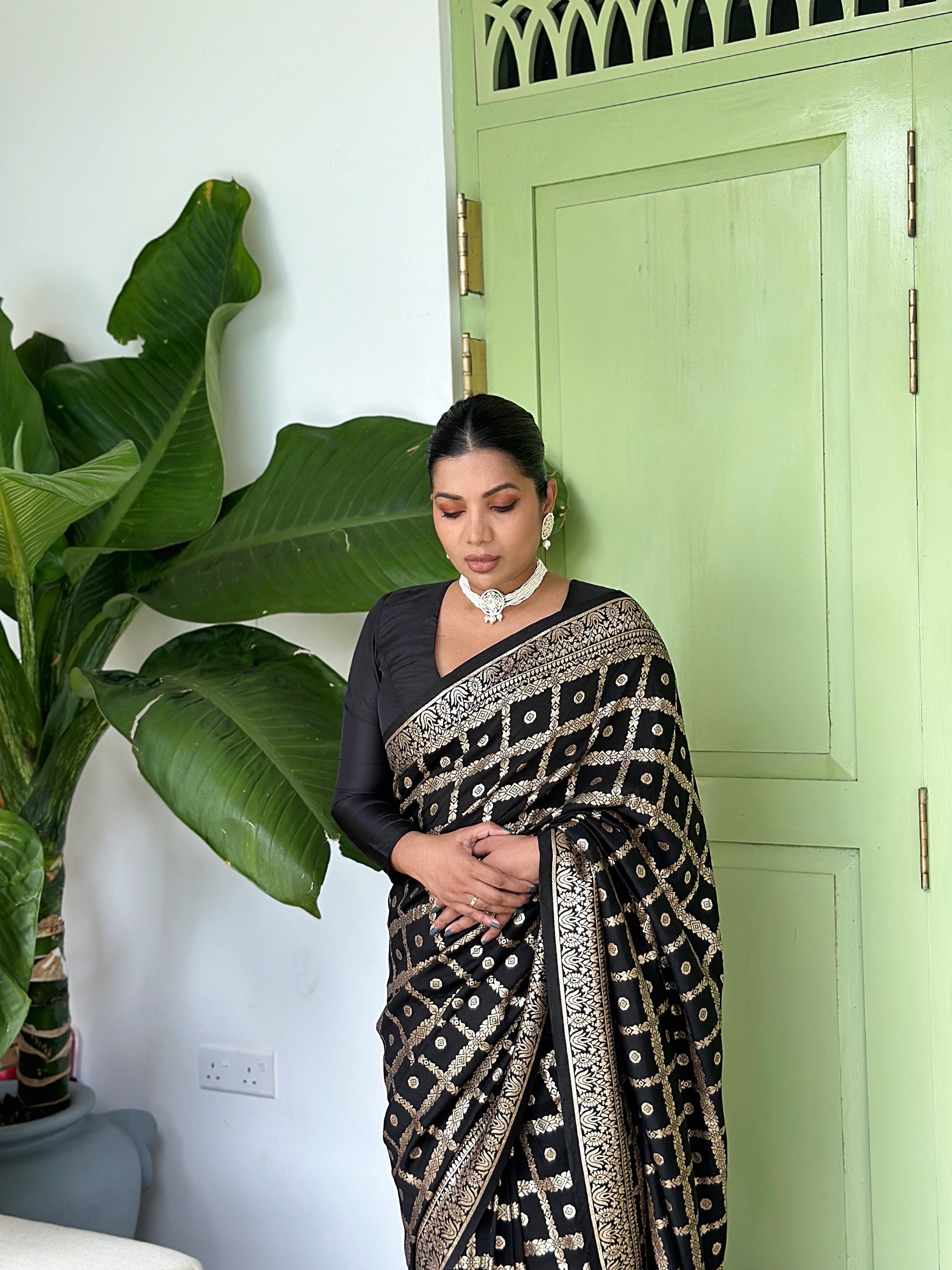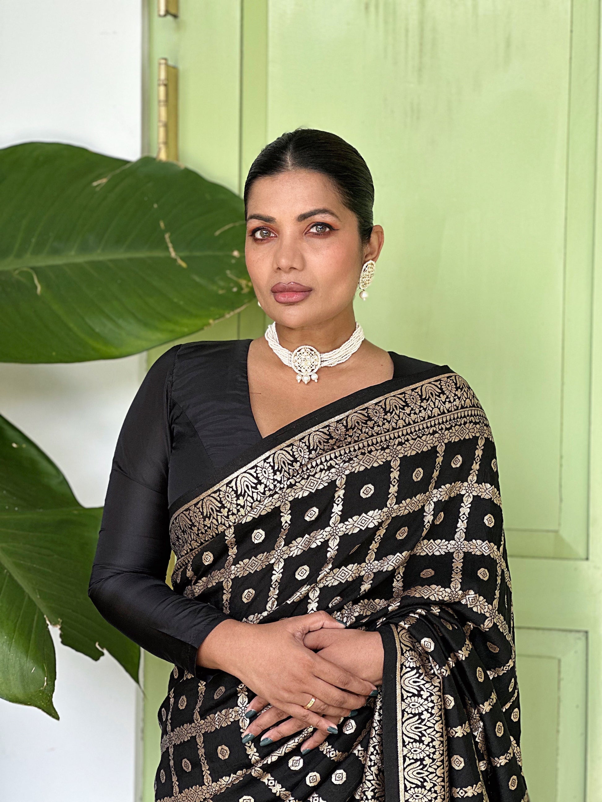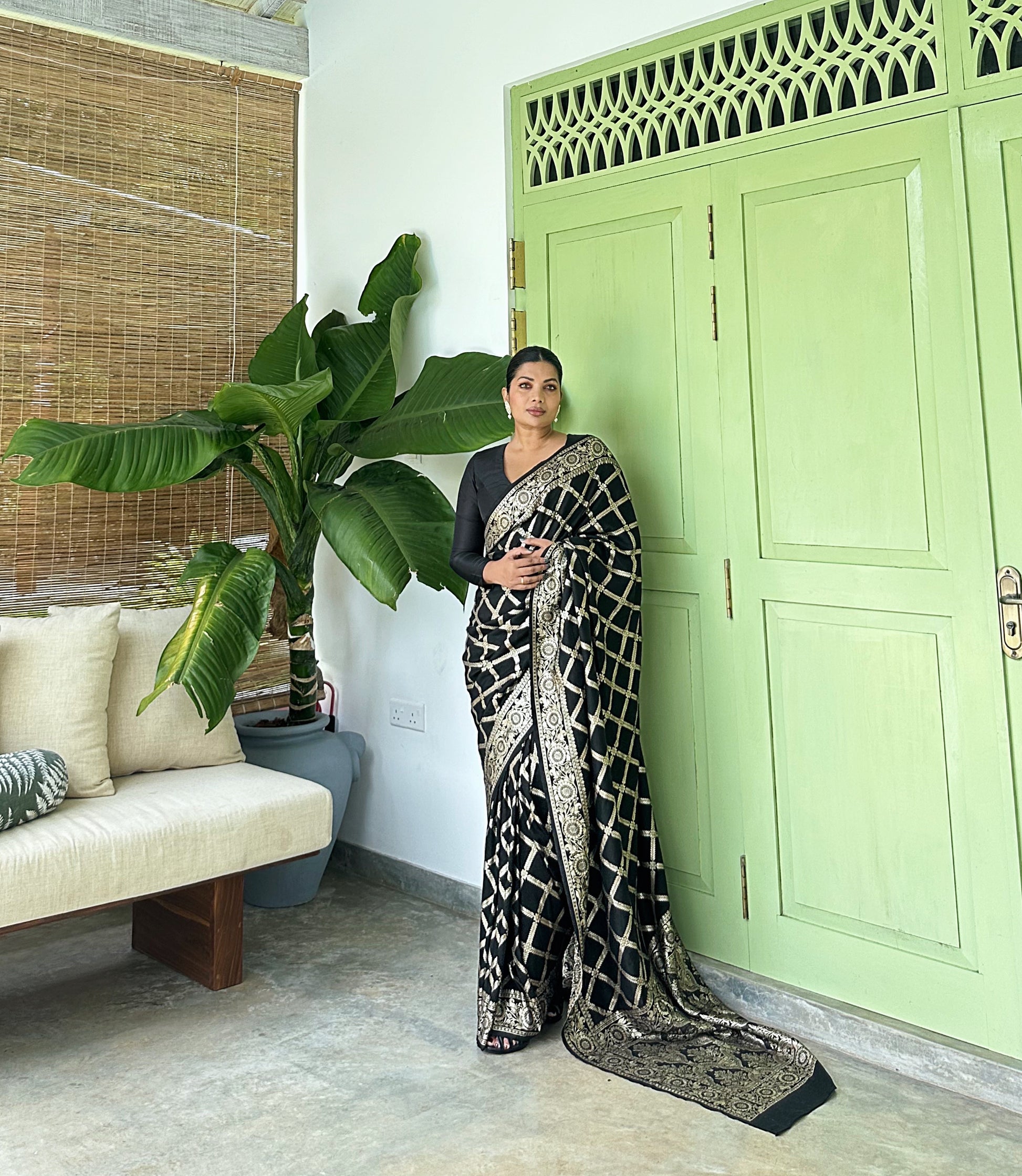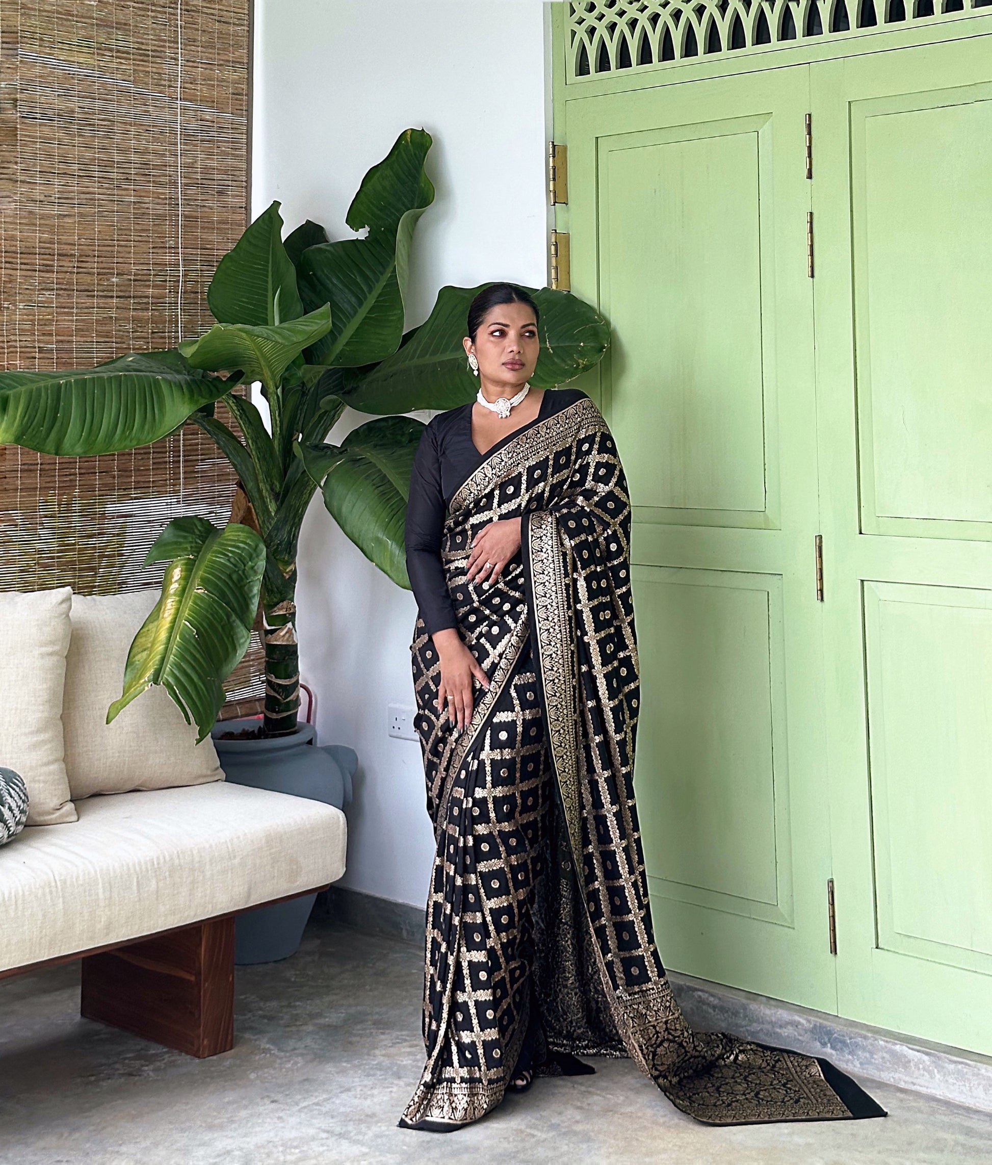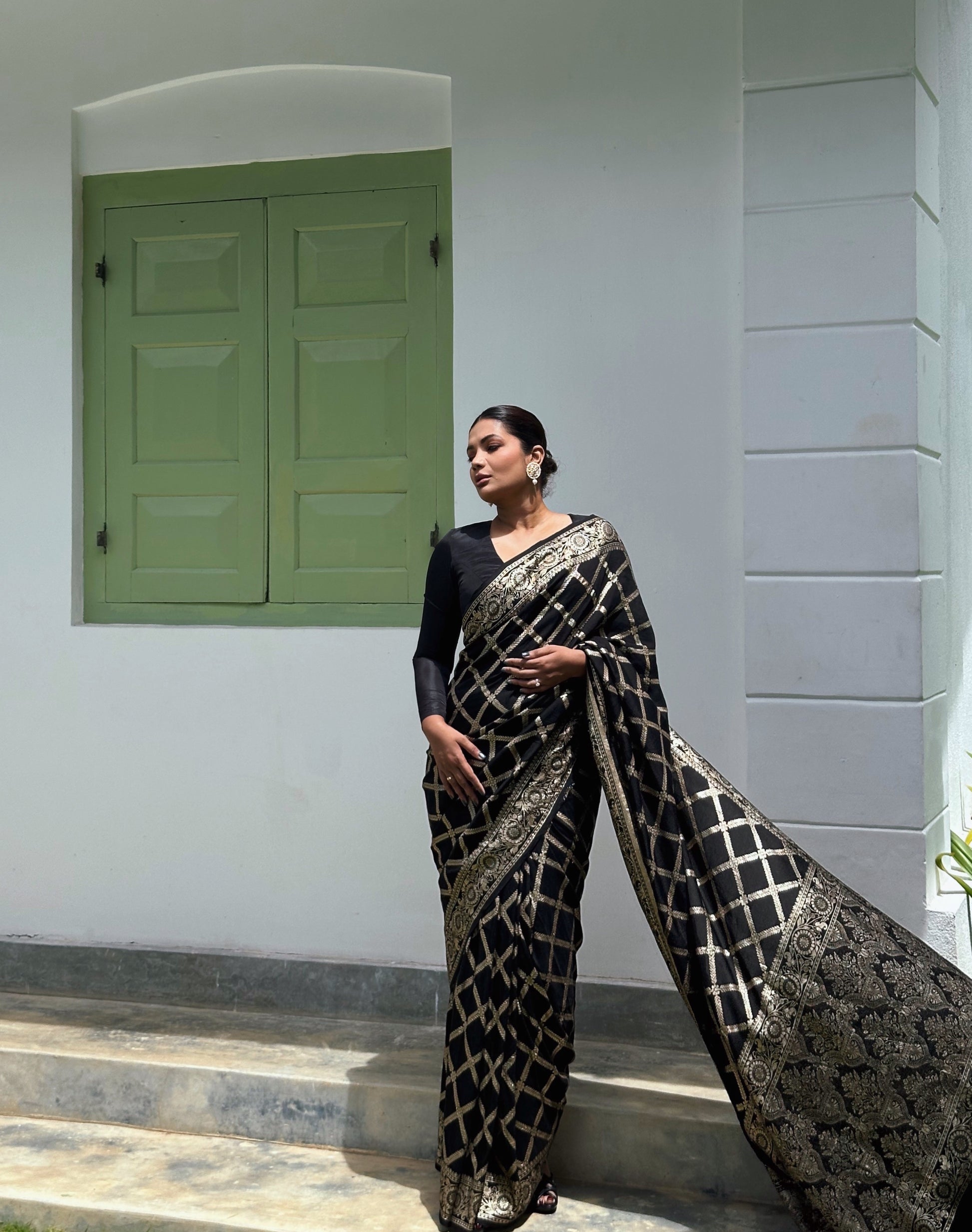 KALINDA is a beautiful rich silk cotton blended sari with a metallic weave that is absolutely breathtaking. This sari feels light weight but feels luxurious the moment you drape it on.