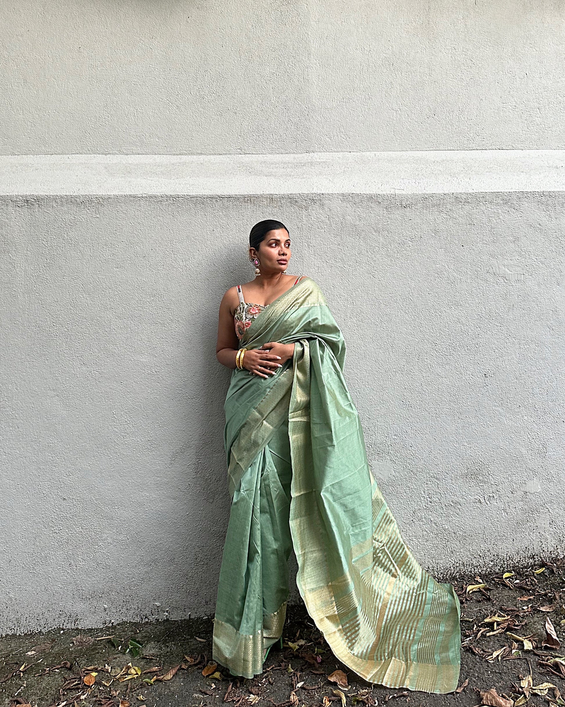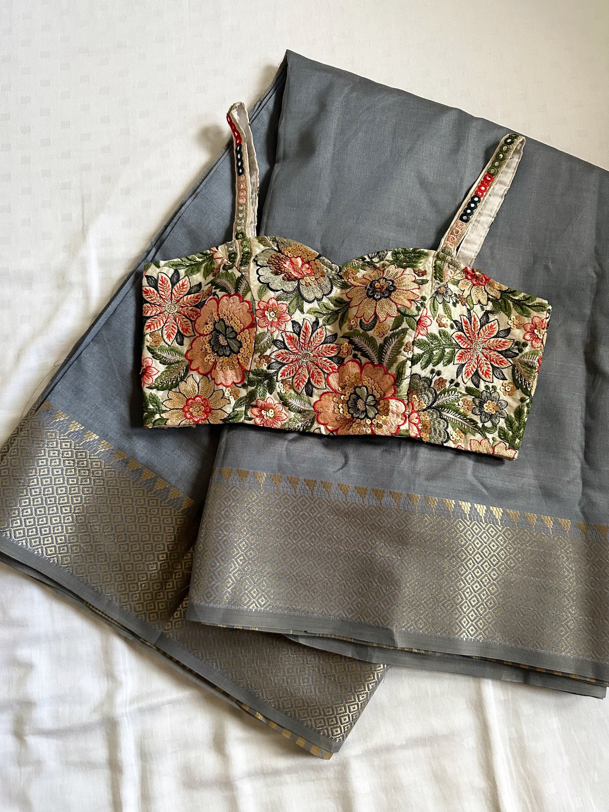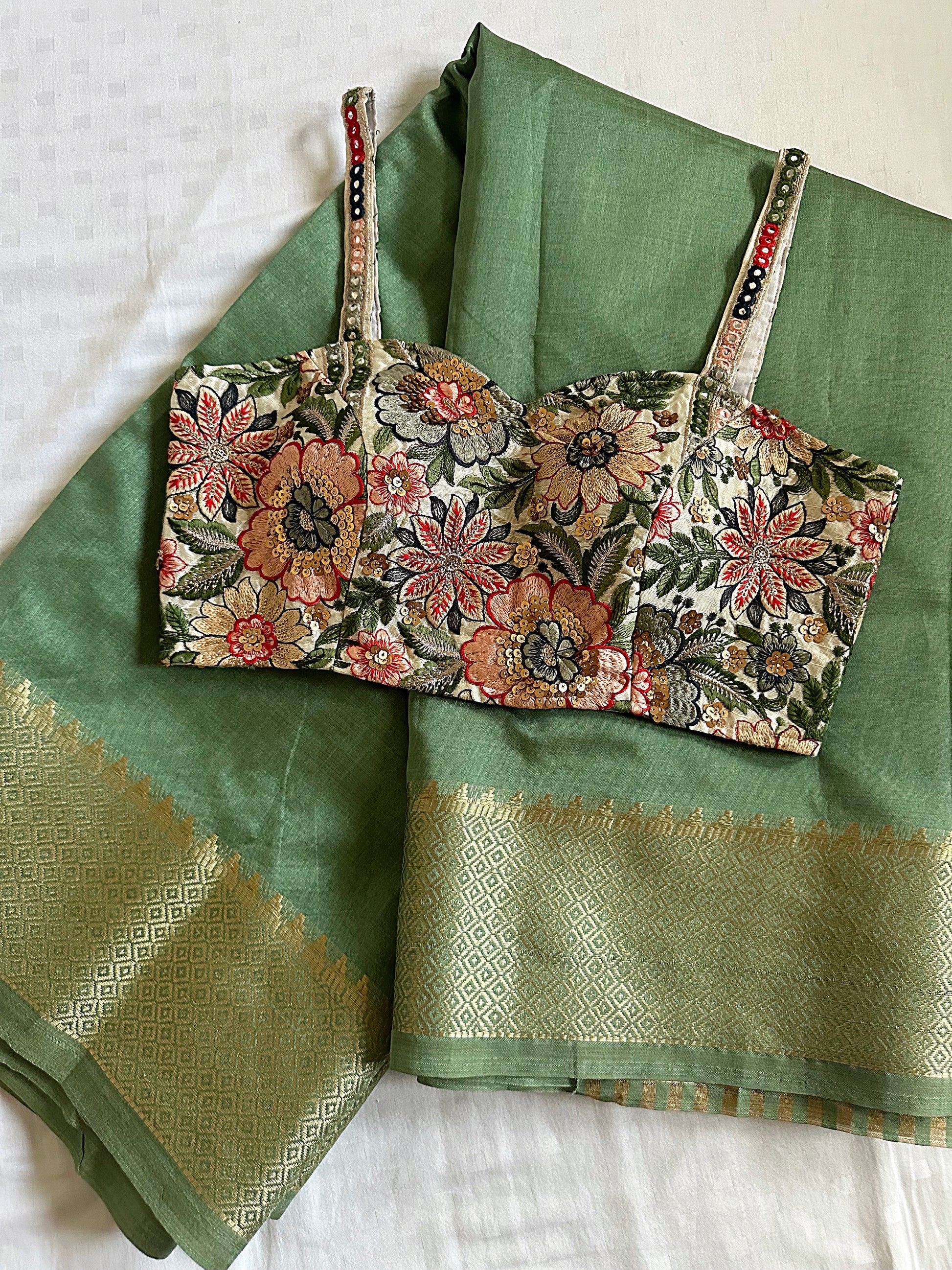 -Matching silk blouse fabric in the same color as the sari with gold weaving matching the sari pallu for a more cohesive and traditional look. (This option is unstitched)
