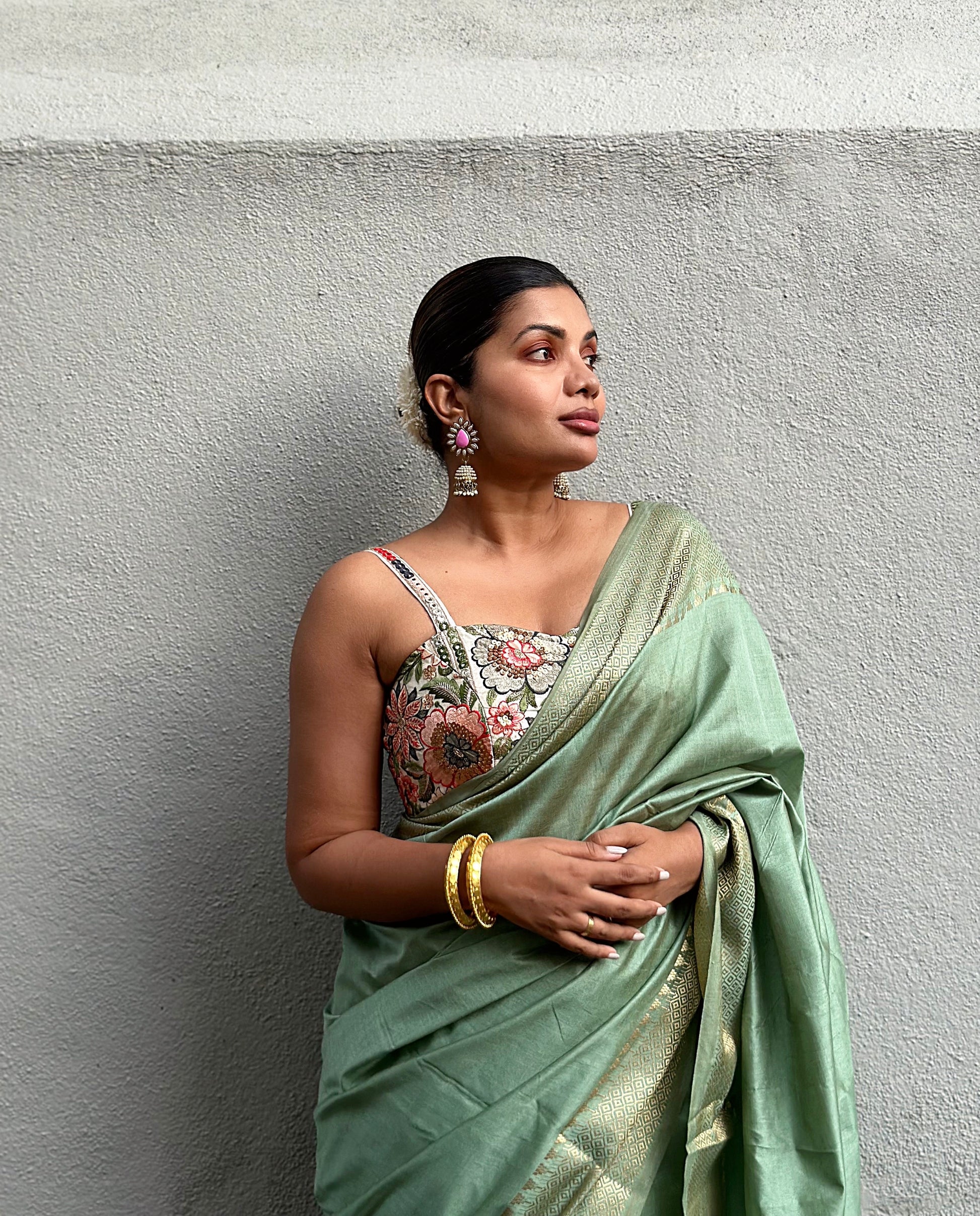 -A fully embroidered and tailored PRITAM blouse which elevates the look to luxurious