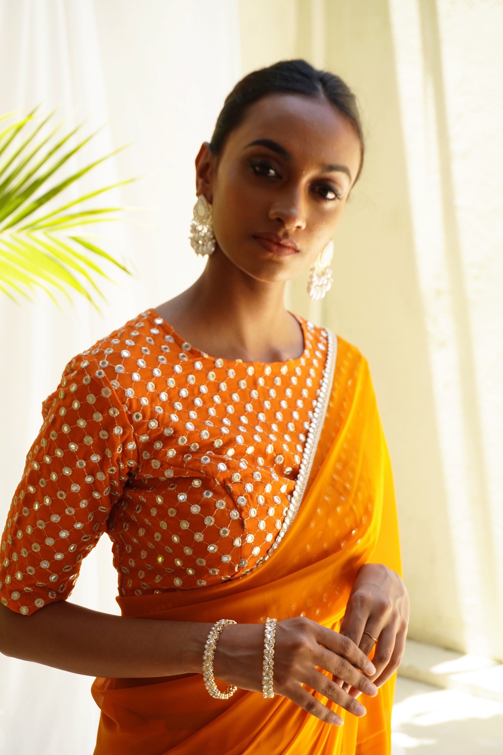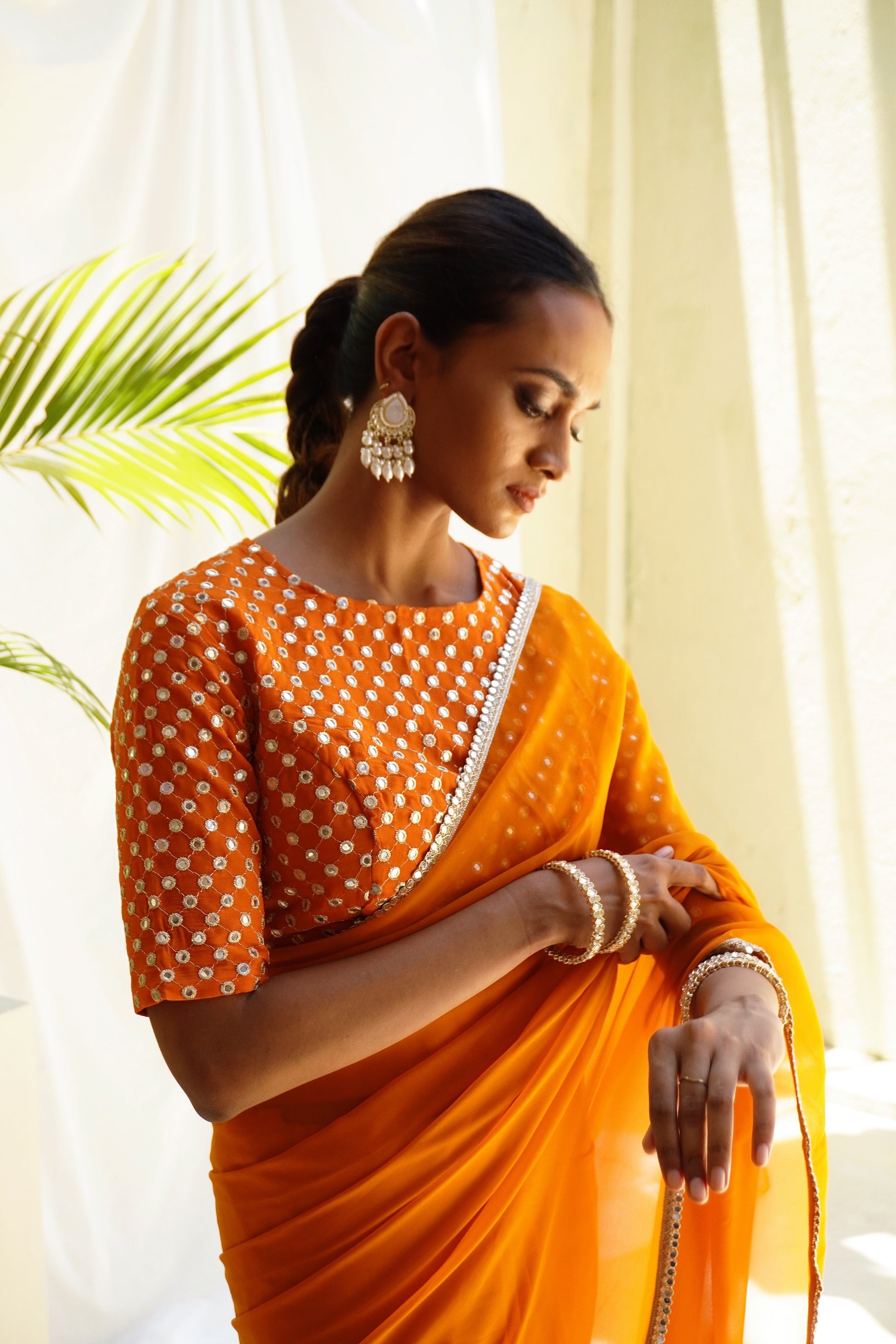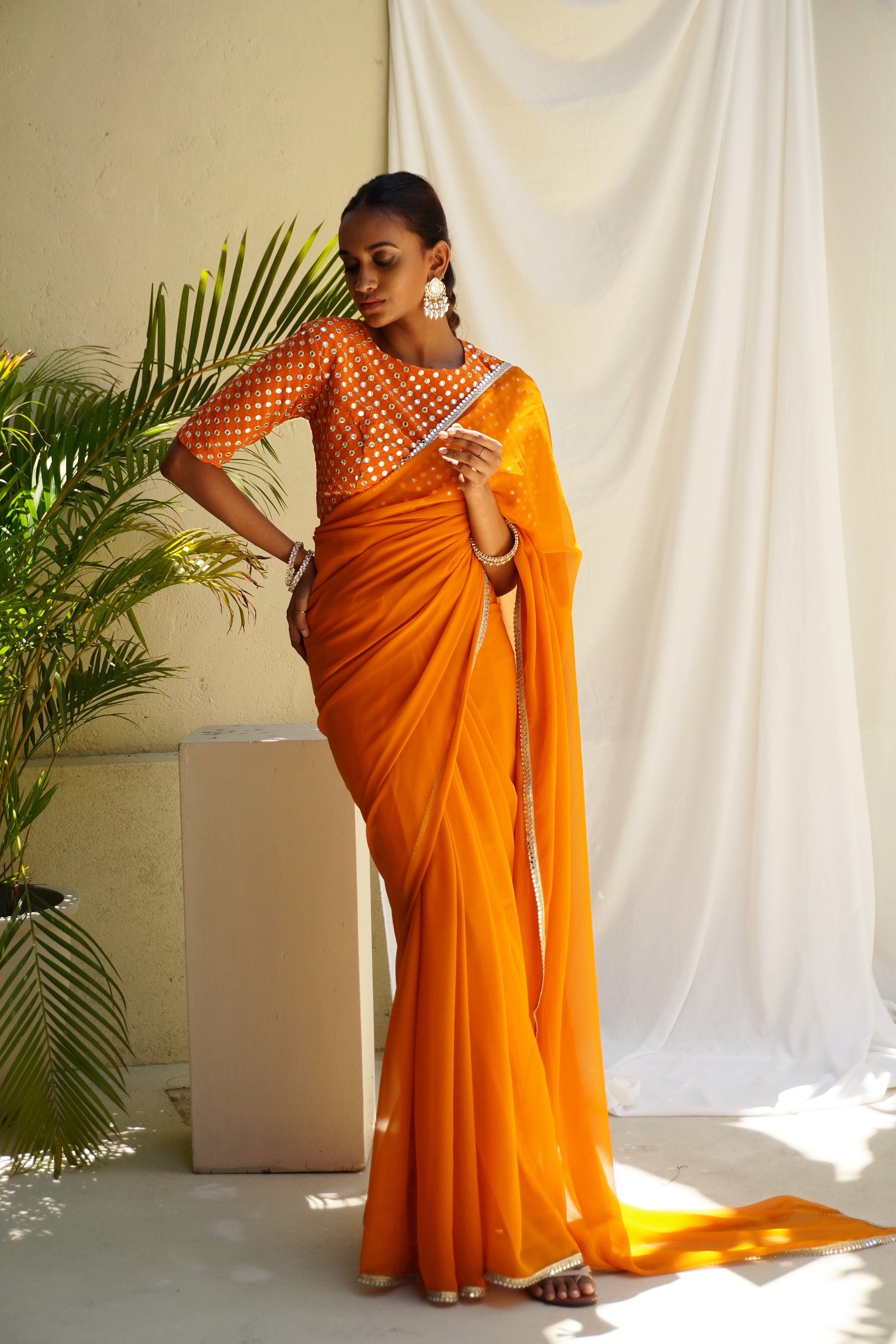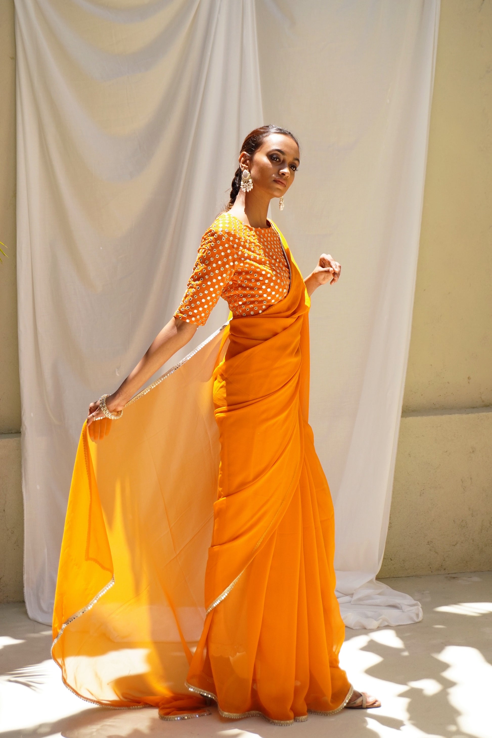 It’s a bright orange color georgette sari with a a 100% original mirror work border.