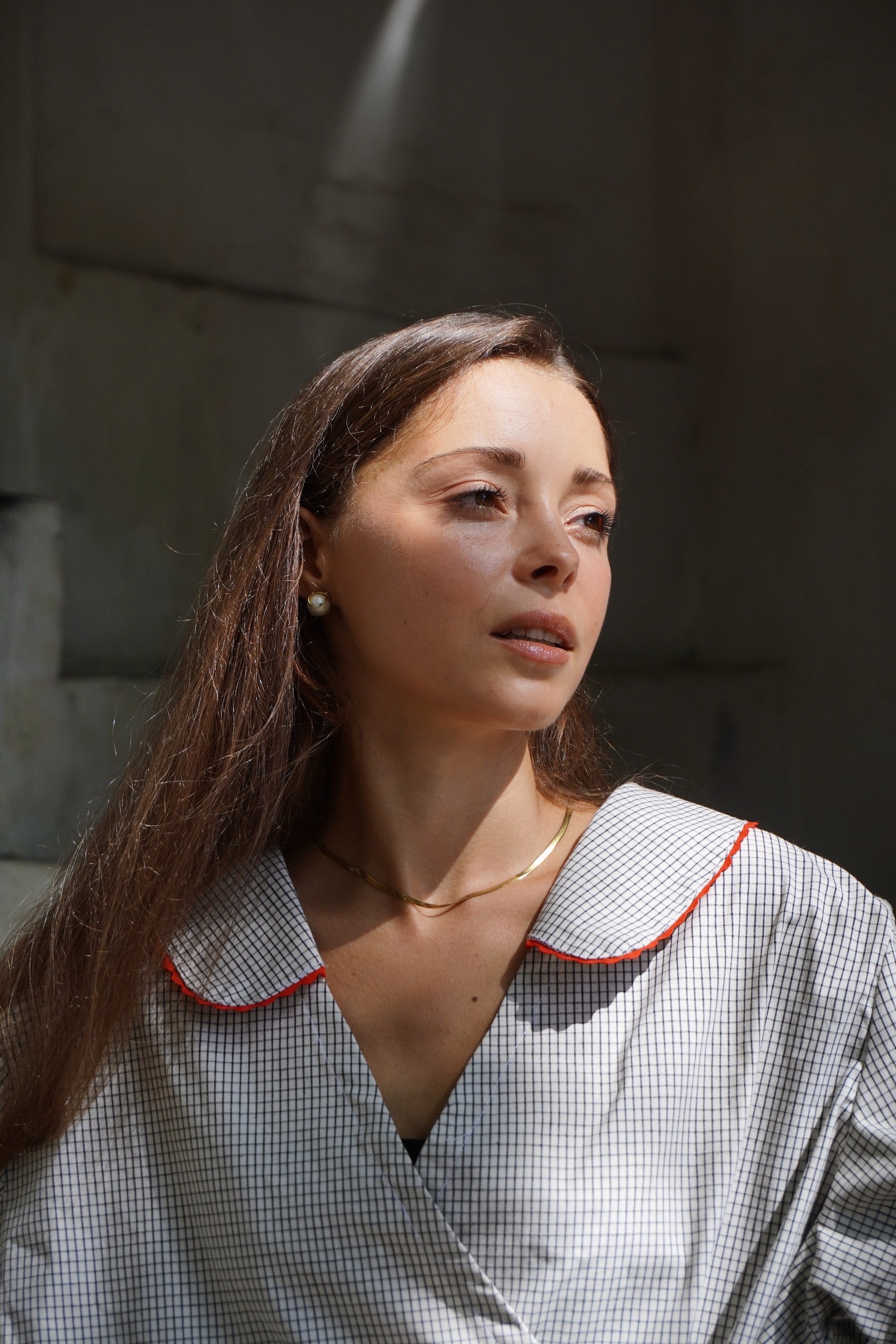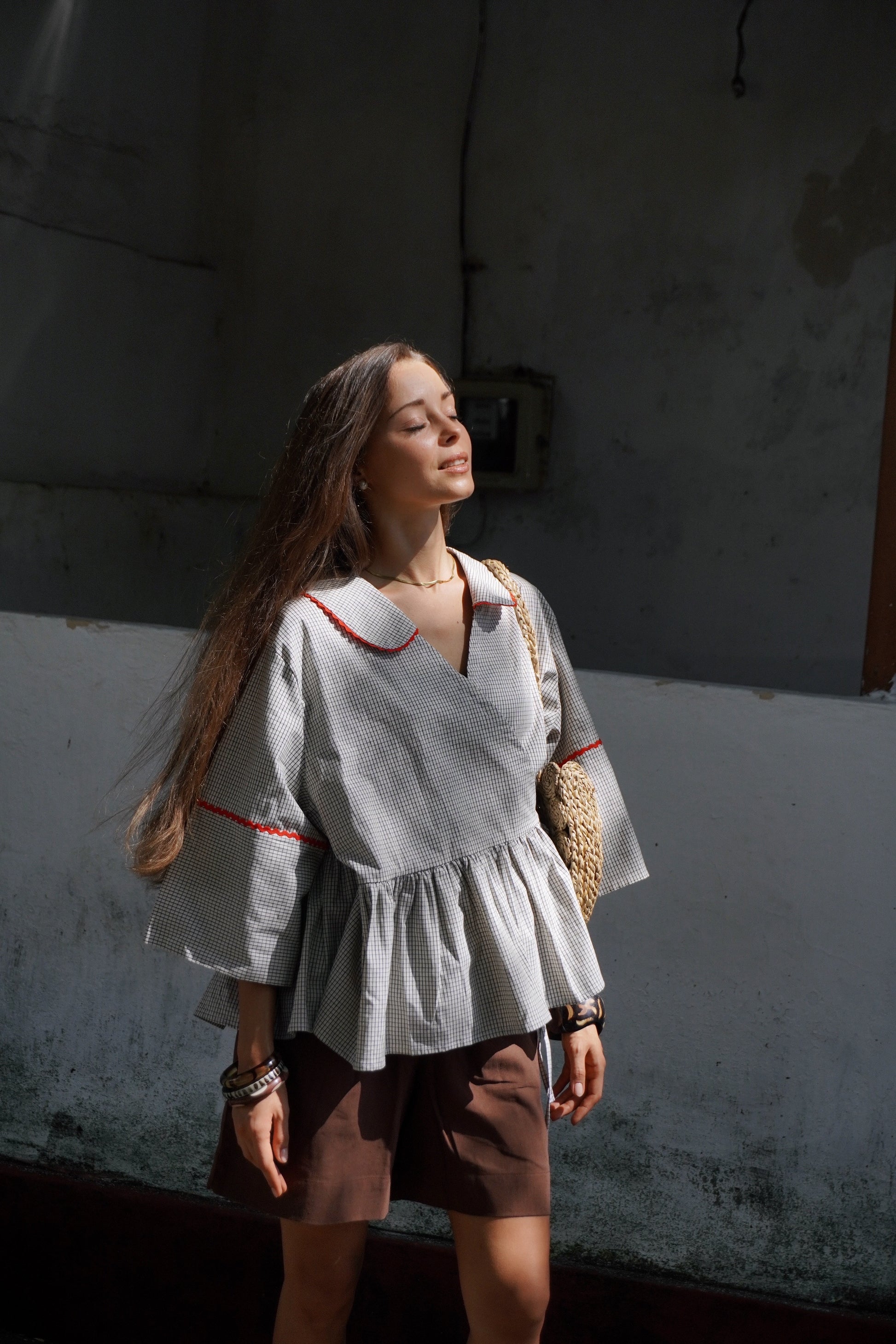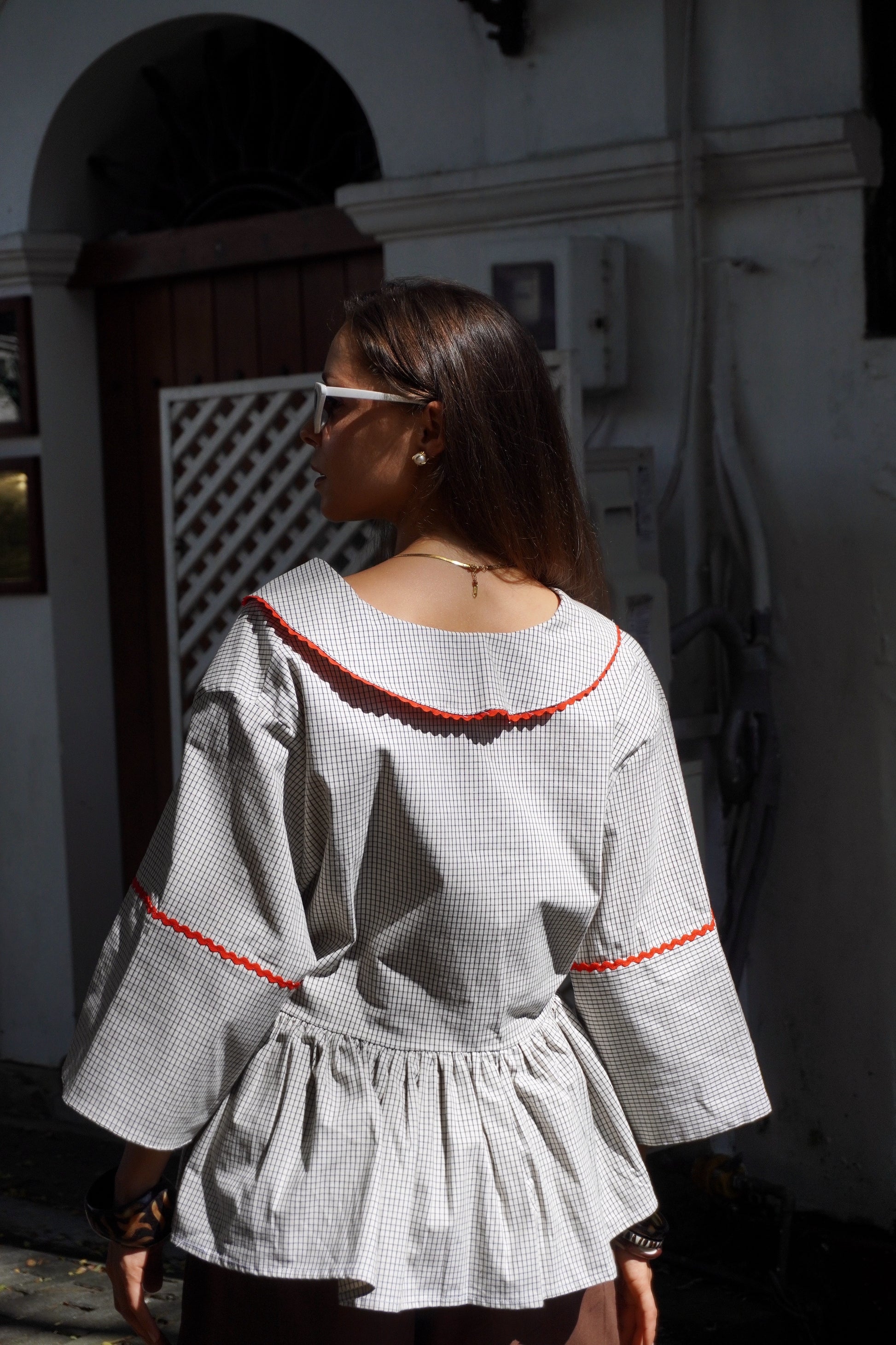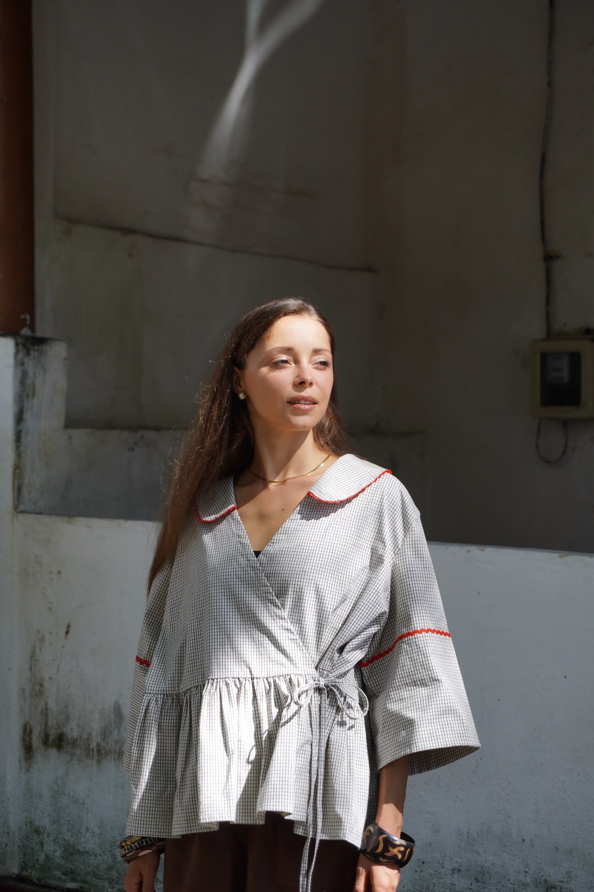 NORD is such a well crafted, perfectly tailored shirt. We love the wrap detail of this 100% pure linen checkered look. We’ve got red scallop details accentuating the checks of the shirt.
