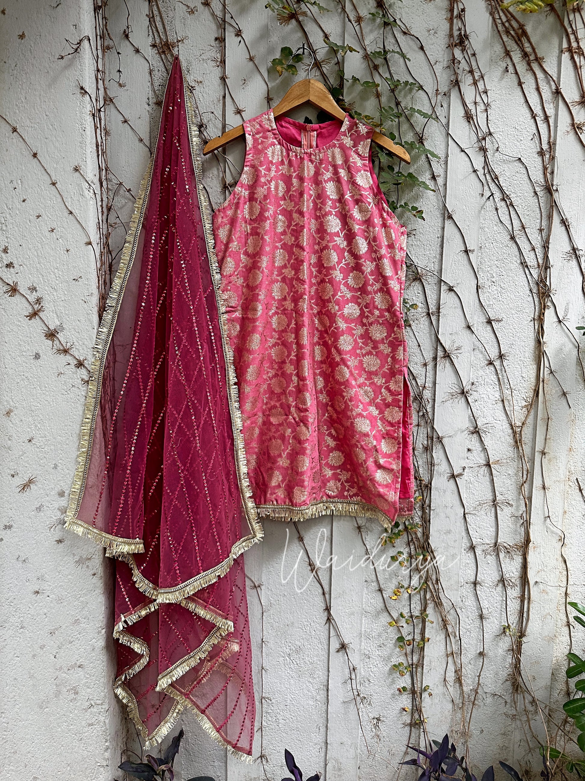 Matching dupatta is a fully thread and sequin embroidered soft net in deep pink with a gold frilly border matching the suit top.