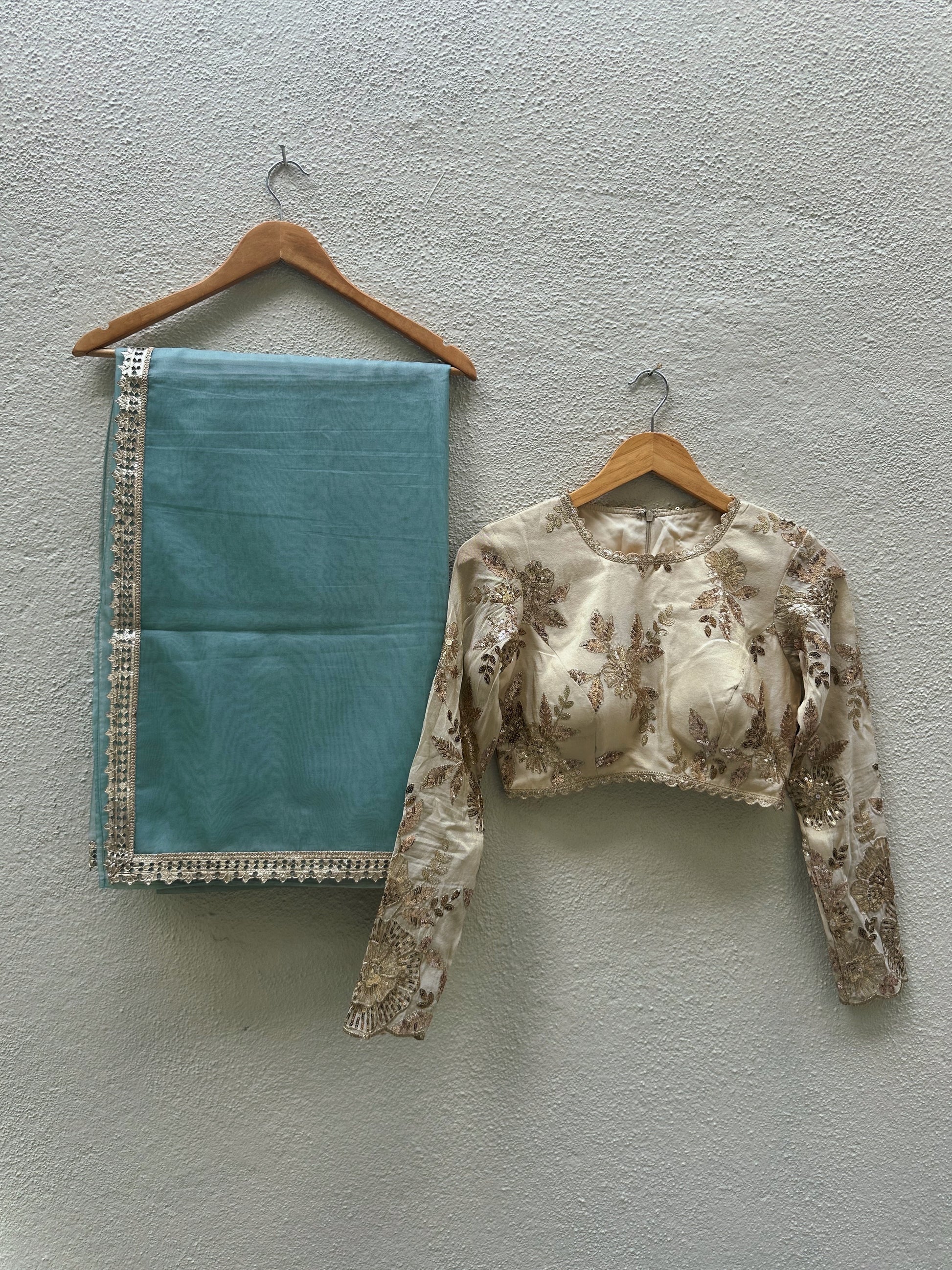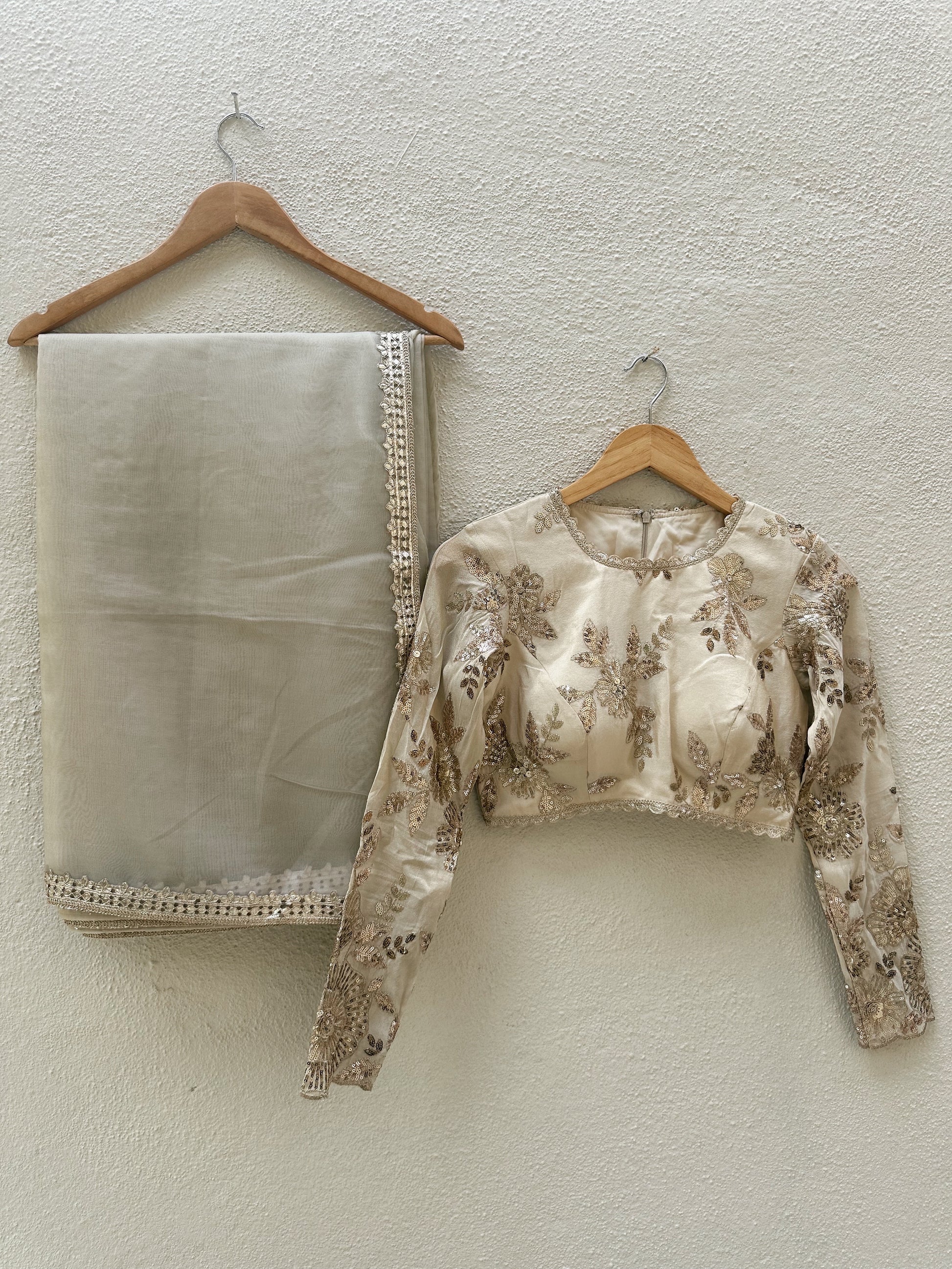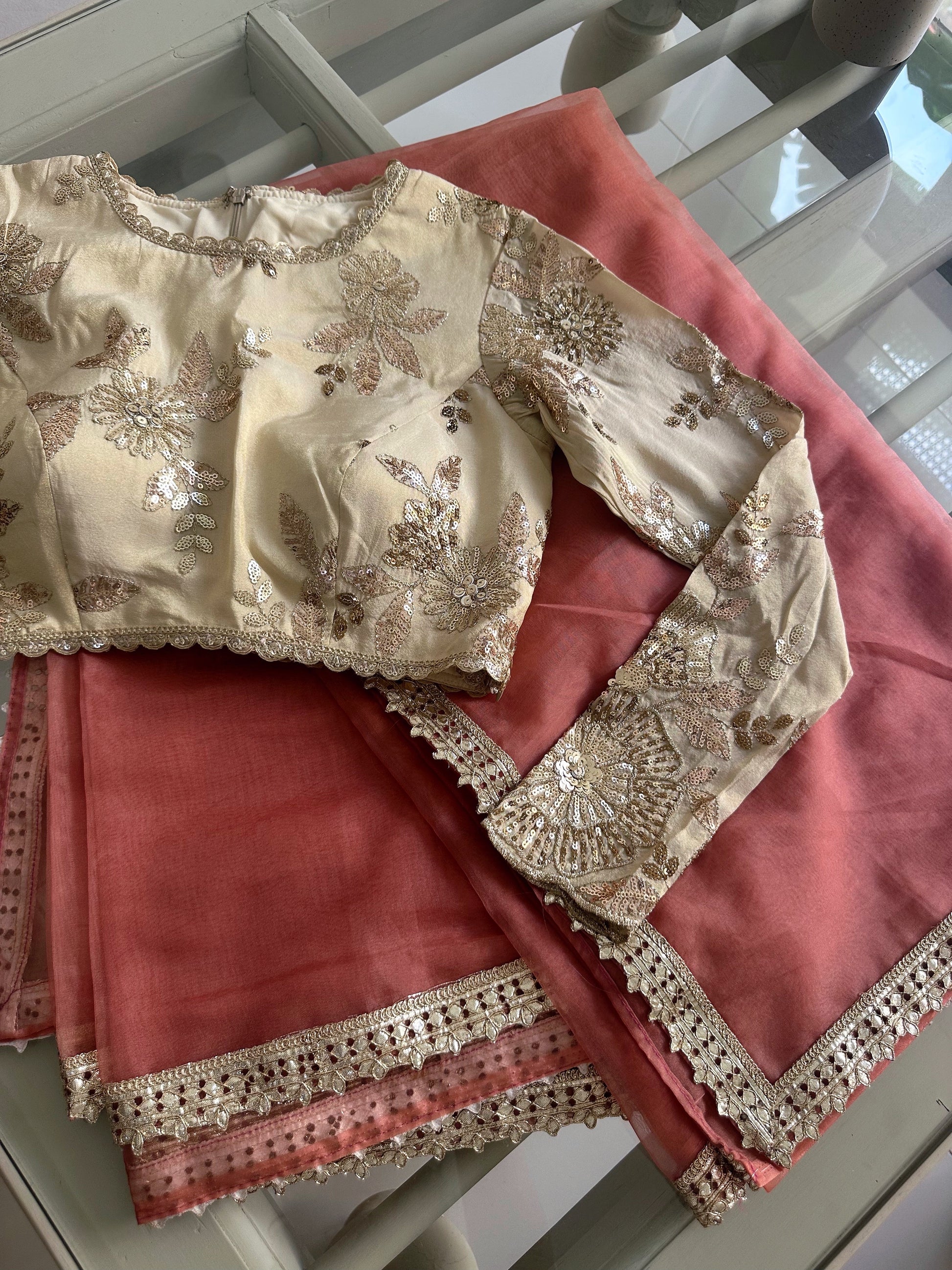 The blouse is the feature in the design. The pure silk blouse with heavy embroidery is embellished with sequin and gold thread work and tailored to go.