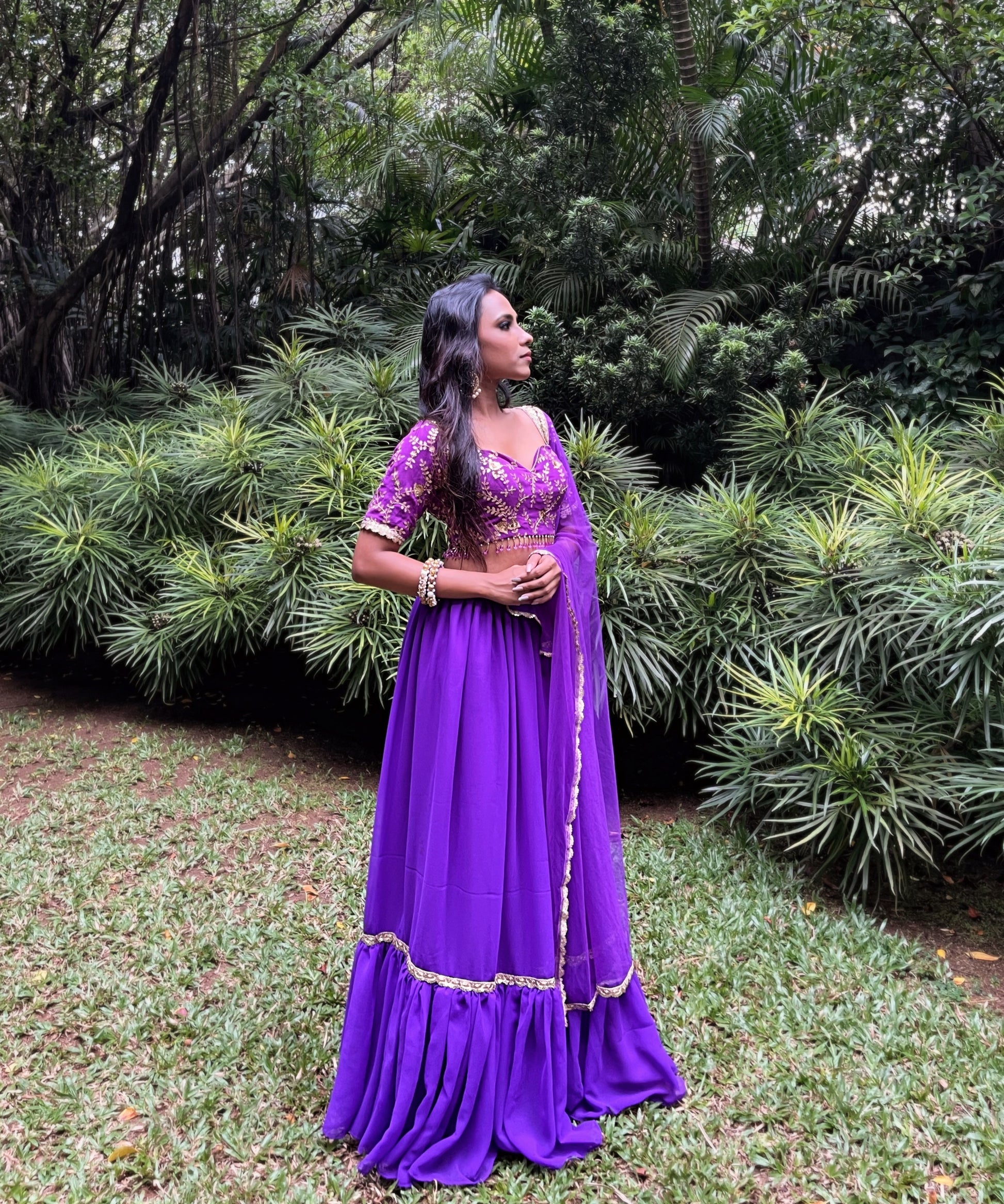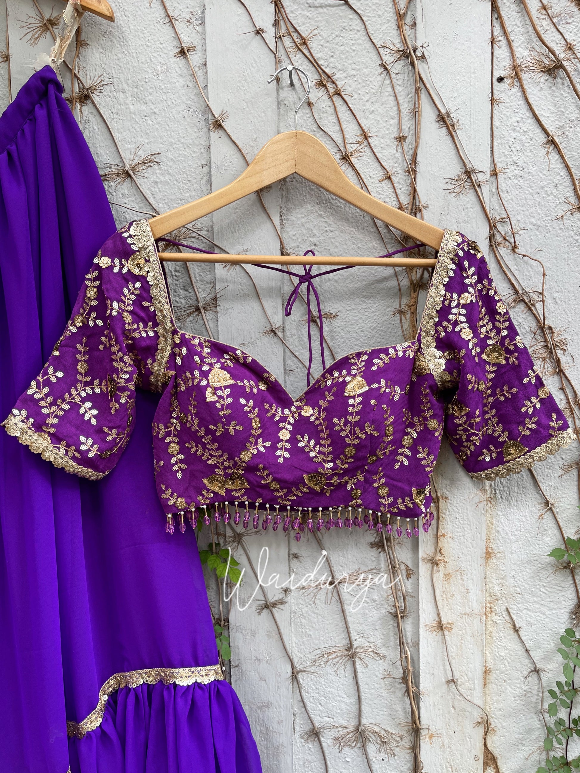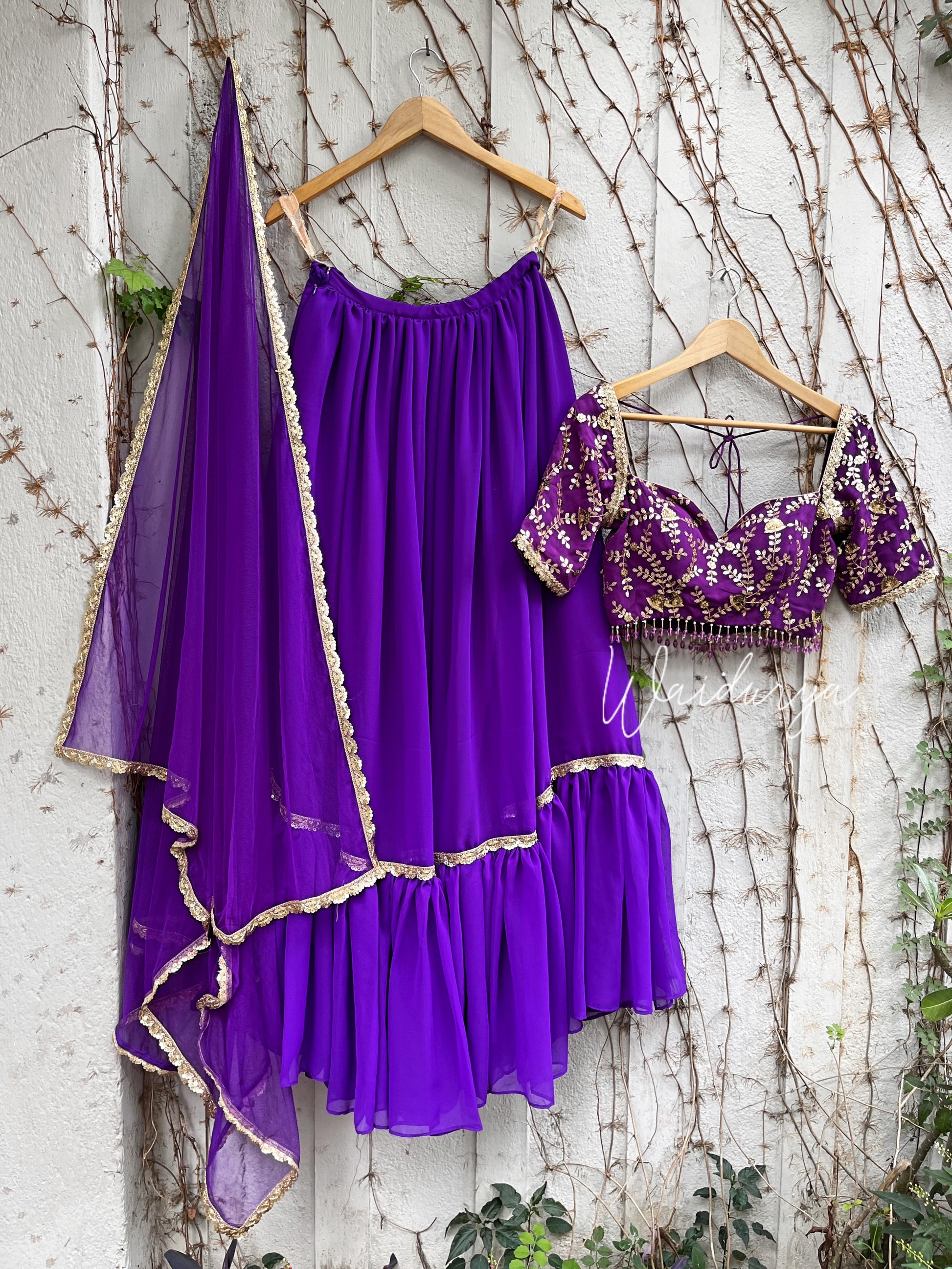 The lehenha is a bright purple georgette with a ruffle design embelished with gold sequin embroidery.