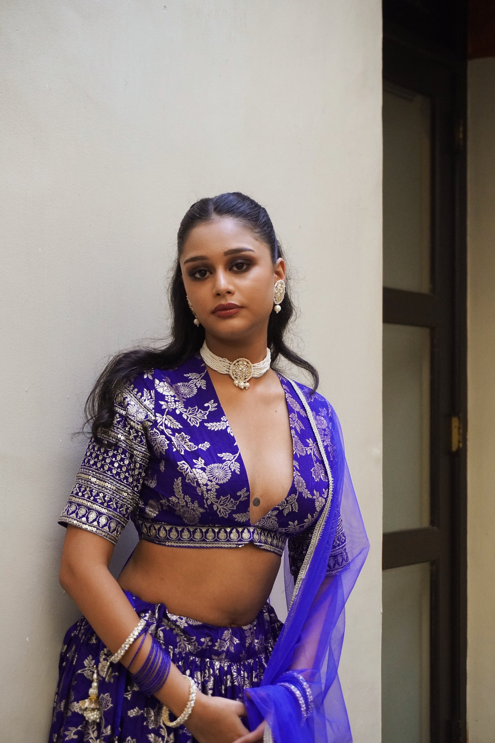 Radhika is grace personified. This pure silk brocade lehenga set is hand dyed to royal blue. The floral design in a metallic thread is absolutely stunning against the blue fabric. This is further adorned with thread and sequin embroidery as a heavy and intricate border detail. The lehenga is completed with matching handmade tassels.