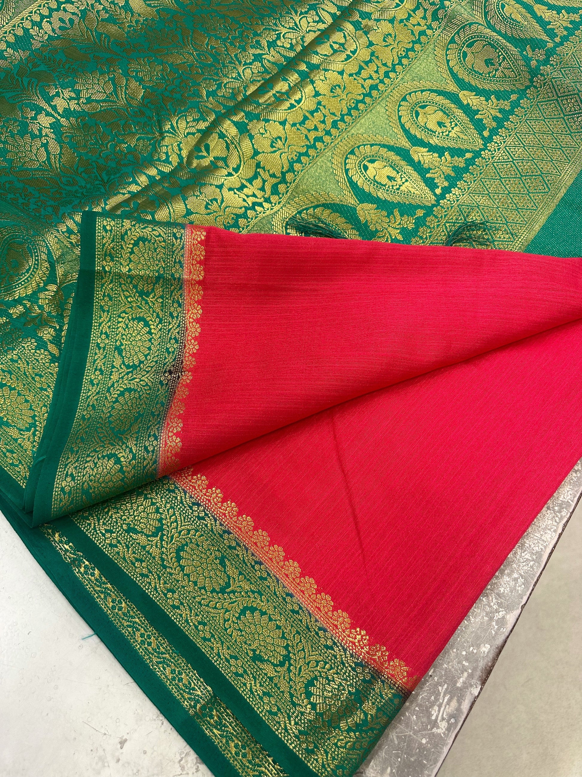 Beautiful pinky red silk sari with a popping green woven border and intricately woven pallu and tassels. Blouse fabric in matching green included.