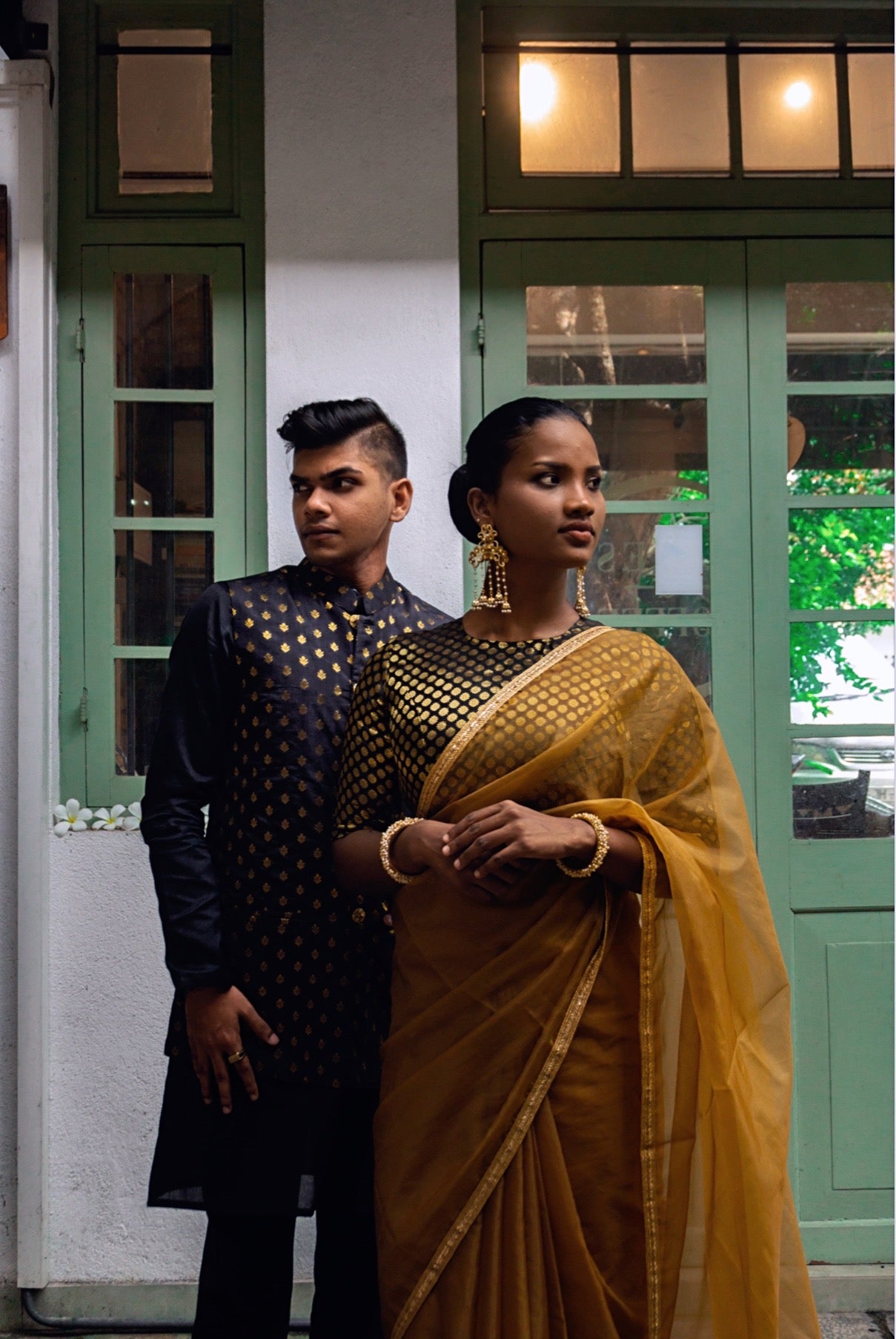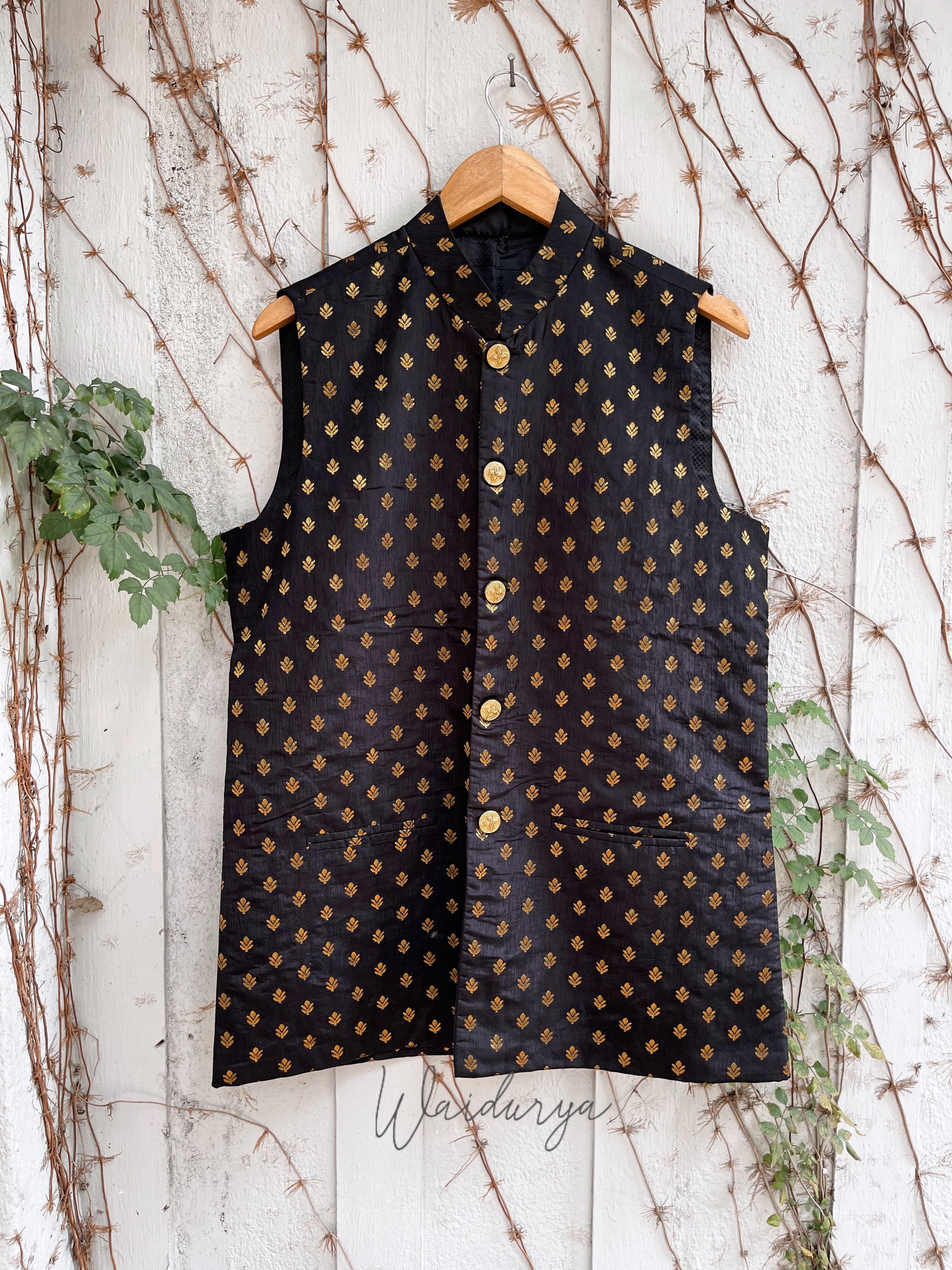 Black and gold silk brocade vest perfectly tailored to your measurements. Traditional gold buttons to complete the look.