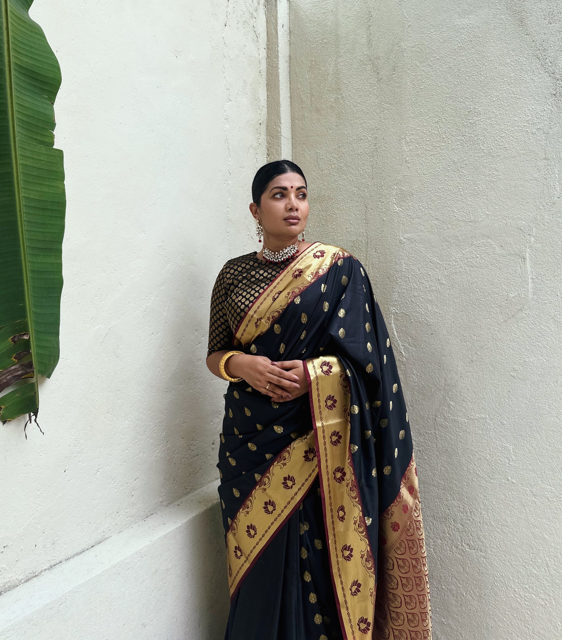 Beautiful black and maroon silk sari with gold motifs and a maroon pallu. Blouse fabric is included with the sari in a plain maroon.
