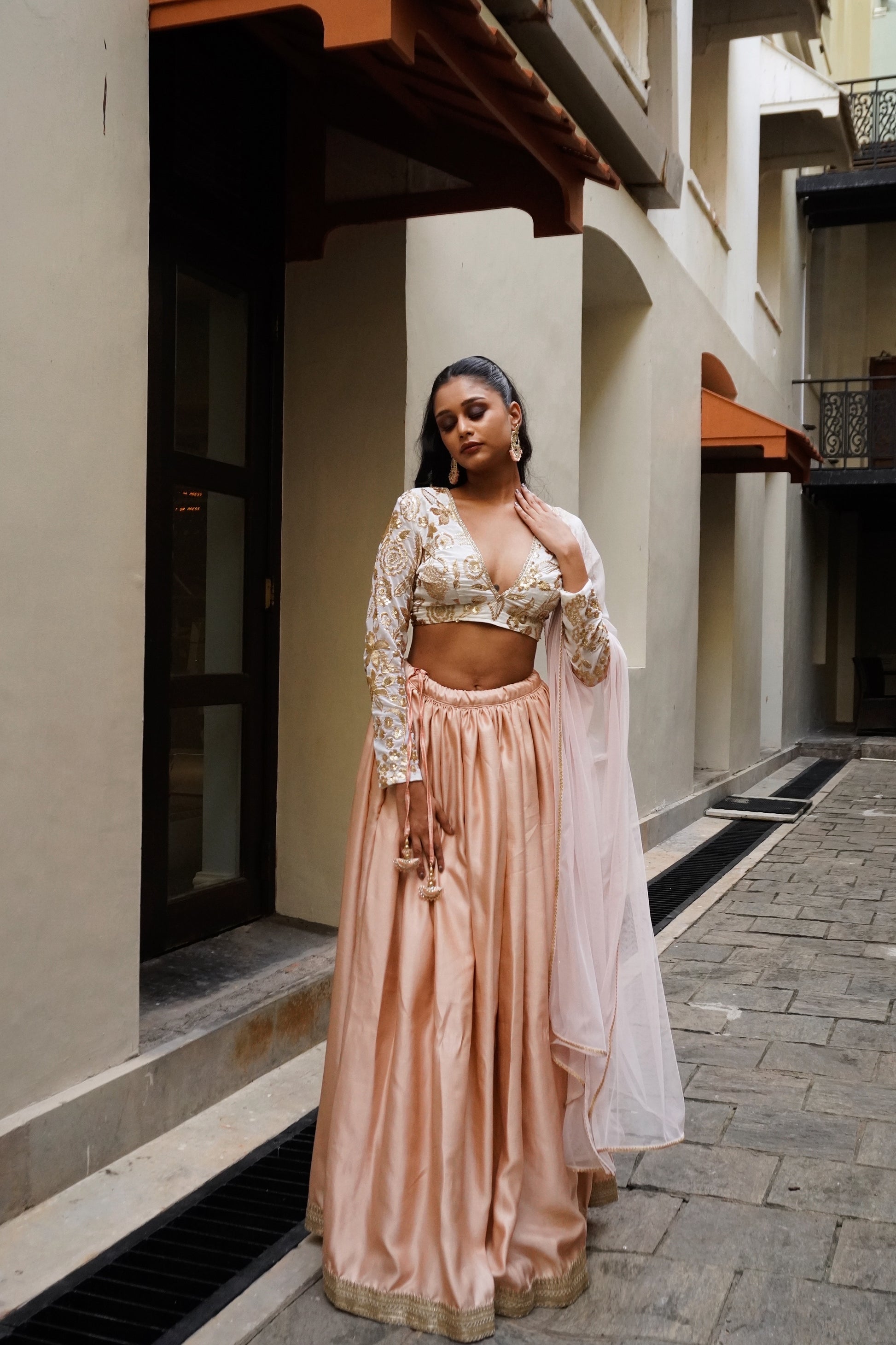 Charming peachy pink lehenga with a gold worked border and a full and voluminous skirt.