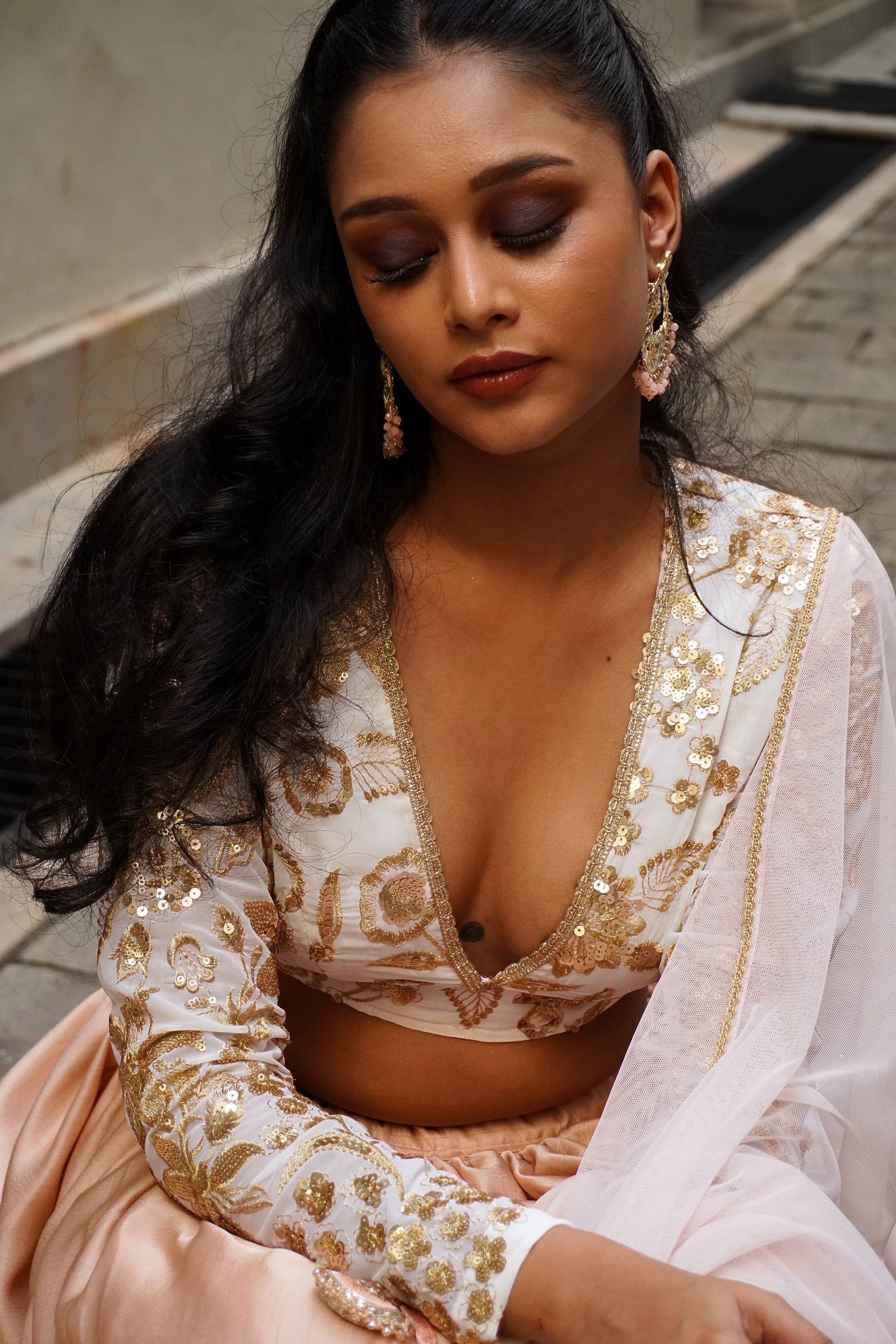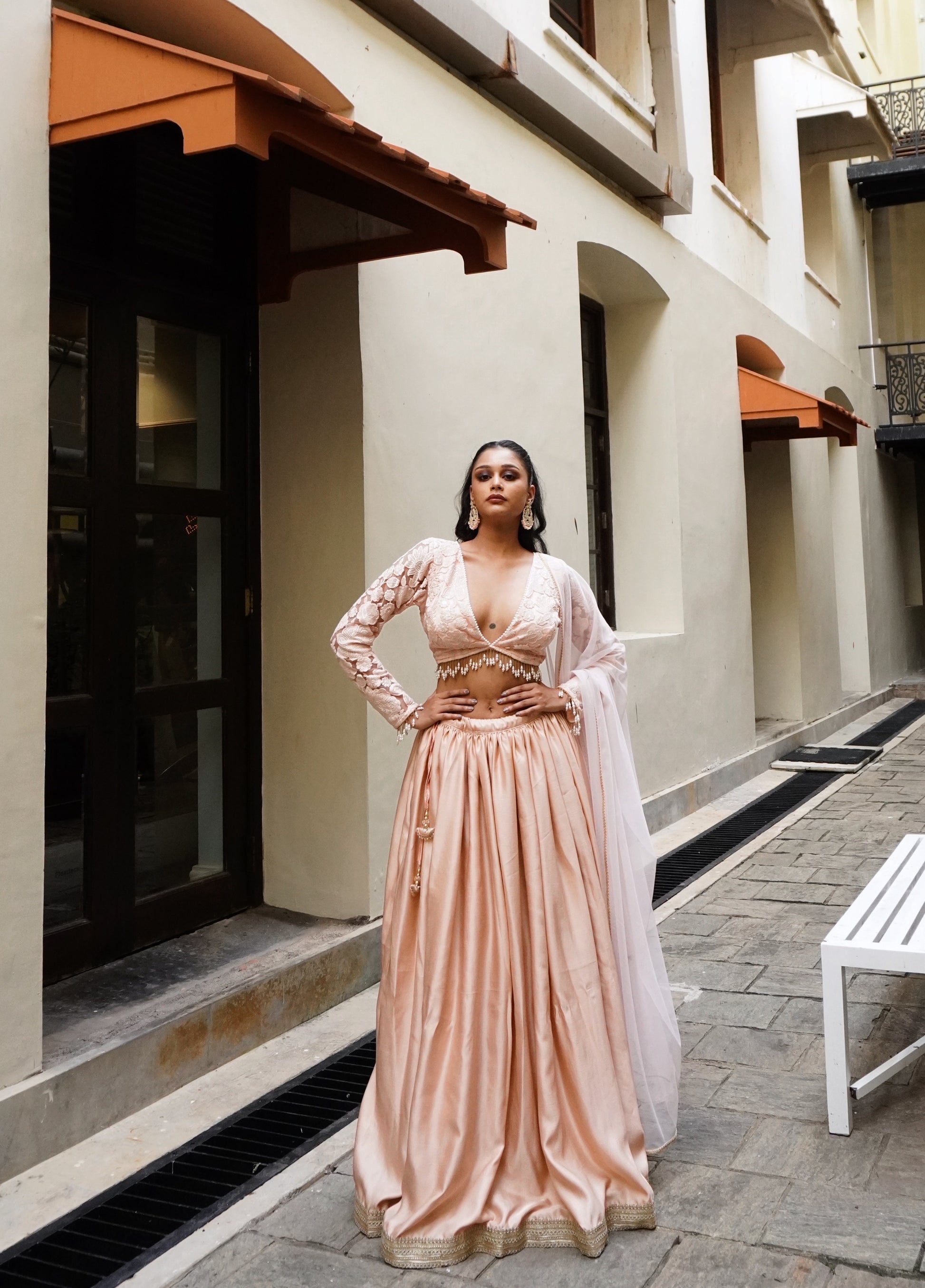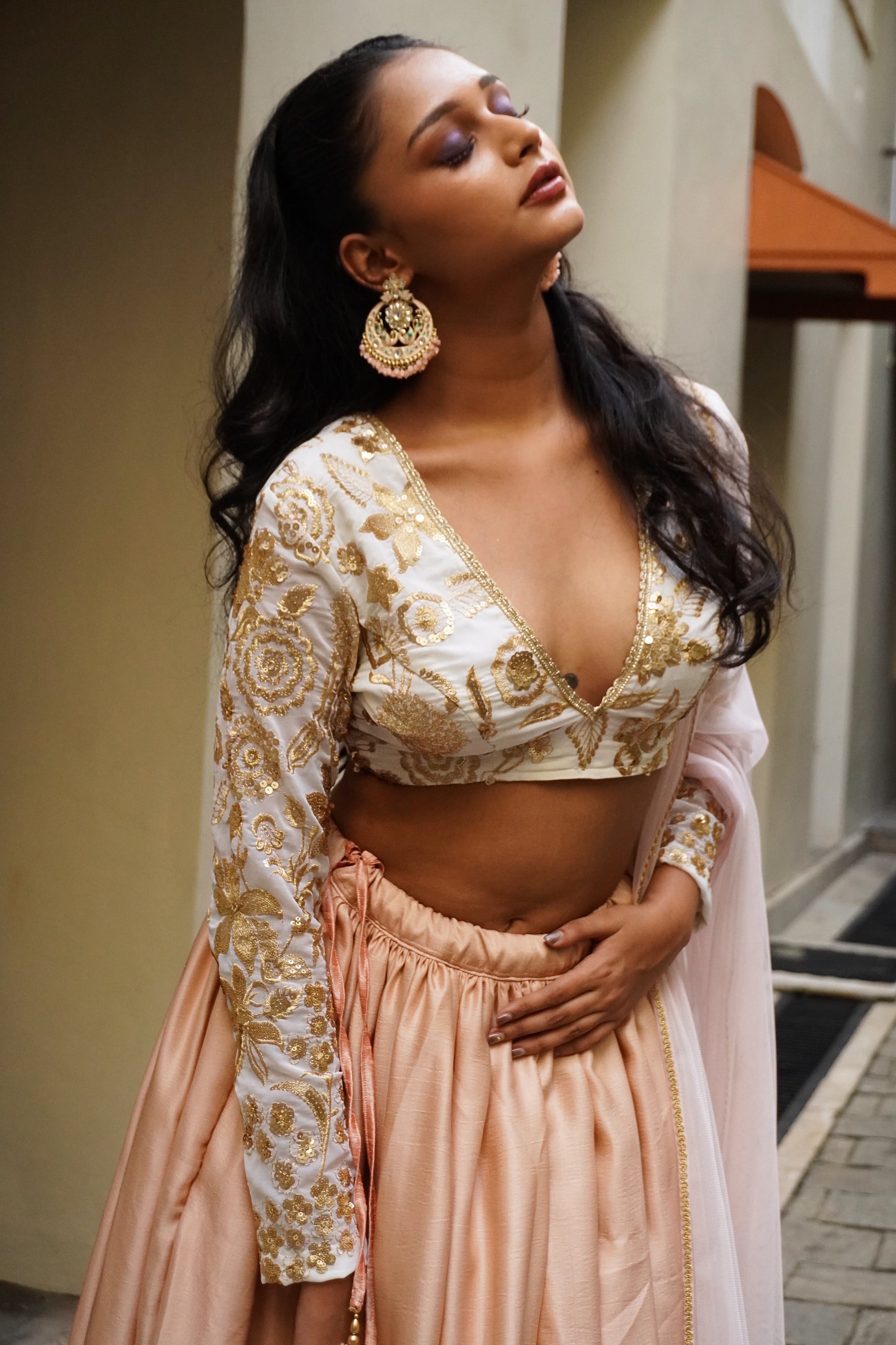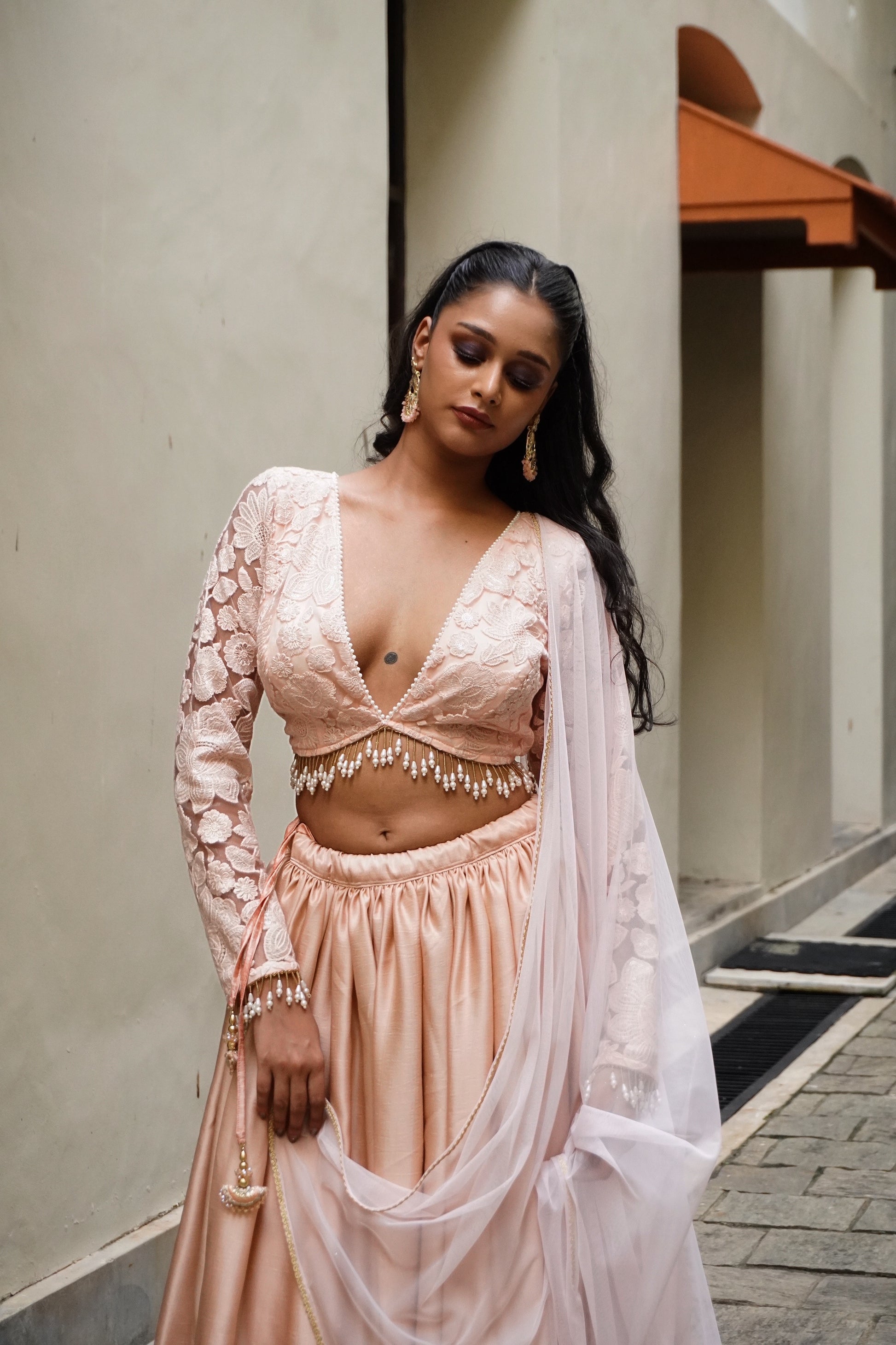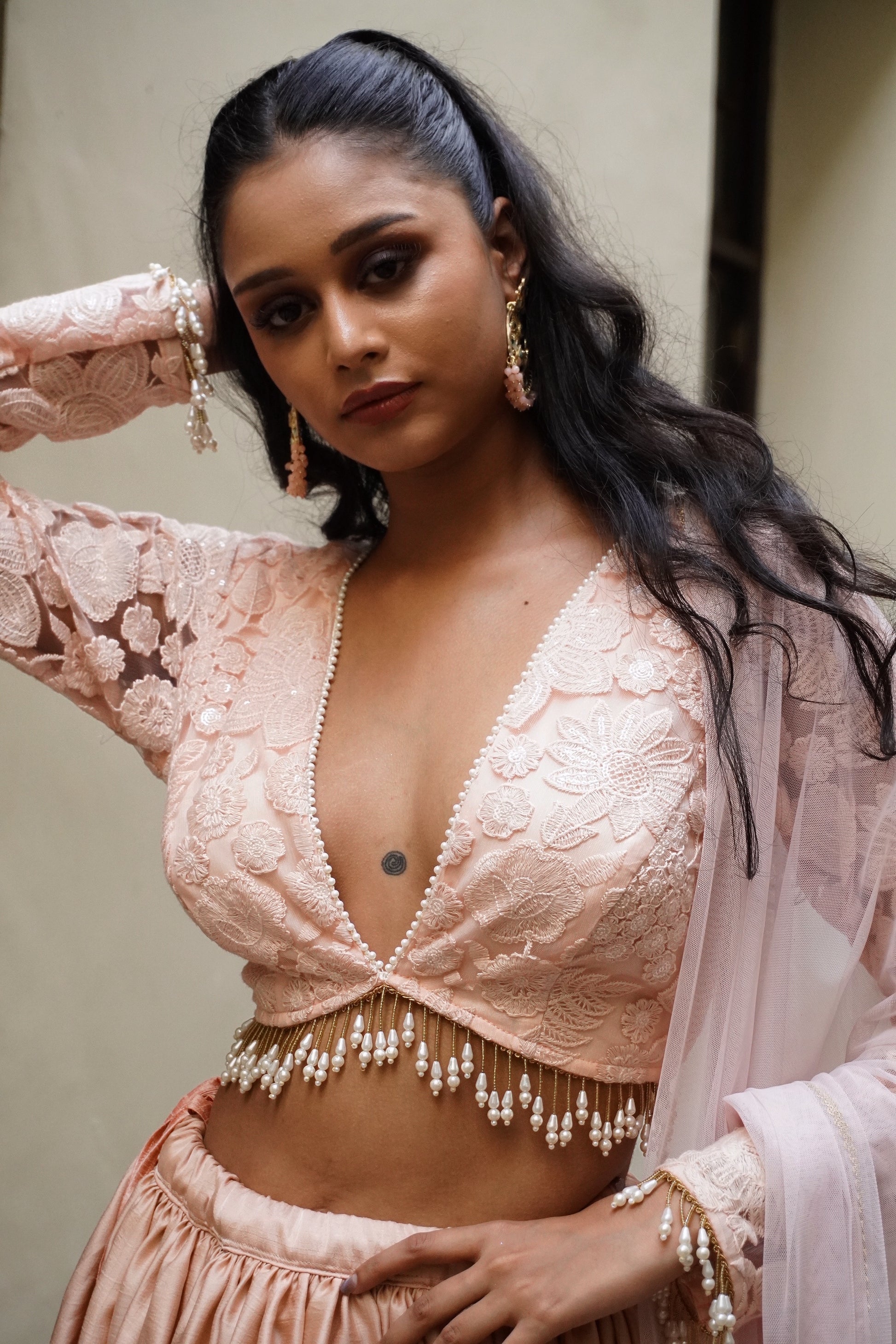 Blouse option two is a matching peachy pink thread embroidered net one with the most delicate beautiful floral design and sequin accents. Handmade pearl tassels complete the look.