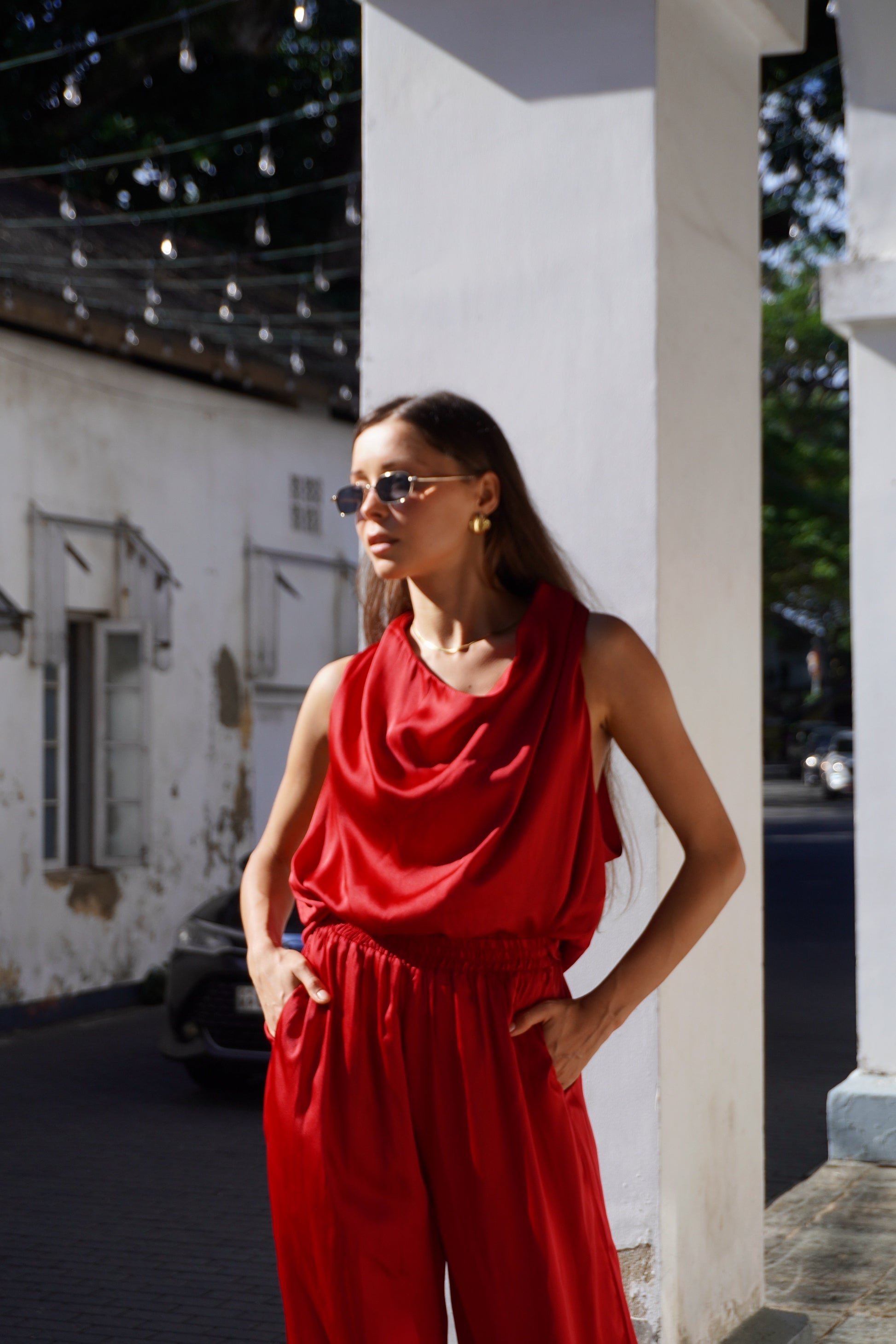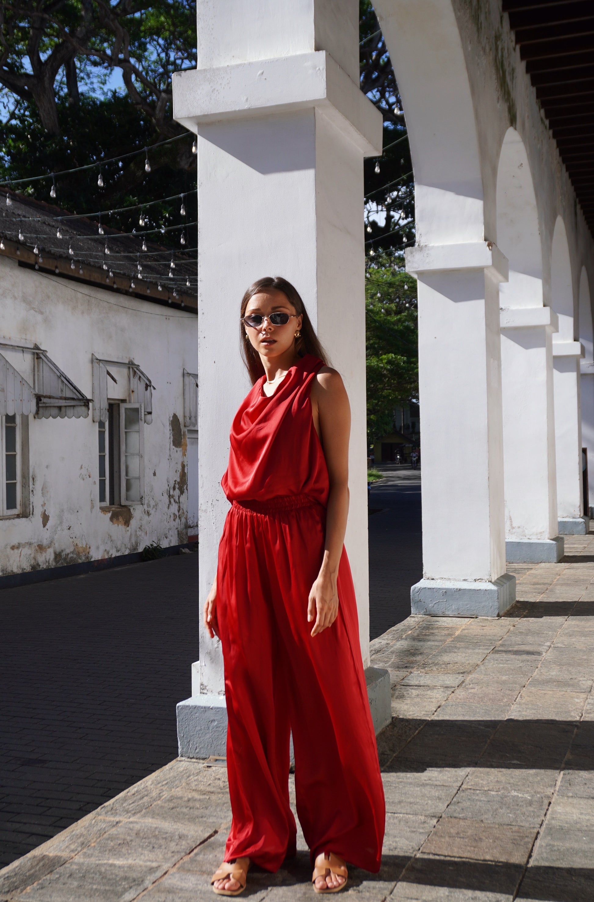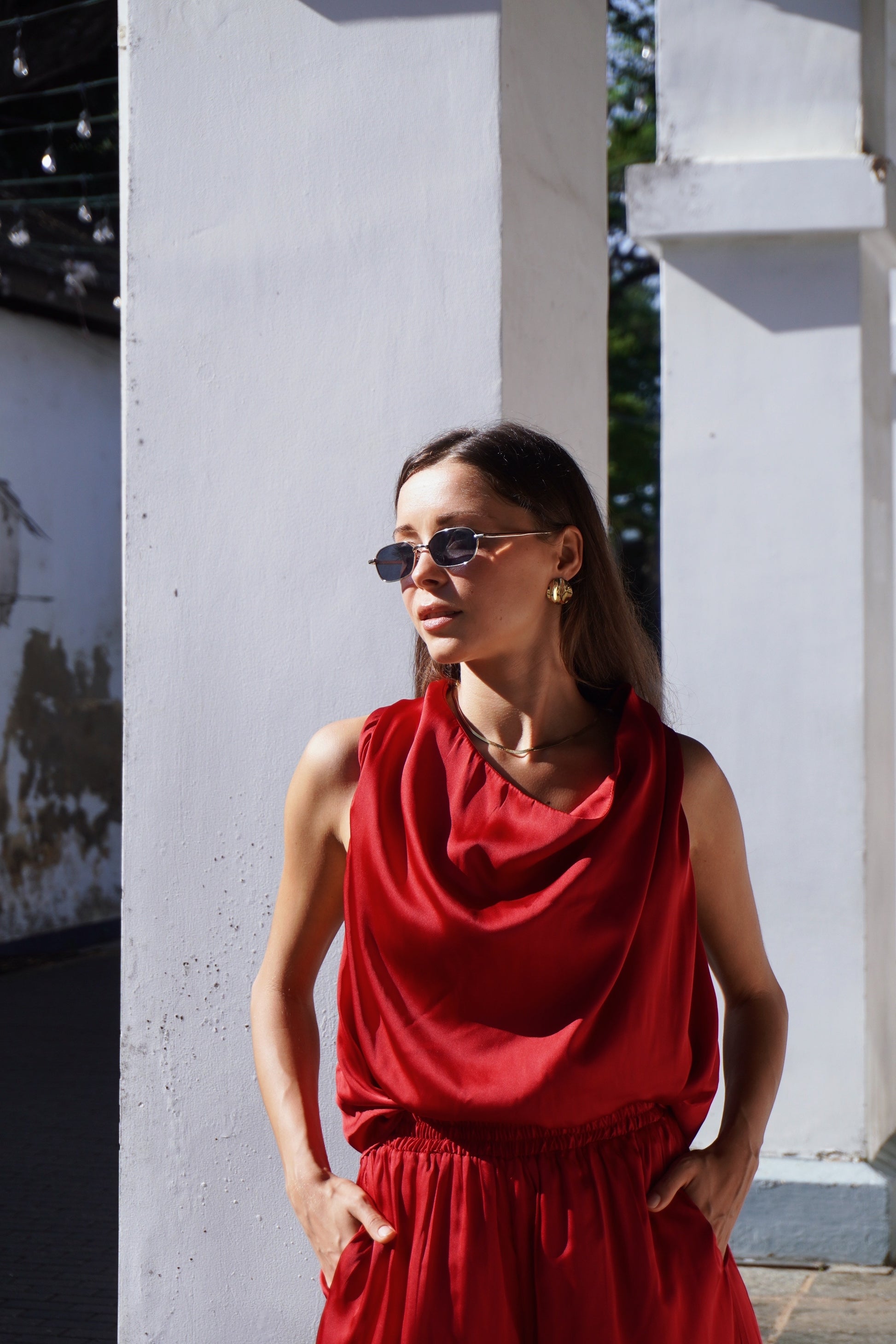 The most feminine island silk set! We love this look for an evening on the beach. It’s the most luxurious rich pinky red hue. The cowl neck blouse with the button detailed flowy back is just so sensual and beautiful to wear.