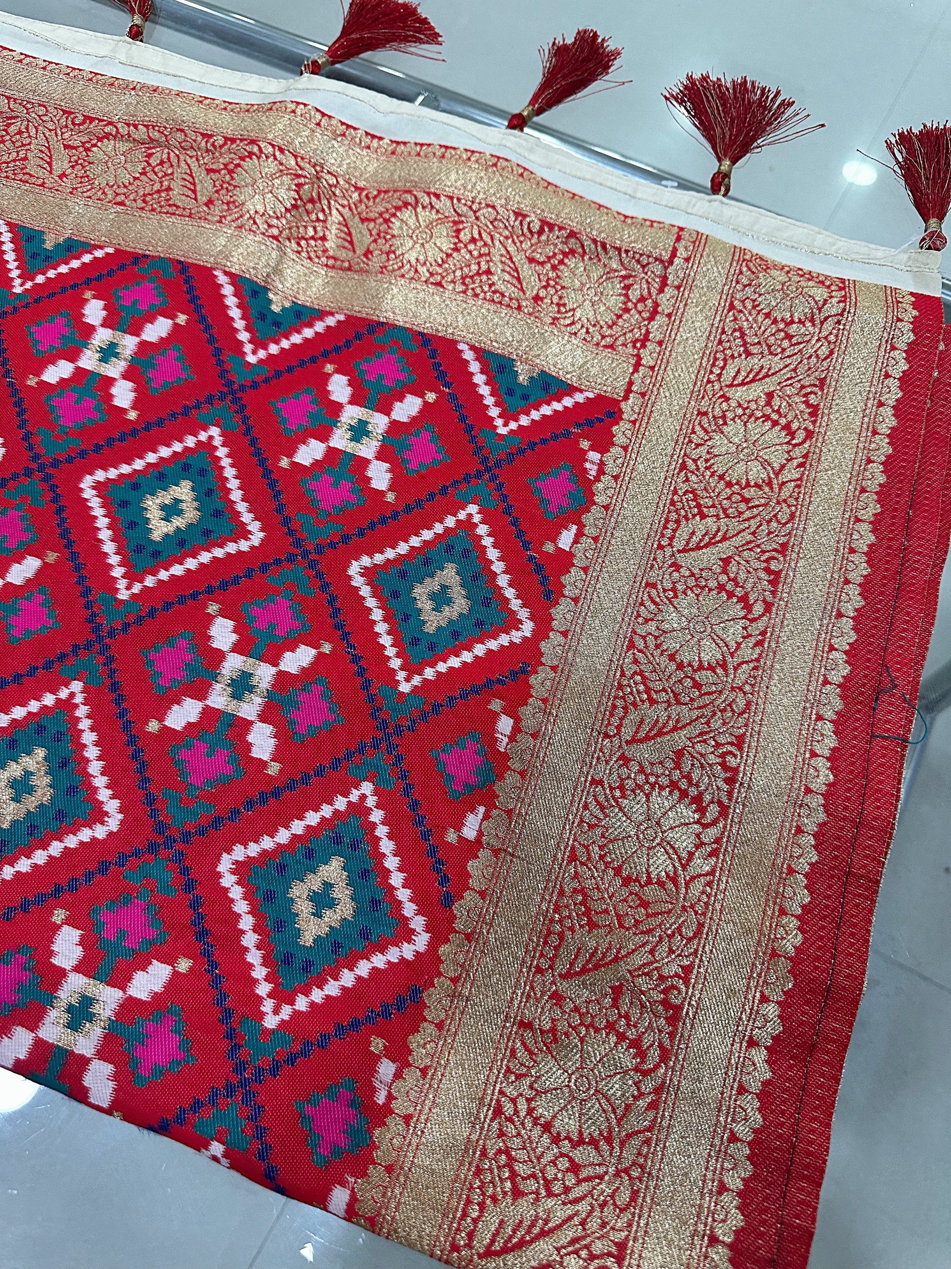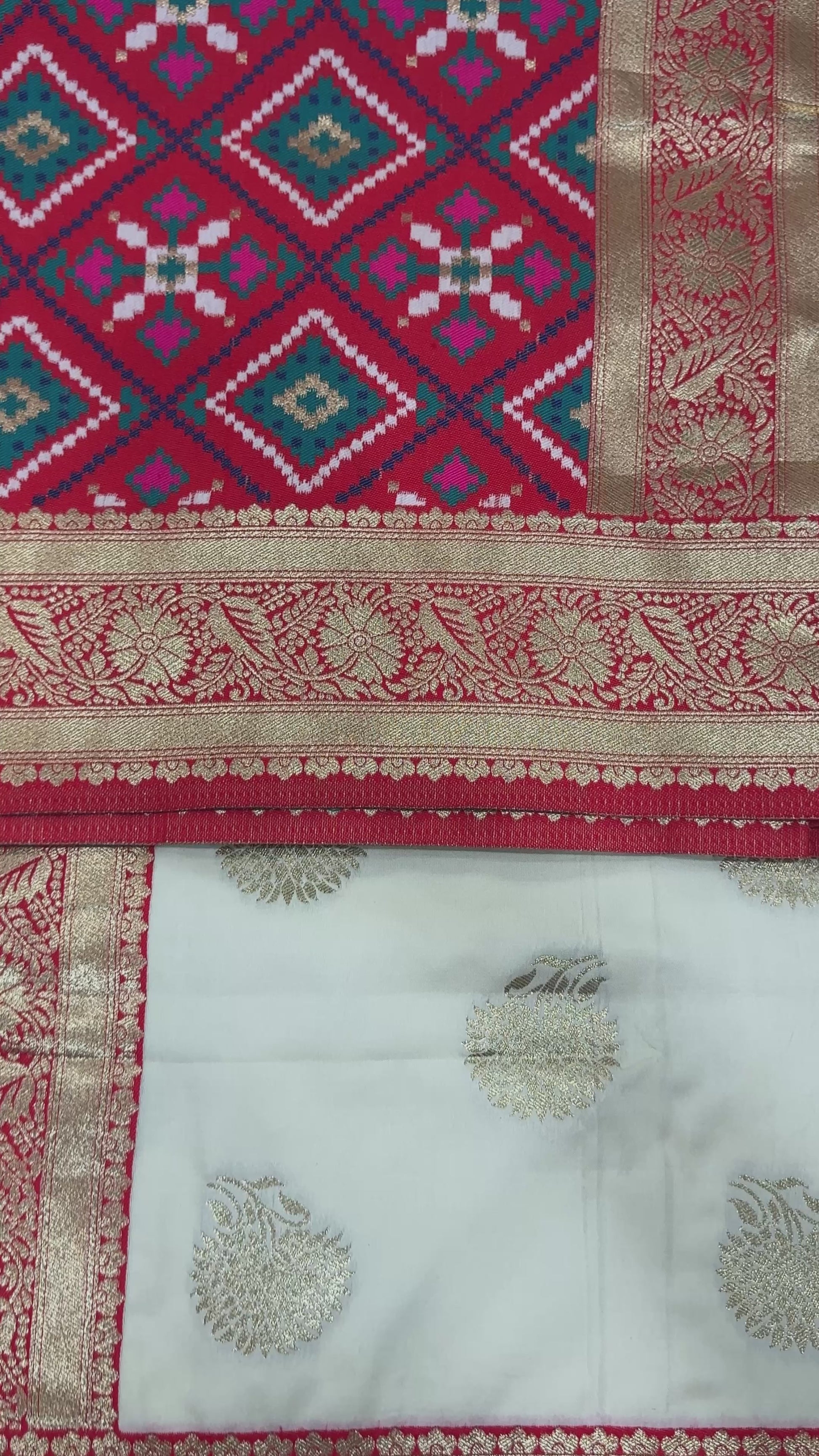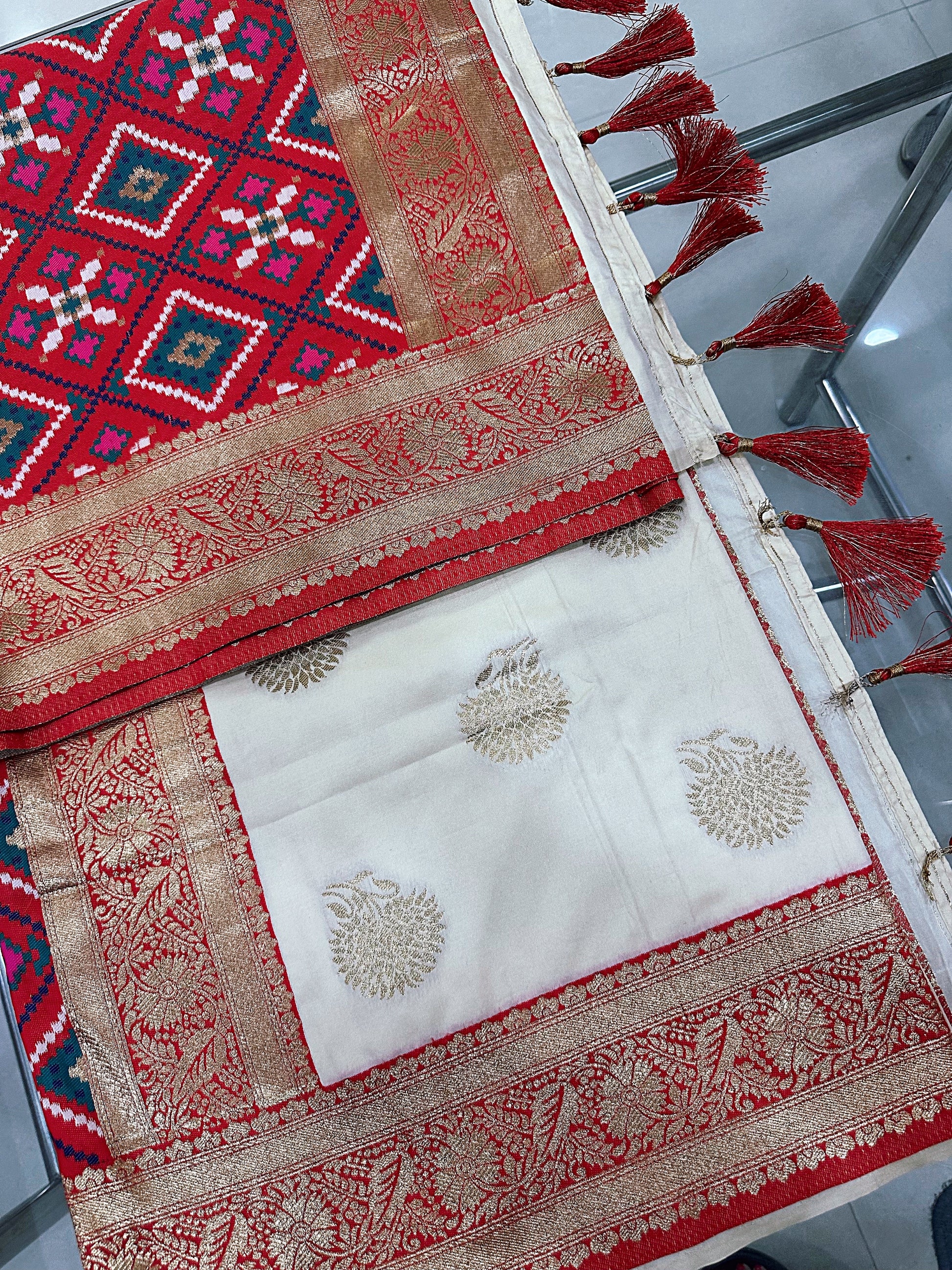 Absolutely stunning woven silk sari in an ivory with gold motifs all over and a popping red mixed pallu in a contrasting design.