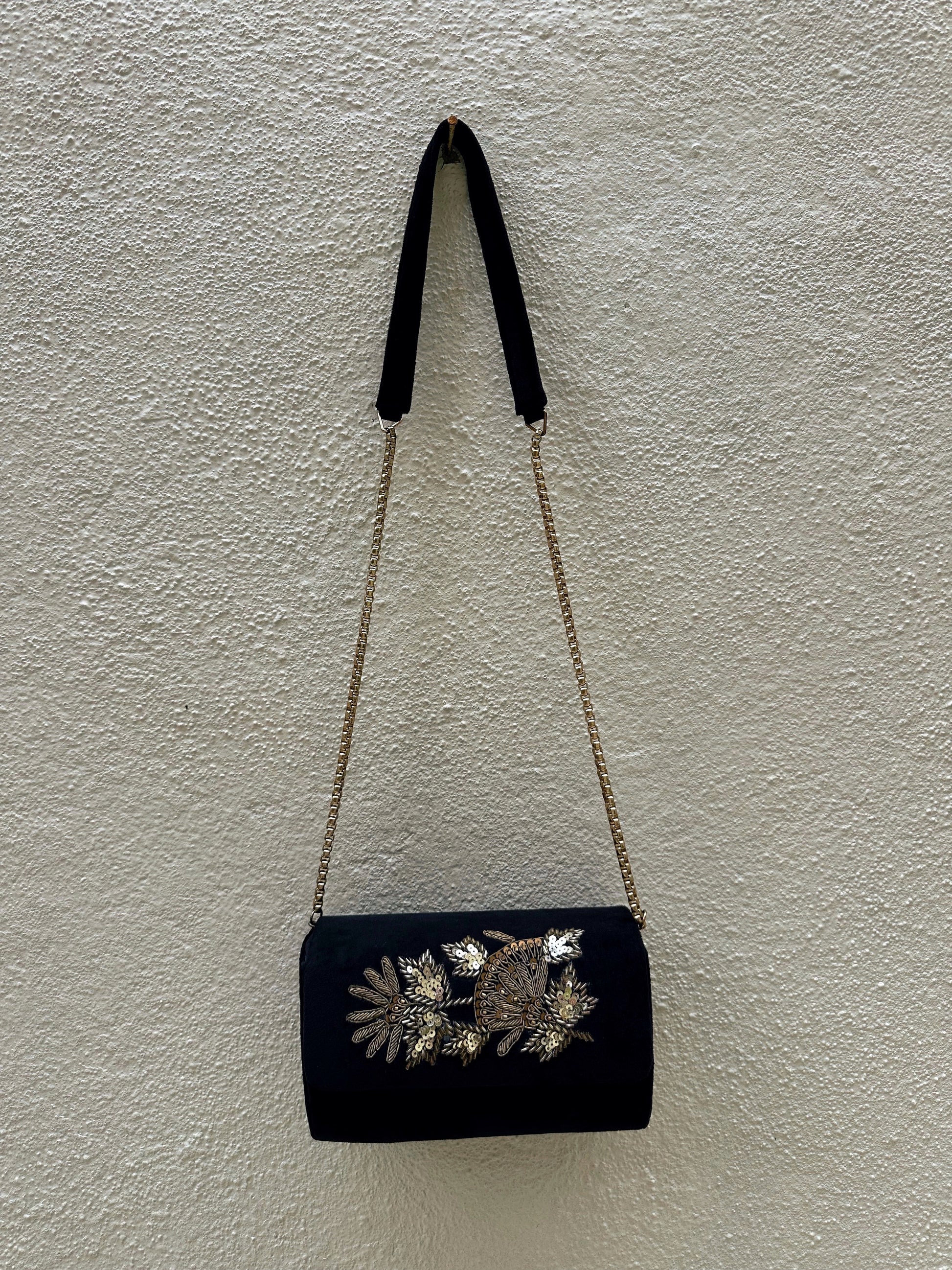 Beautiful velvet box clutch with hand worked zardozi embroidery. Comes with a long strap to carry as a shoulder bag.