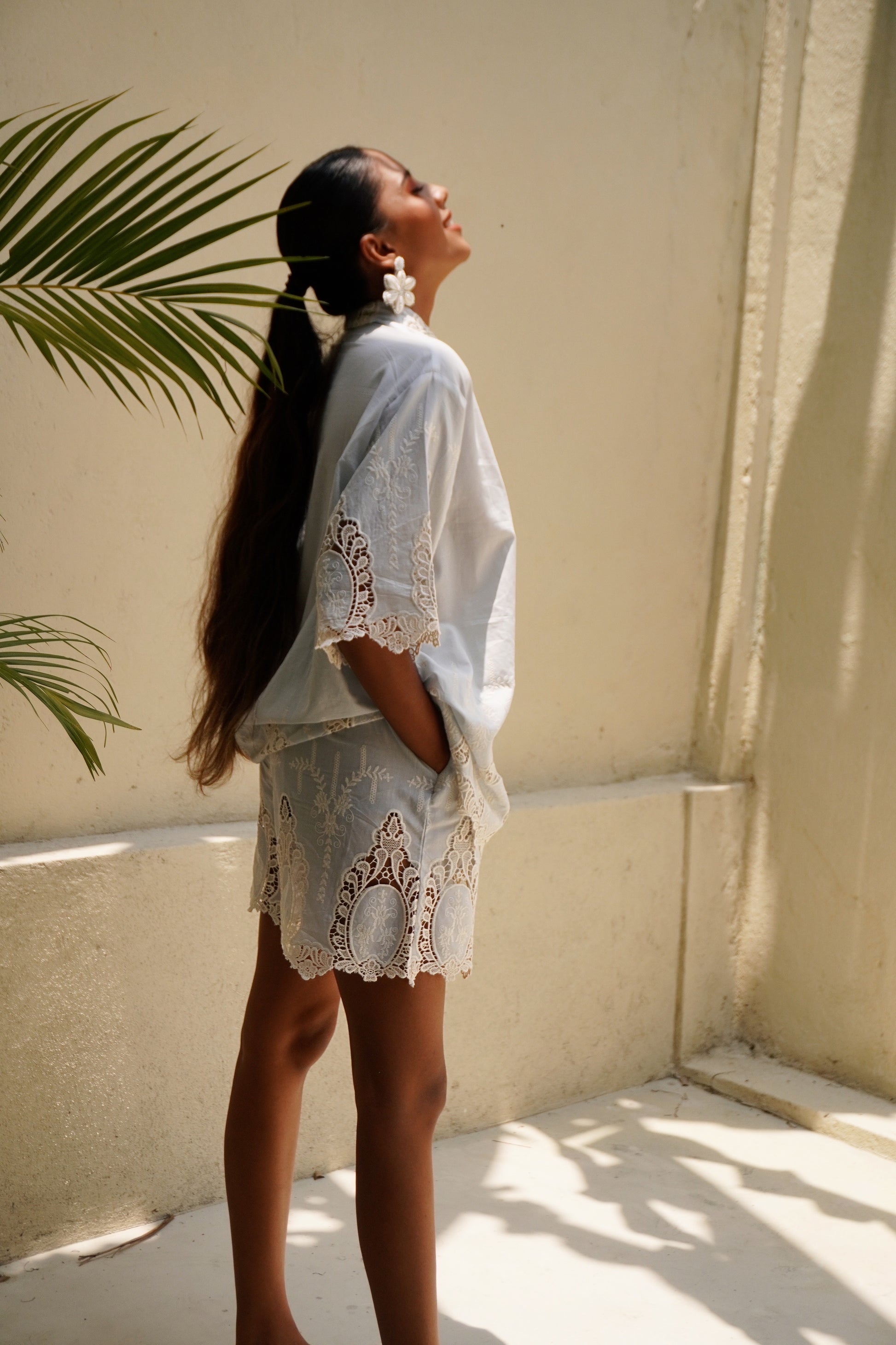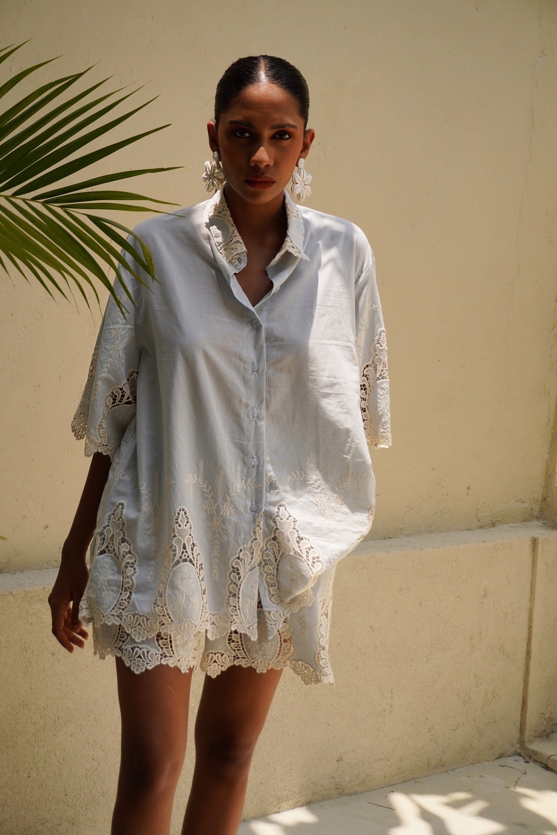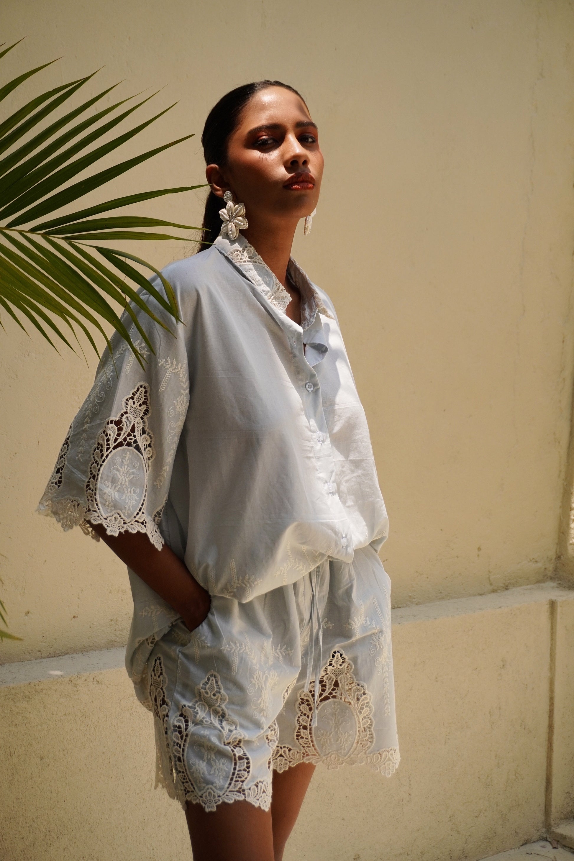 100% cotton pastel blue thread embroidered oversized shirt. This is a fully thread embroidered fabric which is luxurious and detailed. The cut work embroidery of this look is pure perfection and luxury. We love the oversized fit of the shirt and how breathable this fabric is. 100% cotton thread embroidered relaxed fit short.